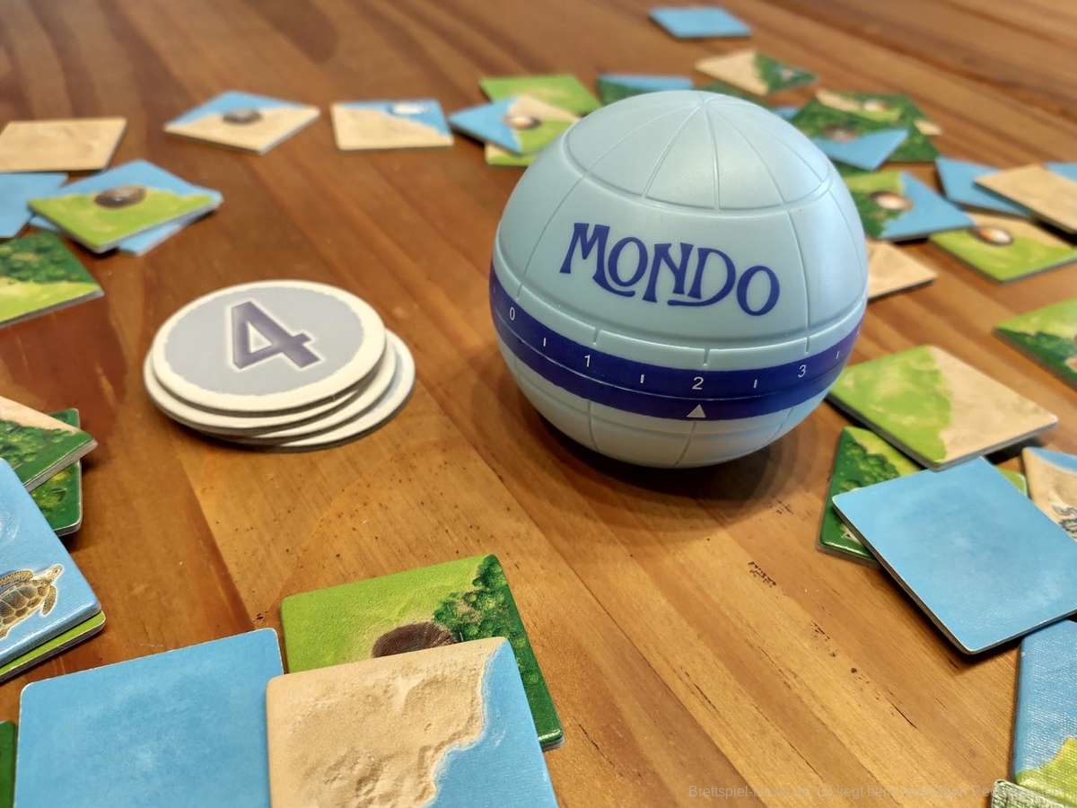 Mondo ist im Kern ein simples Legespiel, welches Anspruch und Tiefe durch den Zeitdruck und die gestellten Aufgaben im Fortgeschrittenen- und Expertenspiel erhält. Der Spaß am hektischen Treiben auf dem Tisch steht eindeutig im Vordergrund. Jeder greift gleichzeitig nach den begehrtesten Plättchen oder dreht Plättchen in der Hoffnung auf das fehlende Puzzleteil auf dem eigenen Tableau. Attraktive Plättchen, die wir nicht sofort platzieren können, legen wir gern in der Nähe unseres Tableaus ab, genauso können uns diese aber auch wieder weggeschnappt werden. Beim Aus- und Anlegen gibt es zudem einige spannende Entscheidungen in der Hitze des Legegefechts zu treffen, denn belohnt wird, wer am Ende die meisten abgeschlossenen Flächen, die meisten sichtbaren Tiere und die wenigsten Legefehler gemacht hat. Die Zusatzwertungsplättchen belohnen zudem diejenigen, die die meisten Wassertiere ergattern oder den größten Dschungel bauen konnten. Wer die meisten aktiven Vulkane ausgelegt hat, bekommt zudem die Gesamtzahl seiner aktiven Vulkane als Minuspunkte abgezogen. Eine nette Idee hierbei: Wer den ersten Durchgang mit den meisten Punkten abschließt, erhält für den nächsten Durchgang ein Handicap, welches vorsieht alle nicht aktiven Vulkane ebenfalls als aktive Vulkane zu werten.