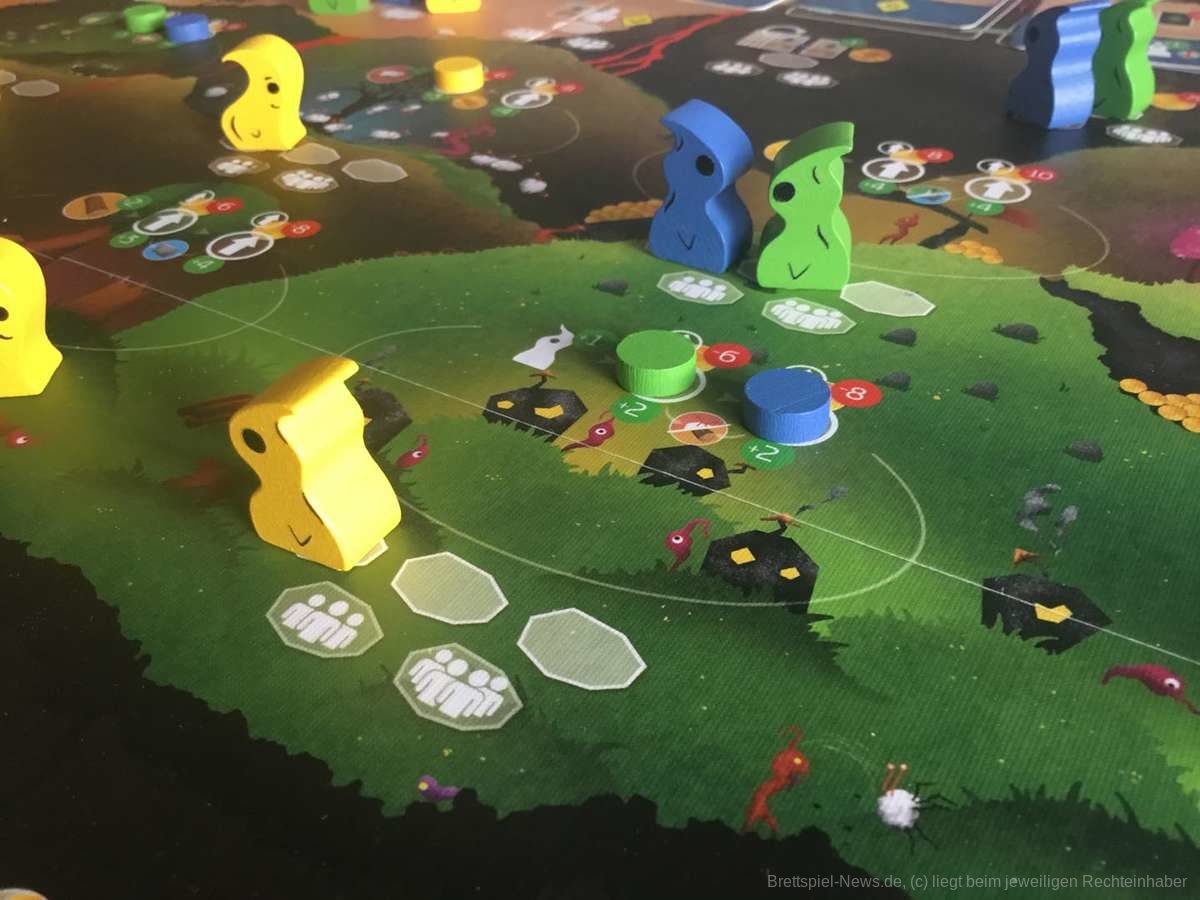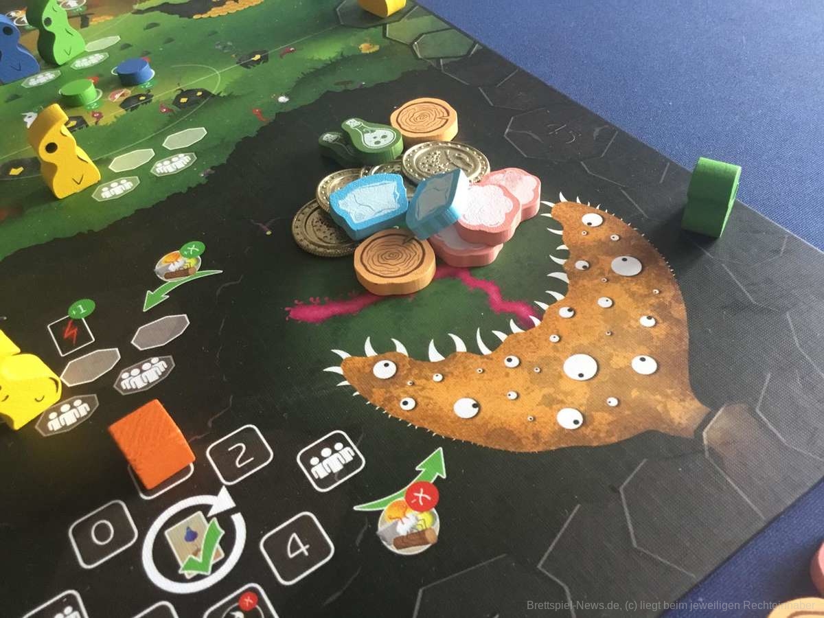 Ein echtes Ärgernis sind sie zahlreichen Symbole, die leider immer wieder für fragende Blicke sorgen. Manchmal kann sprachneutrales Spielmaterial mehr Probleme verursachen, als es lösen soll. Laufend müssen die Spielerinnen und Spieler ihre Nasen in die Anleitung stecken. Dann wird vergessen, dass Kosten in eckigen Kästen Opfergaben sind und zu Buka müssen. Schließlich ist es für alle am Tisch nur bei bester Ausleuchtung und mit scharfen Augen möglich die winzigen Symbole auf dem Spielplan zu erkennen. Die Einsetzfelder sind unnötig klein. Statt deutlicher farblicher Abgrenzung, kommt es auf kleine Darstellungen im Hintergrund an. Das alles führt zu überflüssigem Frust.