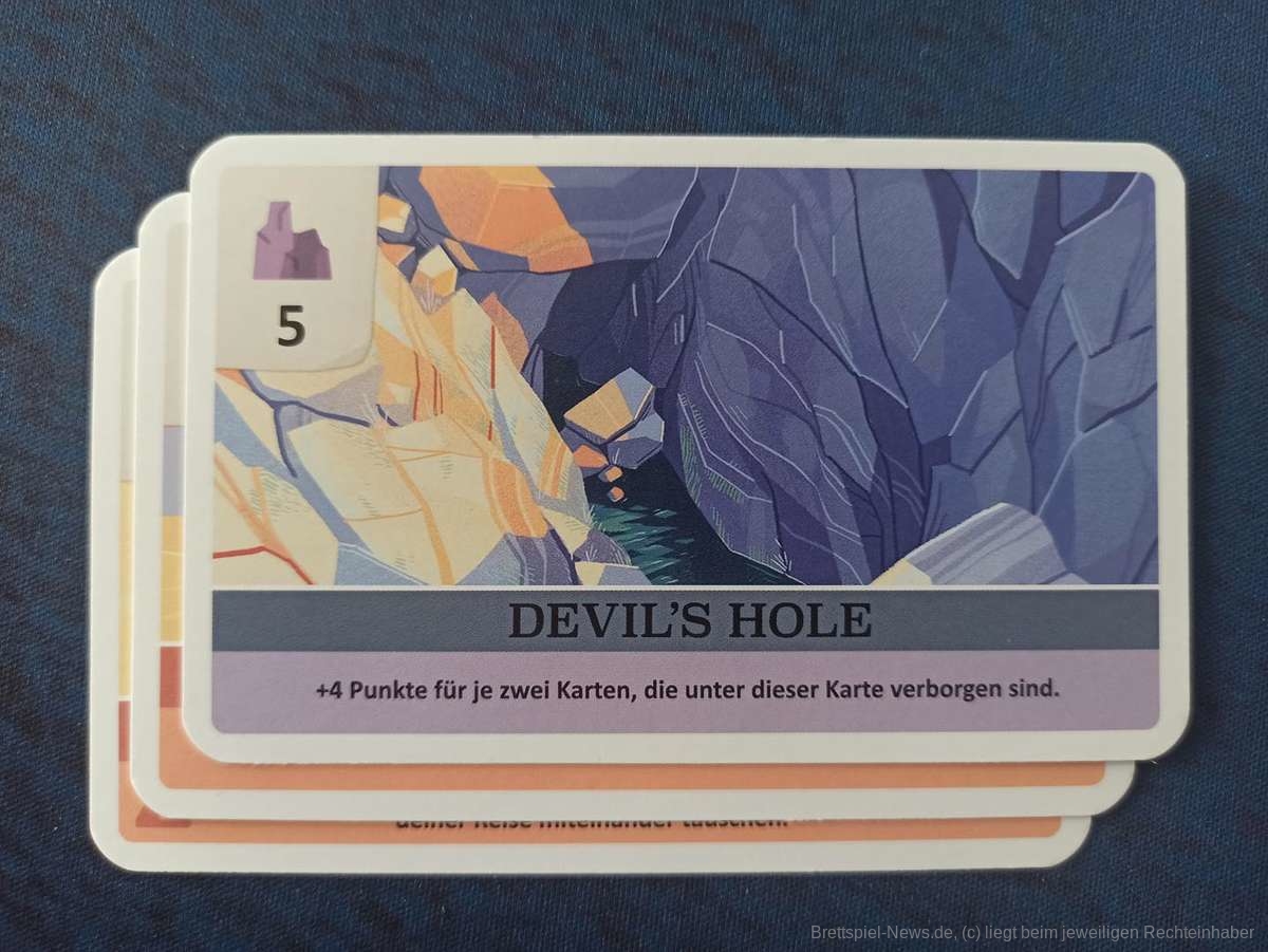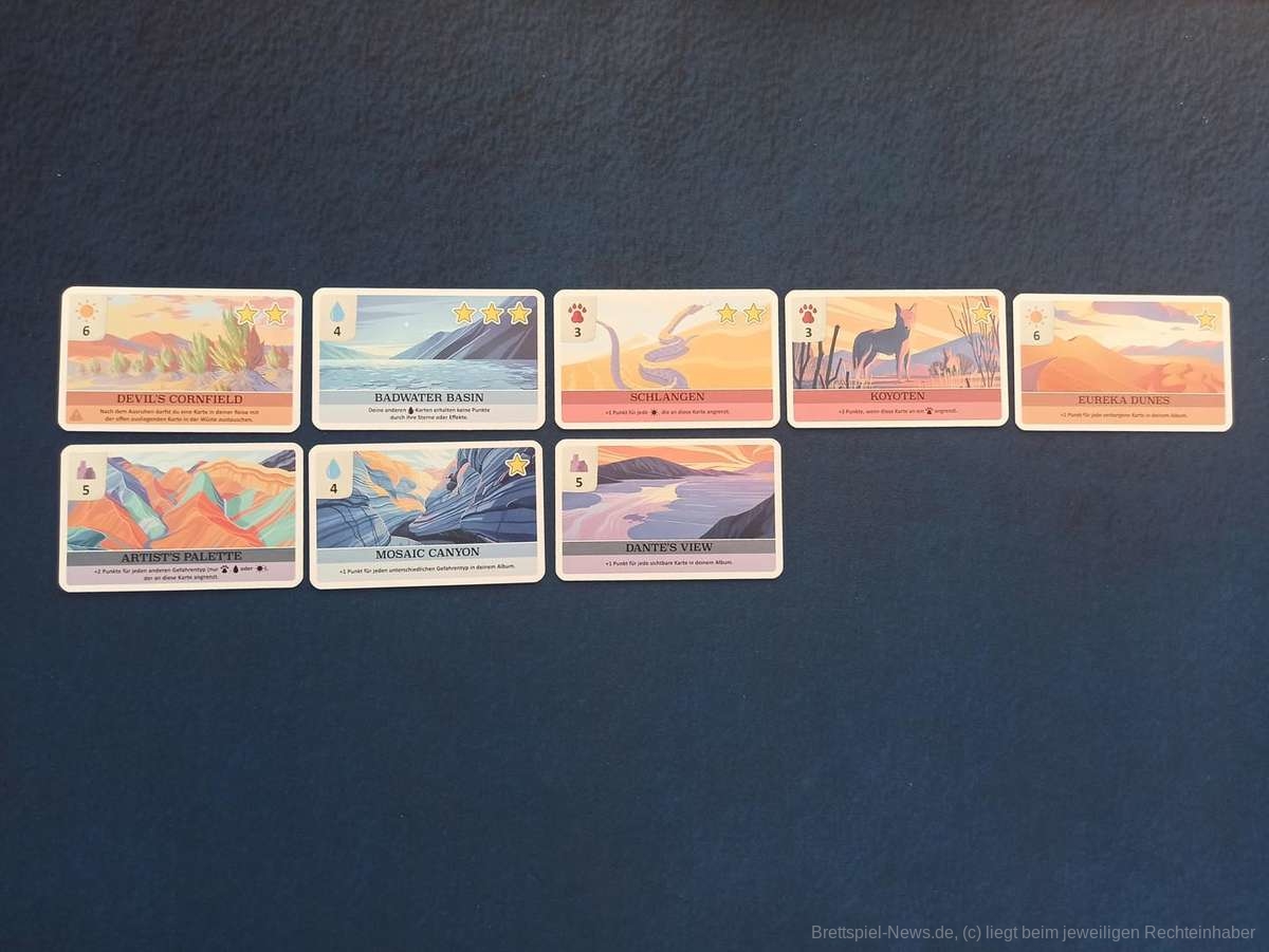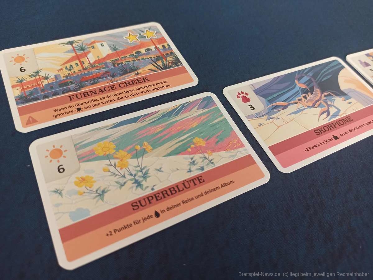 „Death Valley“ bietet auch eine Variante, bei der es die Option gibt, die offen ausliegende Karte statt in den eigenen, in den gegnerischen Spielbereich zu spielen, wodurch ebenfalls ein Abbruch der Reise ausgelöst werden kann. Dies macht das Spiel zwar noch weniger planbar, ist aber deutlich interaktiver und hat uns besser gefallen.