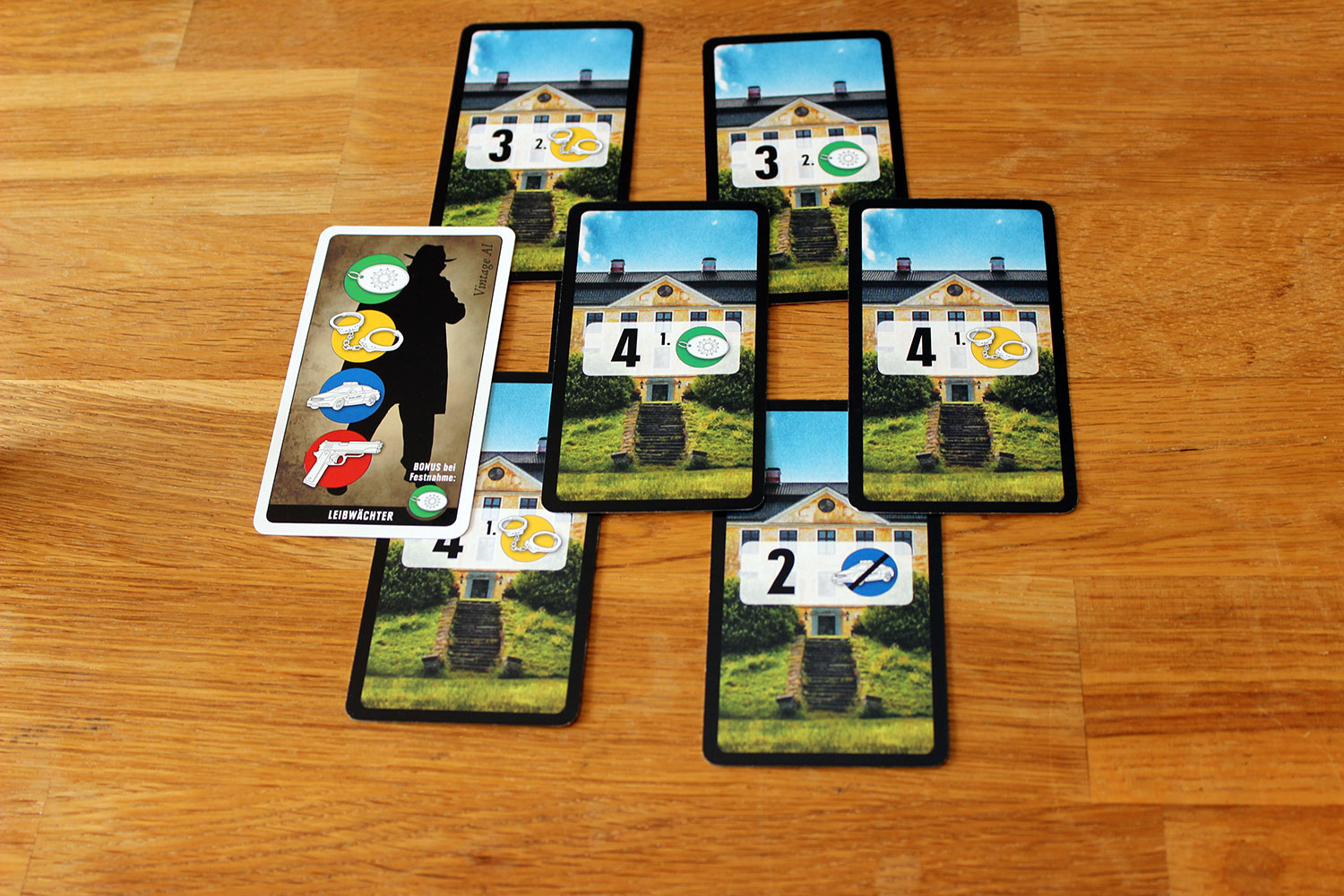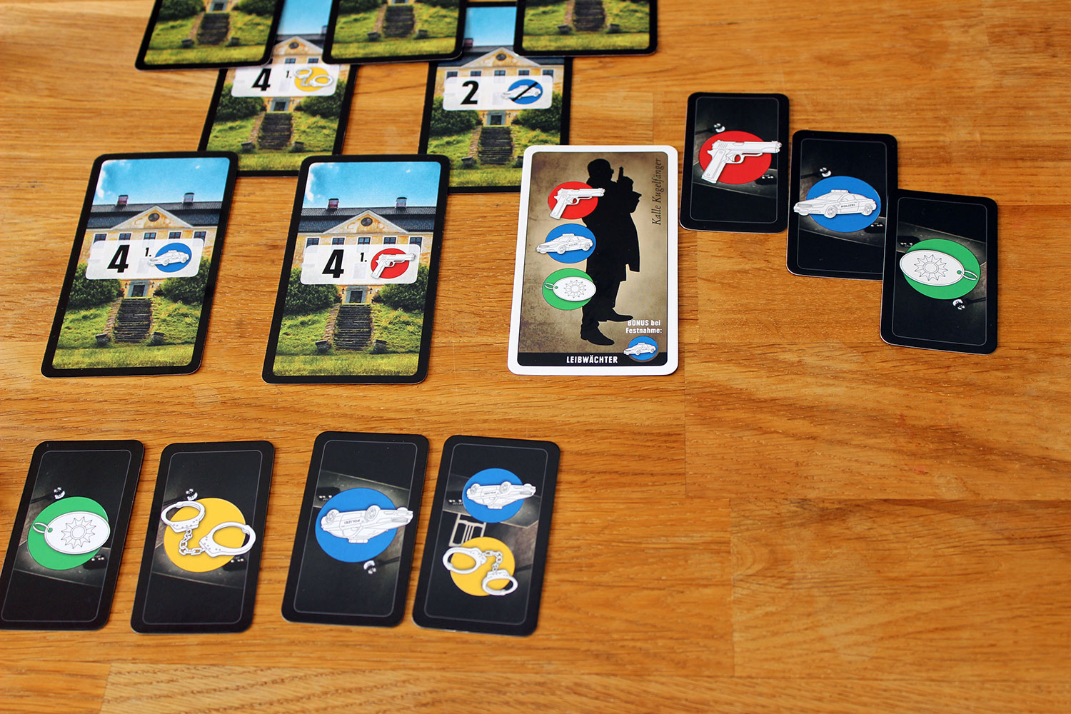 Auf den Leibwächterkarten ist nun sichtbar welche Karten in welcher Reihenfolge notwendig sind um den Leibwächter festzunehmen. Jeder Spieler, beginnend mit dem Einsatzleiter, führt dann folgendes aus.