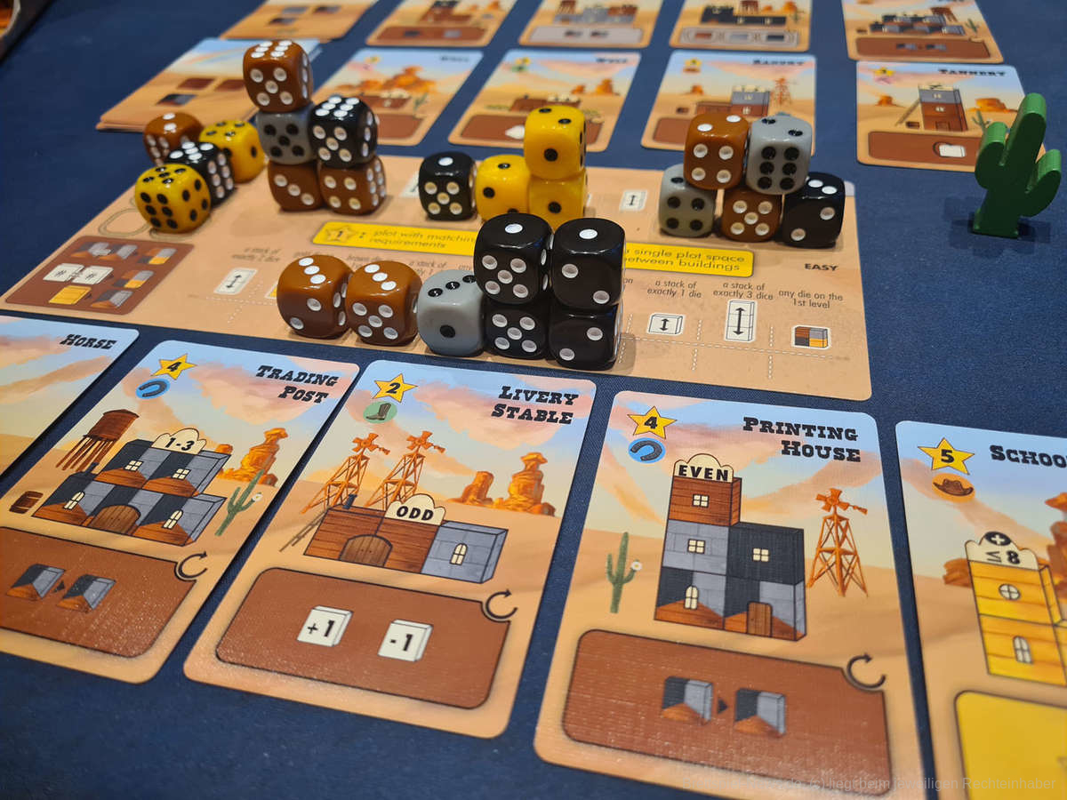 Einer der Konfliktpunkte des Spiels ist aber die Spieldauer. Anders als sonst geht ″Tumble Town“ nämlich nicht zu lang, sondern ist viel zu oft zu kurz. Dadurch, dass sich der Würfelpool mit der Personenanzahl reduziert, endet das Spiel meist sehr schnell und ist nach ca. 30-45 Minuten vorbei, wobei die eigene Stadt gerade erst in Schwung gekommen ist. Besonders bei zwei oder drei Personen eignet es sich ganz gut, einfach alle Würfel des Spiels zu nutzen. Dadurch ist das Spiel nicht zu schnell zu Ende und kann sich gut entfalten. Bei 4 Personen bleibt das „Problem“ aber bestehen und könnte nur durch das Hinzufügen von anderen Würfeln gelöst werden. Ob das aber wirklich jede Spielgruppe als tatsächliches Problem ansieht, müssen alle mit sich selbst ausmachen.