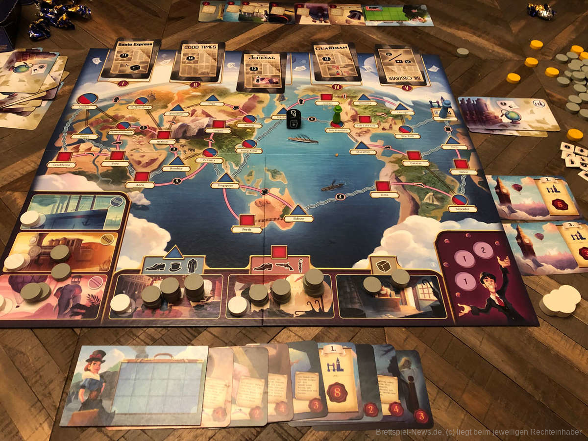 “80 Days“ hat mich direkt mehrfach angesprochen. Ein ansprechendes Cover, schön gestaltetes Spielmaterial und eines meiner Lieblingsthemen - Reisen. Das Spiel könnte Potenzial haben. Die Spielvorbereitung ging auch recht schnell, dank einer guten Übersicht in der gut verständlichen Anleitung, die in deutscher und französischer Sprache verfasst wurde. Anfangs waren wir auch noch gespannt auf den Spielverlauf und welche versprochenen Abenteuer das Spiel für uns in Petto haben würde. Schnell merkten wir aber, dass die Spielmechaniken doch recht einseitig waren.