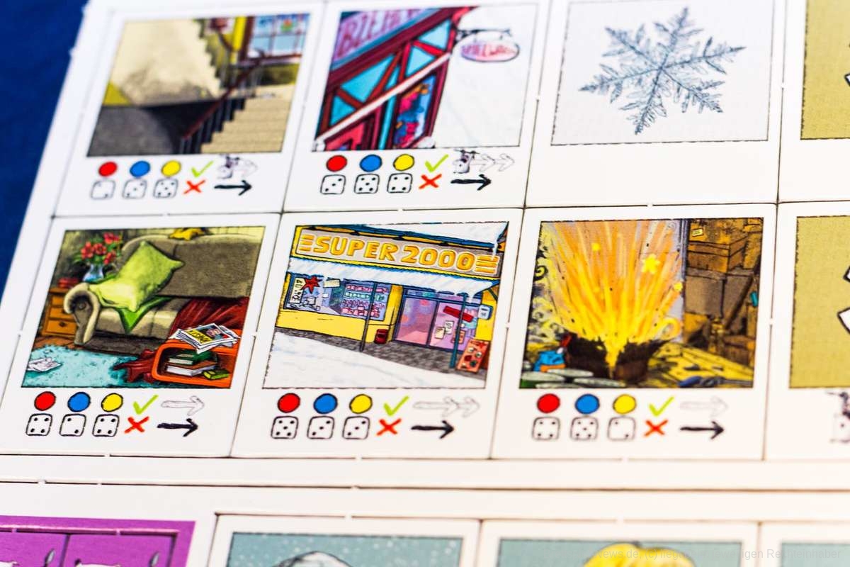 Zudem wirken die Aufgaben oder Würfelproben auf den Plättchen sehr willkürlich. Es ist für mitspielende Kinder schwer nachvollziehbar, warum die gelbe Figur auf dem Iglu-Plättchen eine drei benötigt, die blaue Figur jedoch eine fünf.