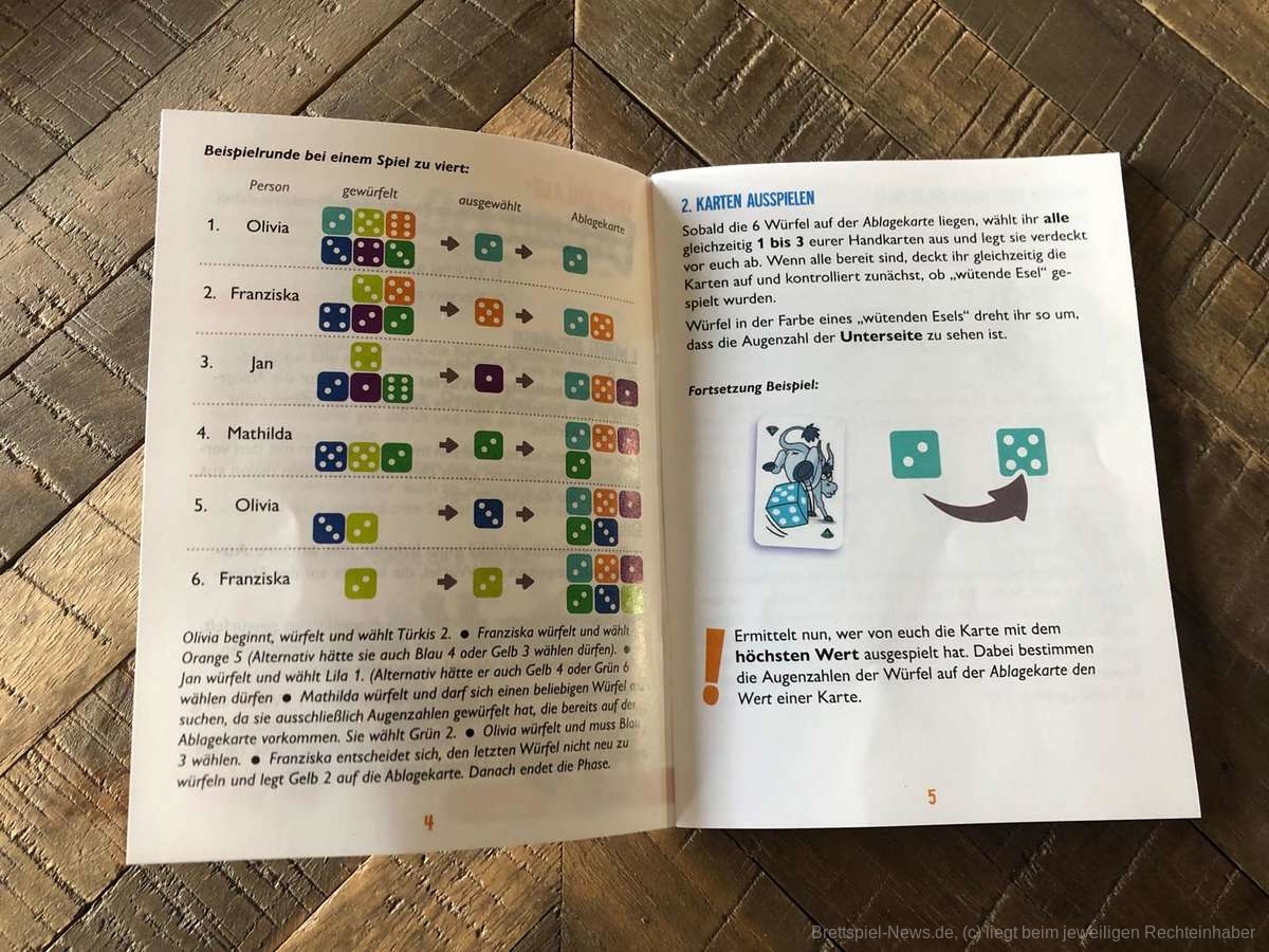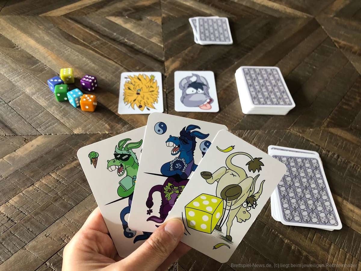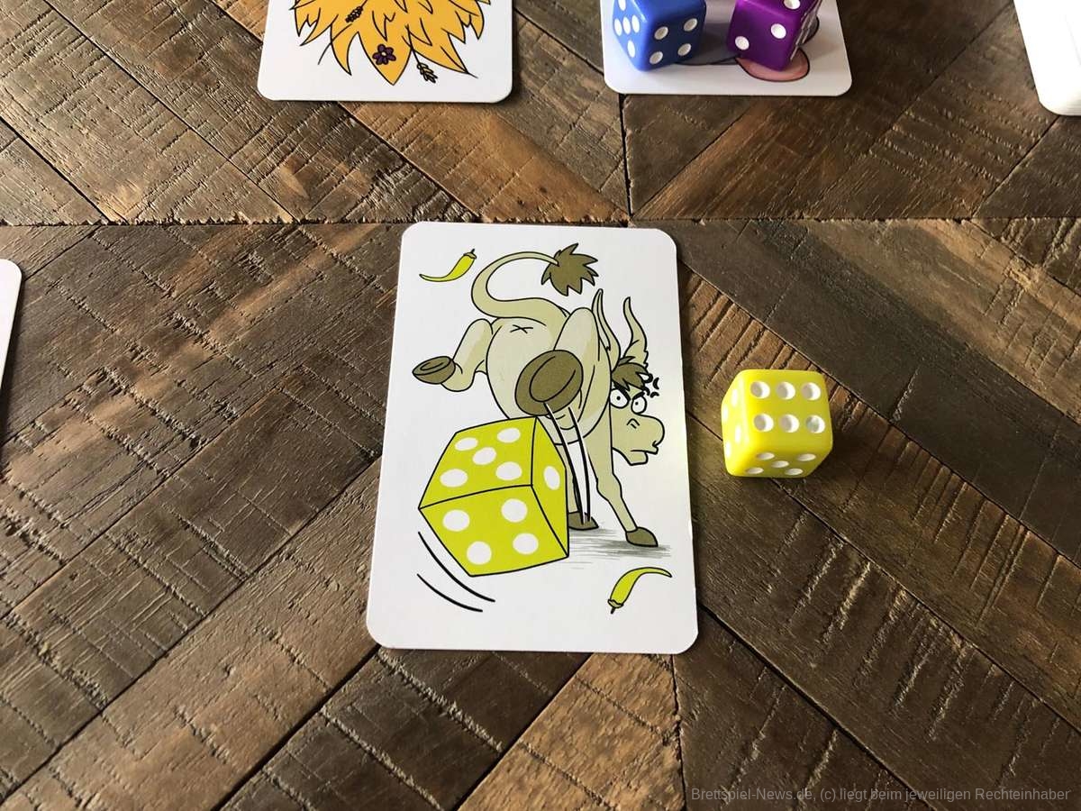 Der Wert der gespielten Karten entscheidet sich aber so richtig erst, wenn alle Würfel gefallen sind. Bis dahin ist noch recht offen, ob die Handkarten gut oder schlecht sind, wobei wir schnell gelernt haben, dass die Runden auch mit mittleren Werten durchaus gewonnen werden können. Durch den wütenden Esel, der die Würfel kickt, gibt es dann vielleicht doch noch den ein oder anderen Überraschungsmoment. Uns hat auch die Gestaltung der Karten sehr gut gefallen. Die ultra witzigen Cartoon-Esel haben es uns direkt angetan und nach der dritten Runde haben wir bereits ähnlich verrückt dreingeschaut.