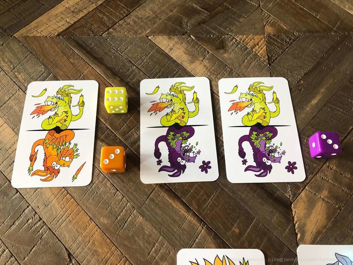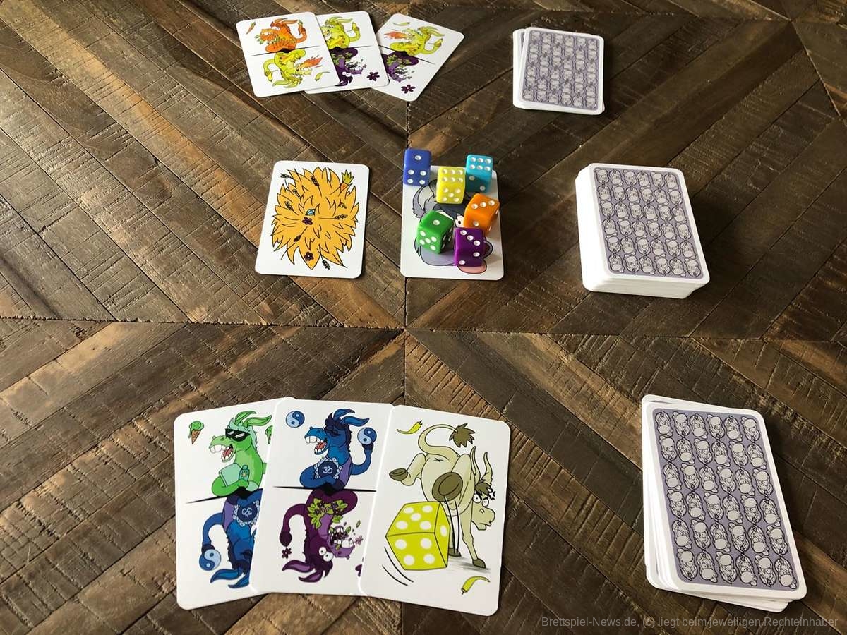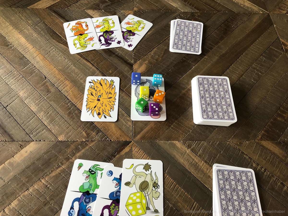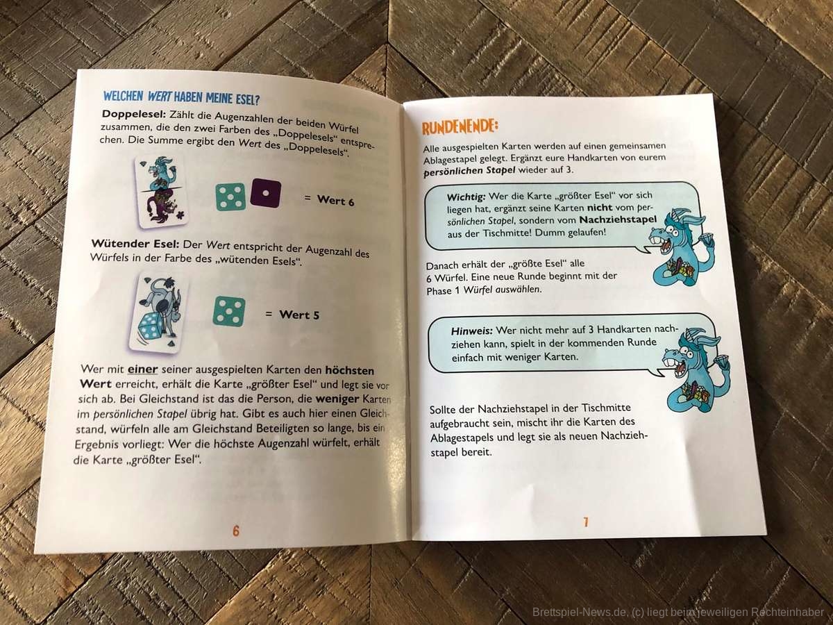 Der Wert der gespielten Karten entscheidet sich aber so richtig erst, wenn alle Würfel gefallen sind. Bis dahin ist noch recht offen, ob die Handkarten gut oder schlecht sind, wobei wir schnell gelernt haben, dass die Runden auch mit mittleren Werten durchaus gewonnen werden können. Durch den wütenden Esel, der die Würfel kickt, gibt es dann vielleicht doch noch den ein oder anderen Überraschungsmoment. Uns hat auch die Gestaltung der Karten sehr gut gefallen. Die ultra witzigen Cartoon-Esel haben es uns direkt angetan und nach der dritten Runde haben wir bereits ähnlich verrückt dreingeschaut.