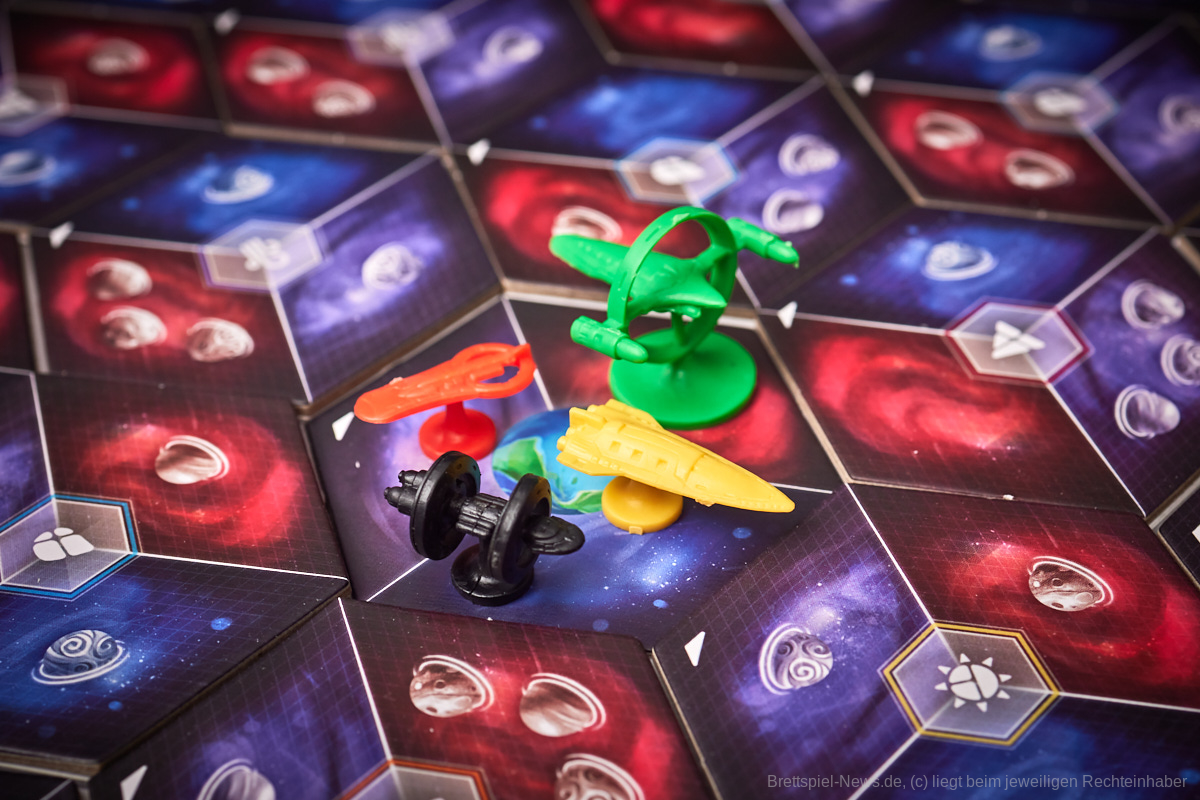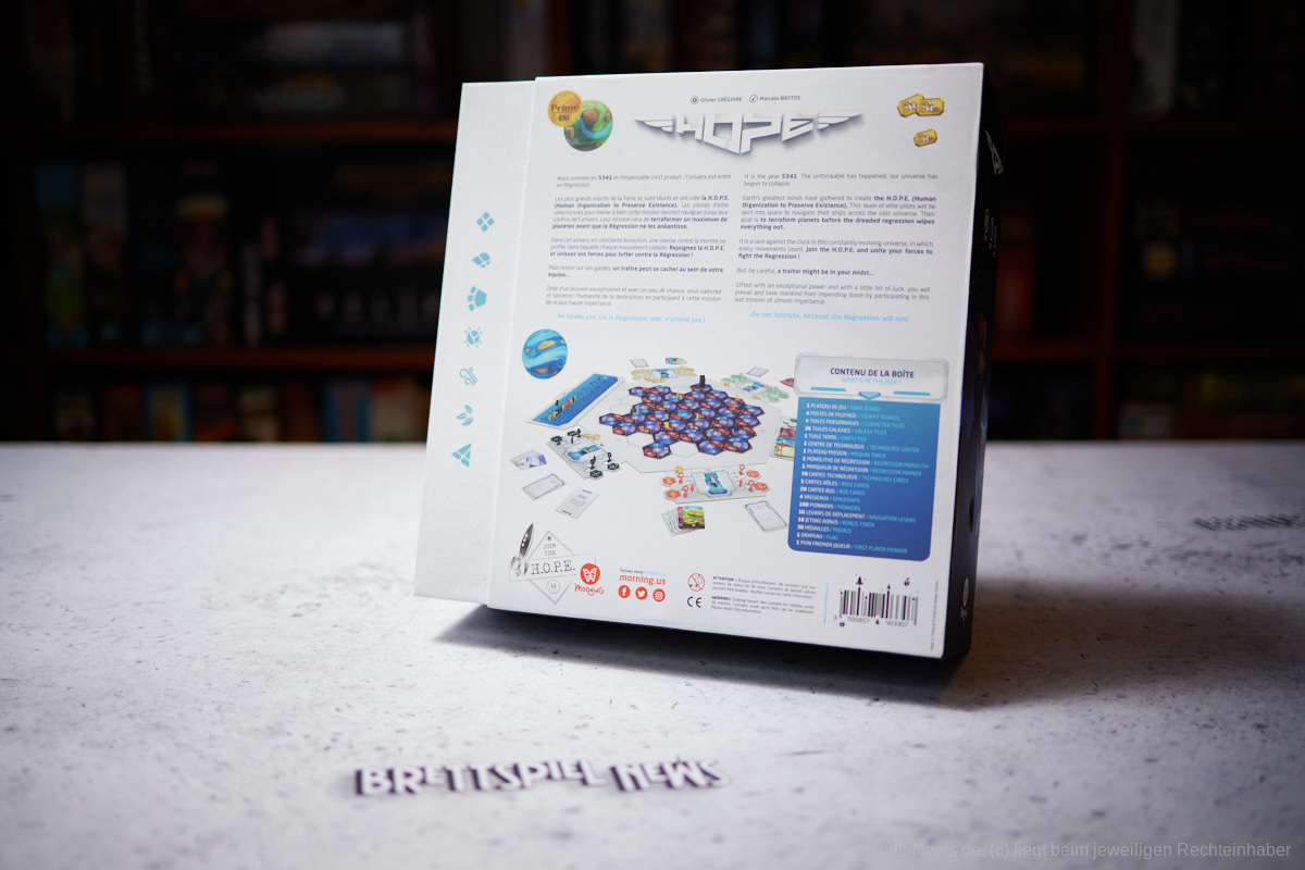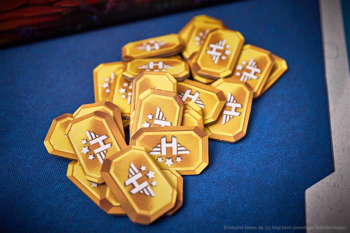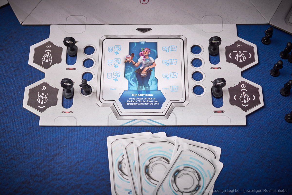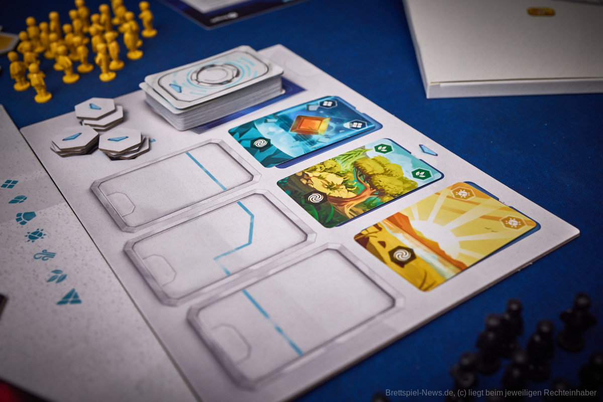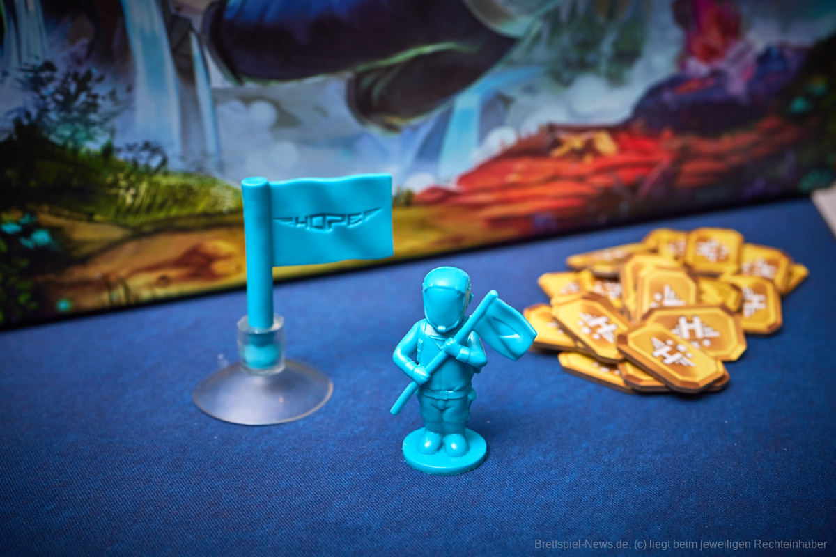 ″H.O.P.E.“ ist ein Spiel von Licht und Schatten. Dass das Spiel damals über Kickstarter das Licht der Welt erblickt hat, ist sehr schnell am Spielmaterial gesehen. Das Team, das für die Präsentation und die Funktion des Spielmaterials zuständig war, hat die Hausaufgaben definitiv gemacht. Die Illustrationen sehen gut aus, alle Spielelemente haben einen zugeordneten Platz auf dem Spielfeld und sogar die Aktionstoken, die die Bewegungsoptionen darstellen, sind kleine Hebel, die in den Spieltableaus herumgeschoben werden. In neueren Versionen liegt sogar ein kleiner Saugnapf dem Spielmaterial bei, damit die Weltraumflächen mit Leichtigkeit vom Spielfeld geholt werden können. Alles fühlt sich dadurch sehr hochwertig und professionell an, was sich beim Spielen an sich leider schnell wieder legt.