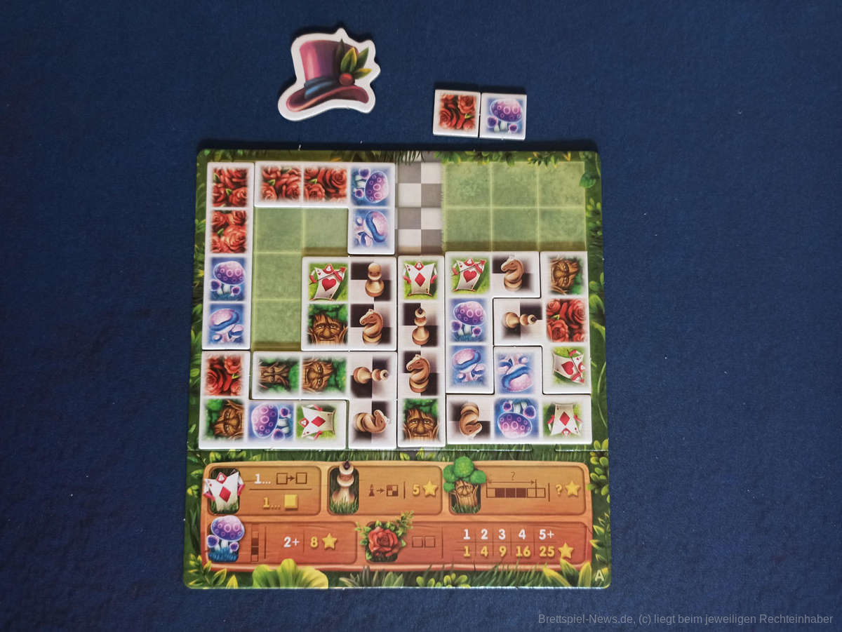 Interessant ist die Mechanik, die das Spielende auslöst, sobald eine Person keines der ausliegenden Plättchen mehr bei sich platzieren kann. Dies kann zu Überraschungen führen, wenn durch eine eher wenig platzsparende Auslage der Plättchen einer Person das Spielende deutlich schneller eingeläutet wird, als von den anderen erwartet.