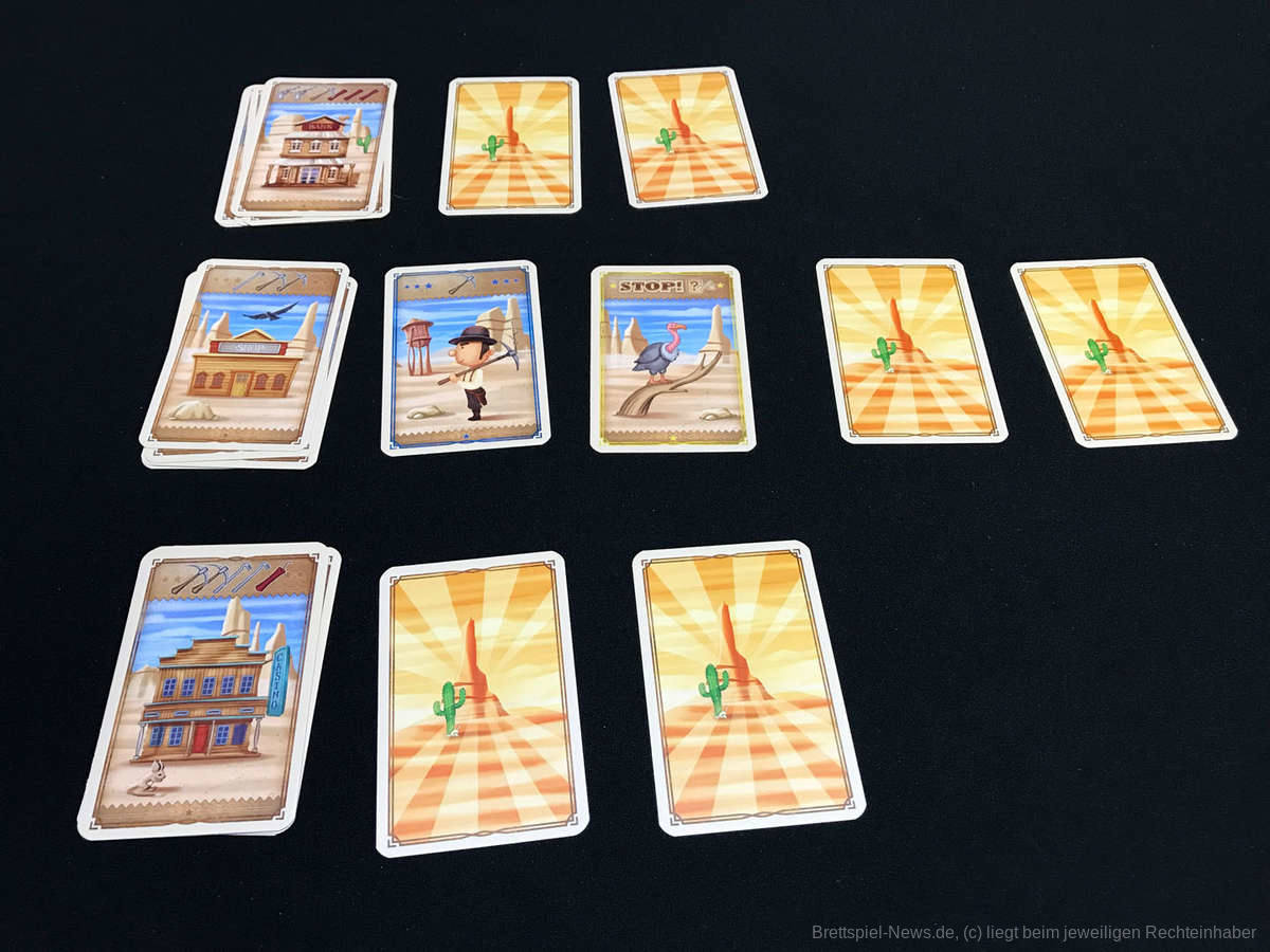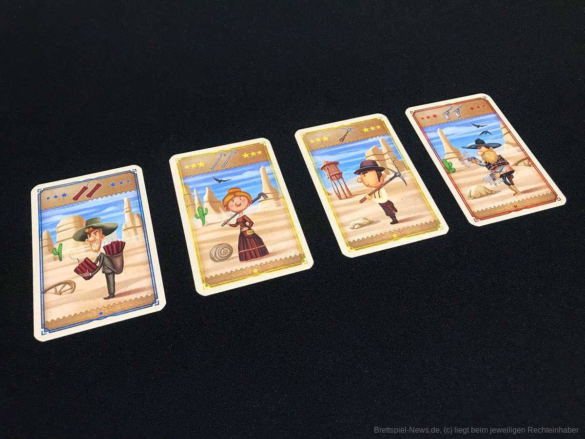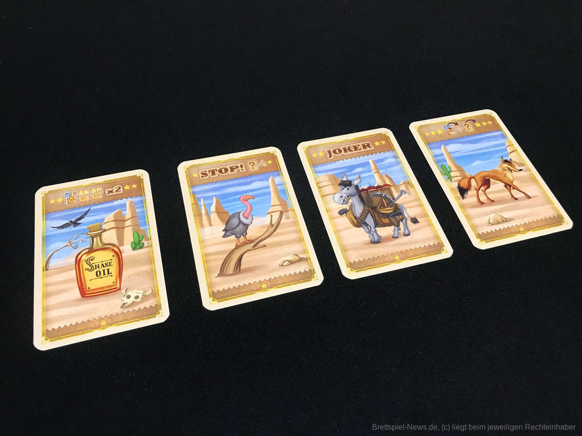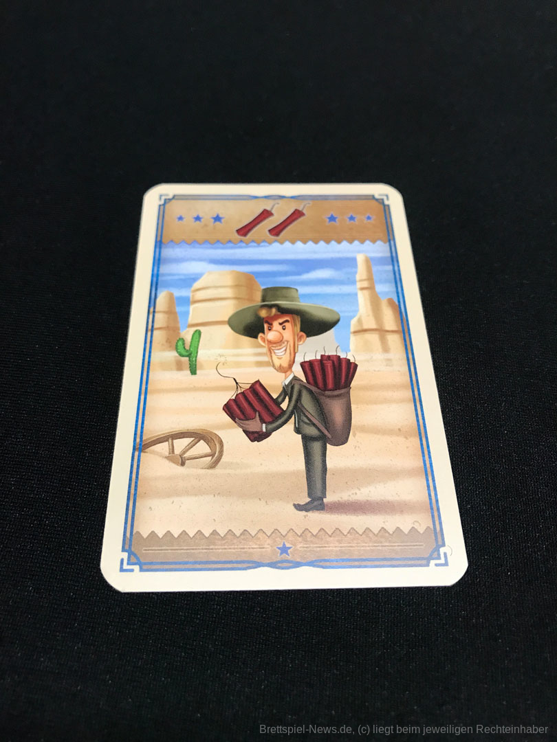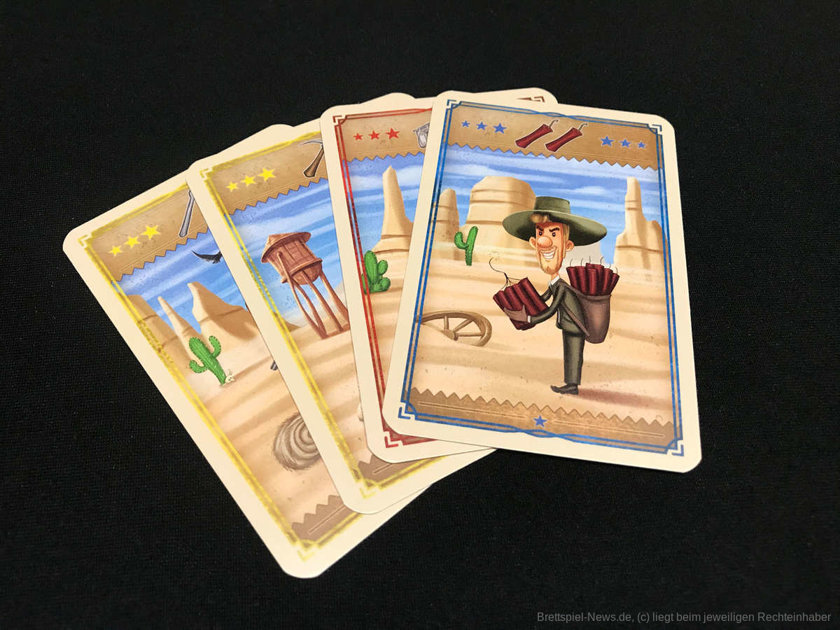 Kommen wir zum Kern des Spiels. Der spannende Moment, wenn ein Überfall passiert und alle mitfiebern. Das Aufdecken der Karten wird zum reinen Glücksspiel. Keiner der Personen am Tisch weiß, was die Anderen für Karten angelegt haben. Somit könnte bereits die zweite aufgedeckte Karte der Geier sein, der den Überfall unterbricht. Im Spiel zu dritt oder viert hatten wir oft den Fall, das der erste Überfallversuch in irgendeiner Form scheiterte. Das liegt sicherlich am hohen Anteil der Sonderkarten.
