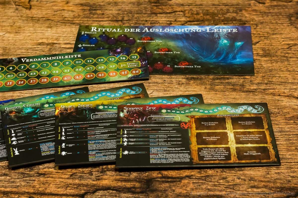 Verdammnisphase: Verdammnispunkte stellen die Siegpunkte dar. Die Person mit den meisten Verdammnispunkten am Ende des Spiels gewinnt. Für jedes kontrollierte Tor, wird ein Verdammnispunkt vergeben. Anschließend können die Spieler und Spielerinnen entscheiden, ein Ritual der Auslöschung durchzuführen. Hierbei werden Machtpunkte ausgegeben, um weitere Verdammnispunkte zu erhalten. Der Marker des Rituals wird um ein Feld in Richtung des sofortigen Todes nach vorne bewegt.
