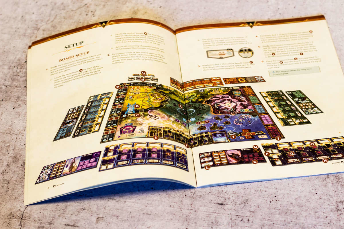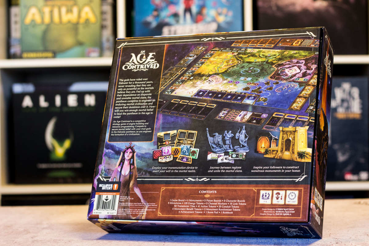 Auf dem Spielfeld gestaltet sich das folgendermaßen. “An Age Contrived“ besitzt zwei Hauptbereiche. Einerseits das persönliche Spielertableau über das die Verwaltung der eigenen Aktionen und Ressourcen läuft und das Spielfeld, über das die eigene Spielfigur gezogen wird. Das eigene Spieltableau baut die Spielgruppe individuell aus. Während es zu Beginn des Spiels noch nahezu identisch ist (bis auf die individuellen Fähigkeiten der Charaktere die sich nach und nach freischalten lassen), können neue Fähigkeiten und Effekte ergänzt und freigeschaltet werden. Hier befindet sich auch die Angaben, welche Aktionen die Spielgruppe ausführen kann. Über jeder Aktion befindet sich ein Fließbandglied, das Energie befördert. Wird eine Aktion verwendet, wird die Energie des Fließbandgliedes verbraucht und die Aktion ausgeführt. So lassen sich zum Beispiel Teile der großen Monumente errichten, die Spielfigur übers Spielfeld bewegen oder andere Effekte des Spielfeldes nutzen.