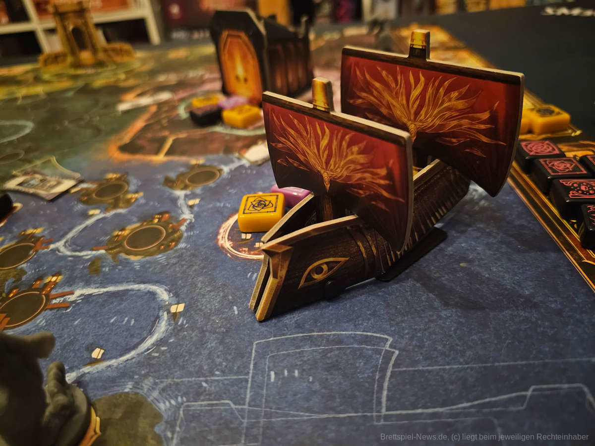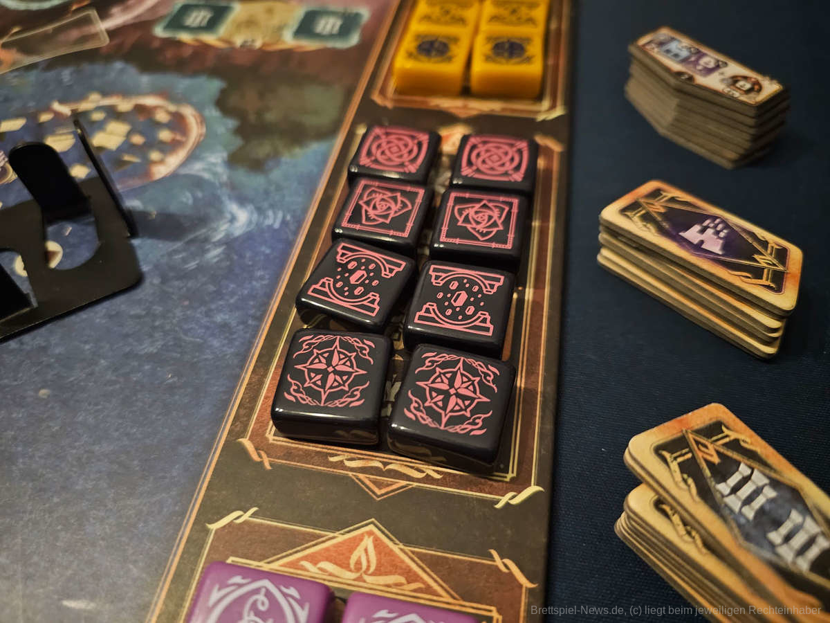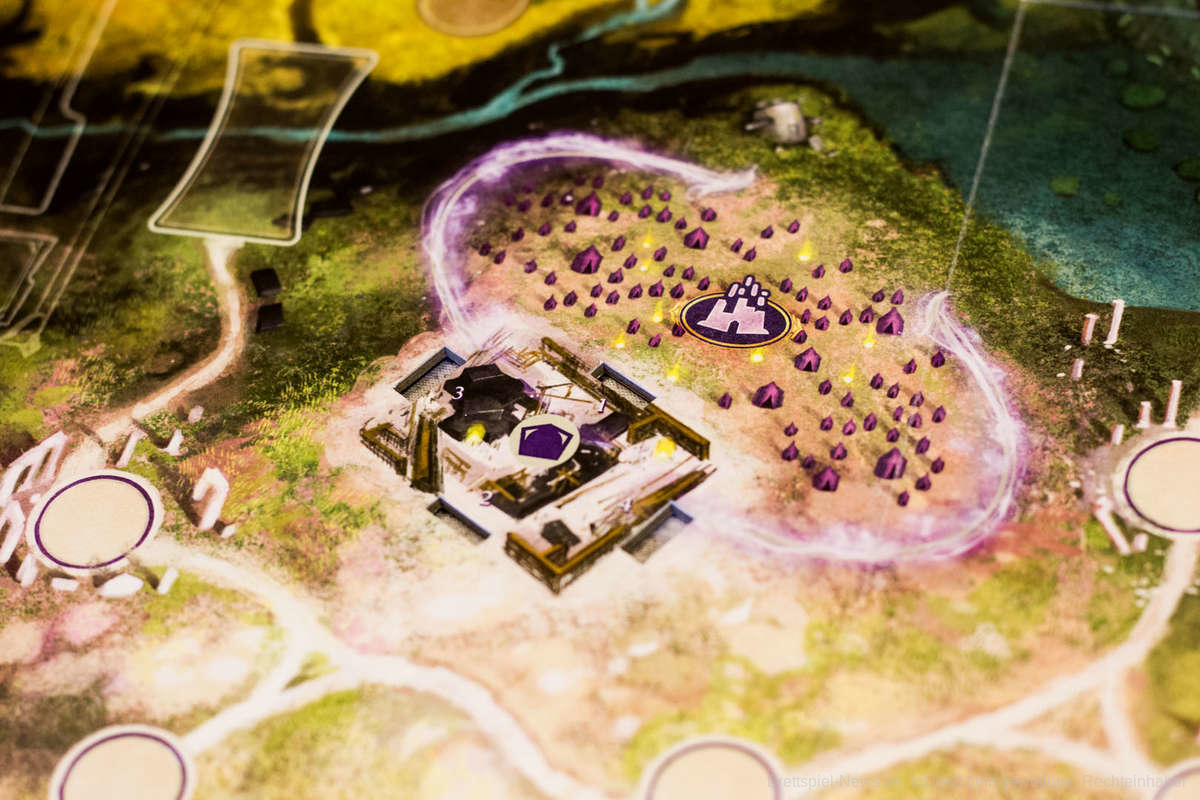 Und wenn wir schon beim Thema Spielmaterial sind. Die magnetischen Spielteile der Monumente sind beeindruckend und machen das Spiel zu einem Hingucker. Zwar lässt sich das Ganze auch mit normalen zweidimensionalen Spielplanteilen verwirklichen, aber besonders durch ihre magnetische Eigenschaft und weil man sie zu einem Gebäude zusammenbauen kann, wirkt das gesamte Spielfeld viel aufgeräumter und strukturierter. Im Prototyp bildet der Kern der Monumente ein kleines Eisengerüst, wobei die Anleitung schon sagt, dass es auch alternativen geben könnte. Besonders preislich wird es hier spannend, ob dieses Verfahren auch im Kosten/Nutzen-Vergleich besteht, oder für die Funktion, die es einnimmt viel zu teuer wird.