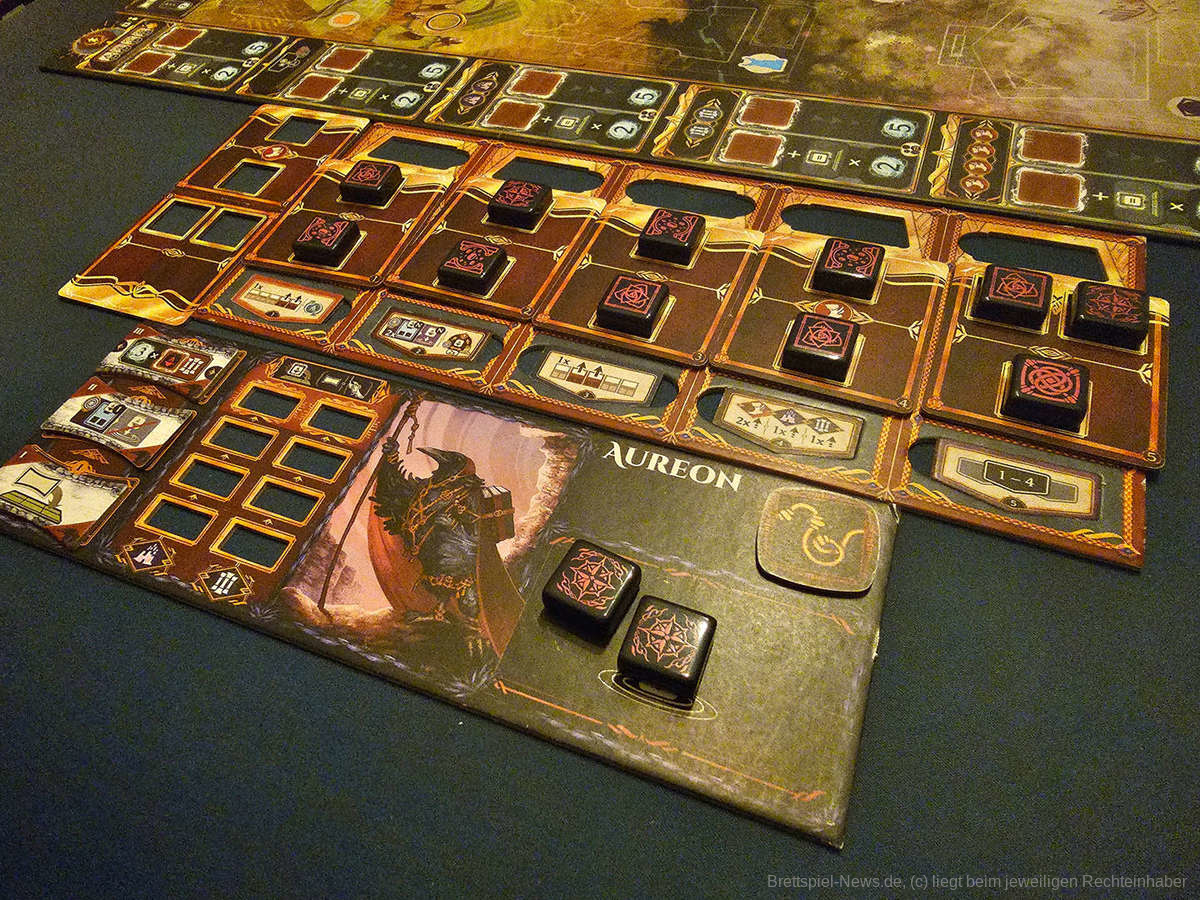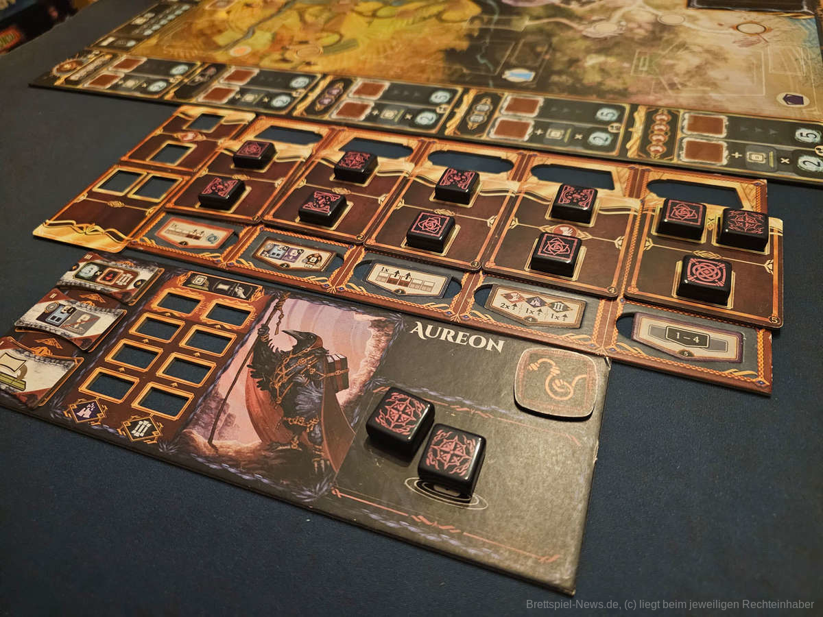 Besonders gut fand ich jedoch, dass kaum etwas an diesem Problem dem Aufbau des Spiels geschuldet ist. Immer wenn ich meckern wollte, dass etwas nicht klar genug abgebildet ist, habe ich gemerkt, dass ich einfach nur zu blind war, um es zu sehen. “An Age Contrived“ macht bereits in seinem Prototyp einen exzellenten Job seine Informationen der Spielgruppe so problemfrei wie möglich zur Verfügung zu stellen. Die Symbole ergeben Sinn, die Spielhilfe macht einen wirklich großartigen Job und enthält alle essentiellen Informationen des Spiels und auch das Spielmaterial an sich hilft dabei ungemein.