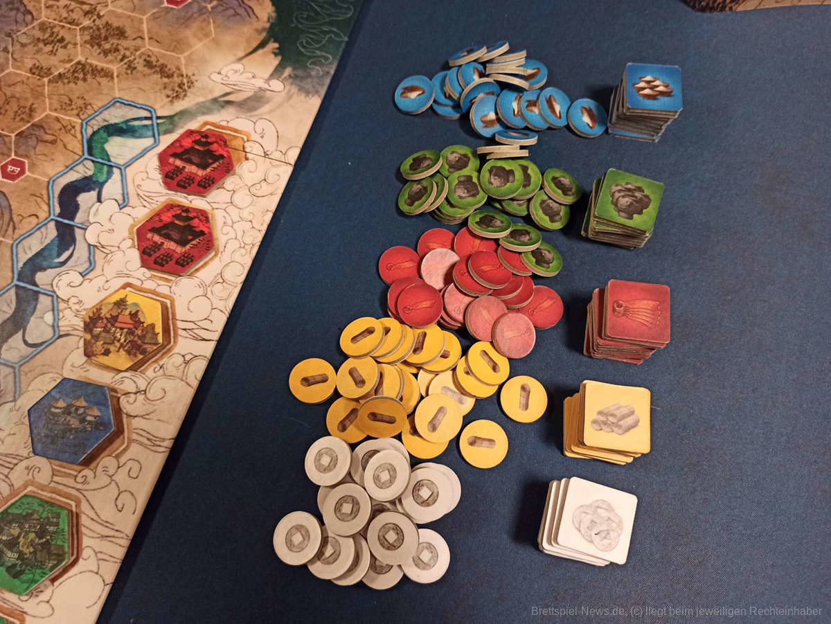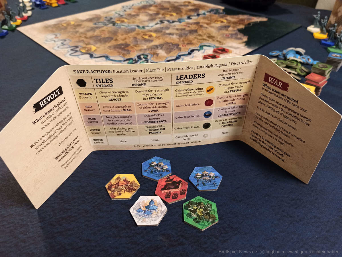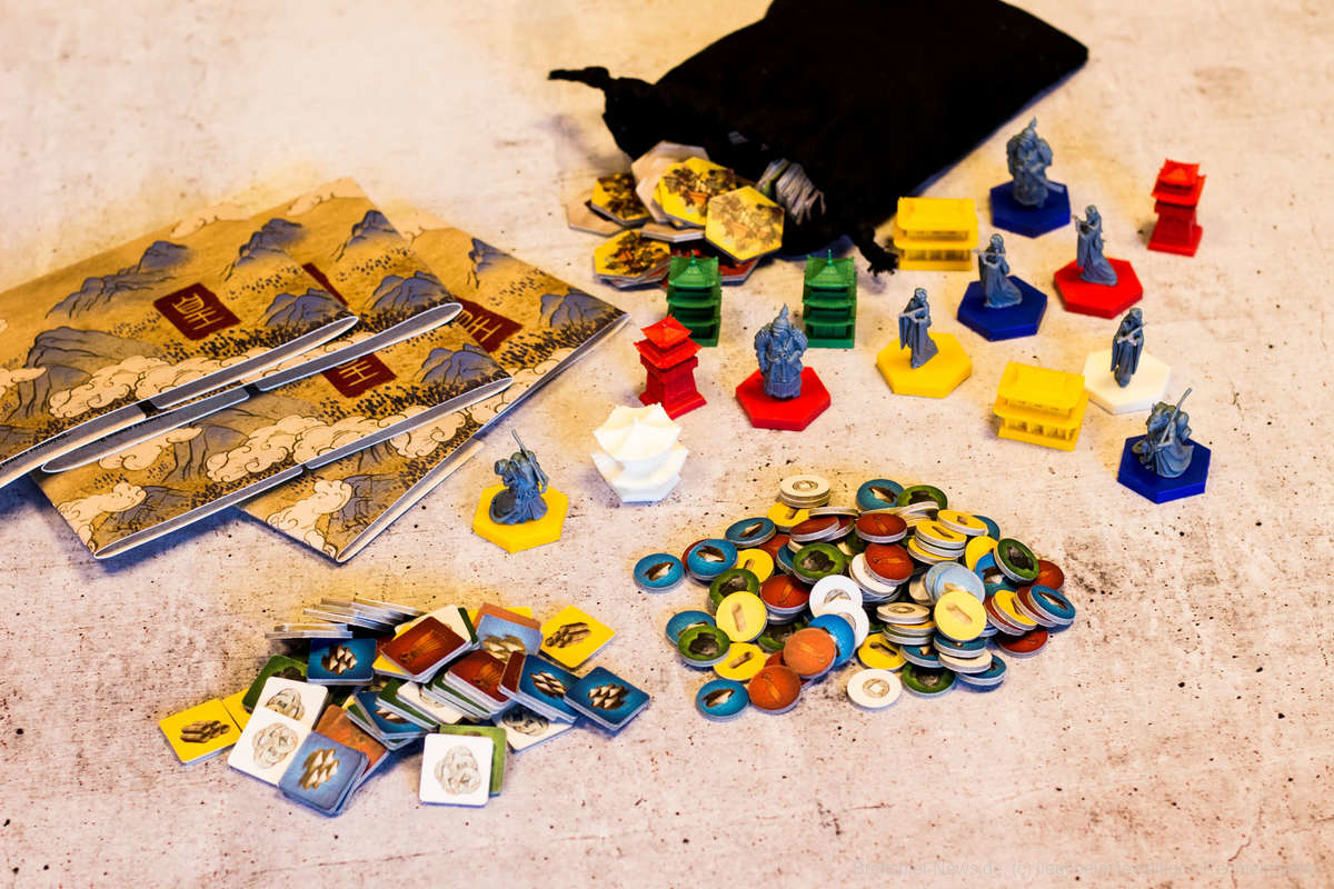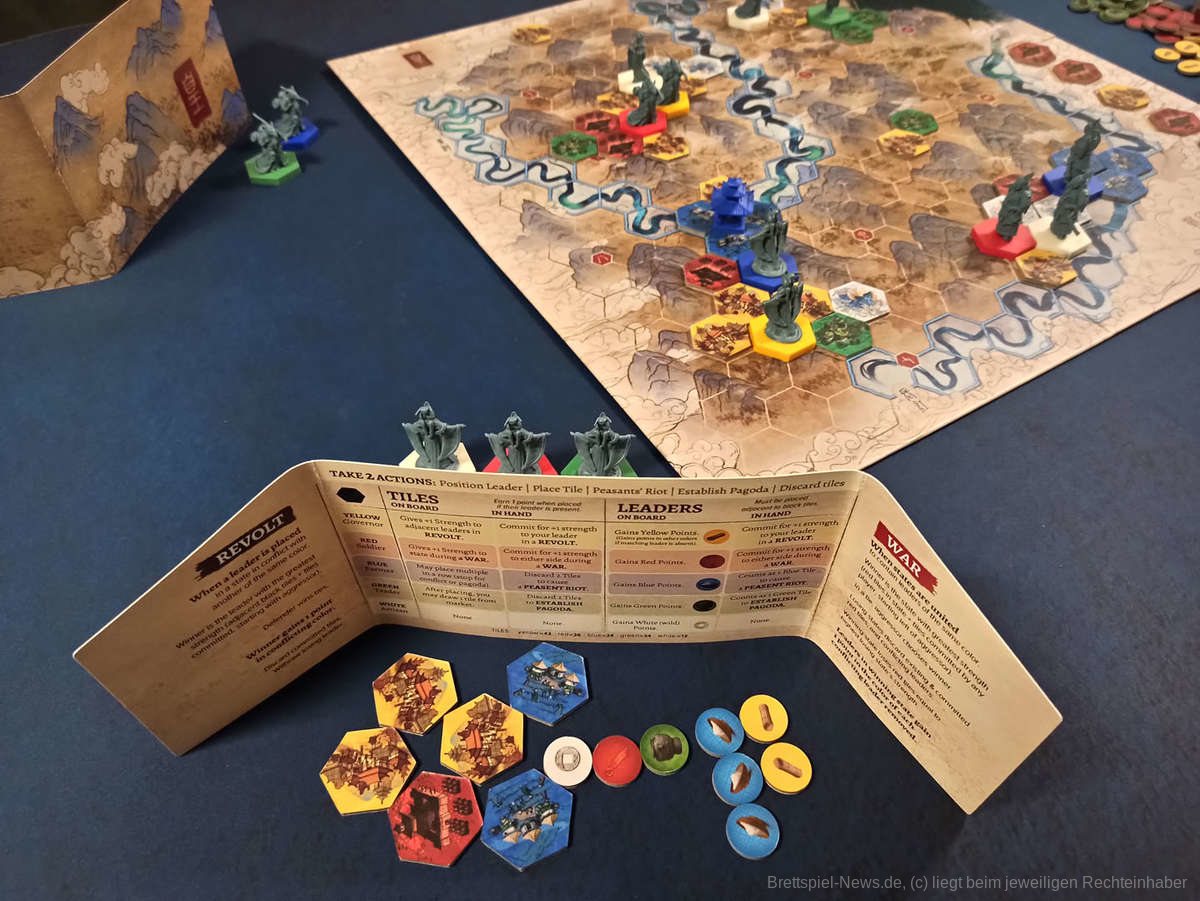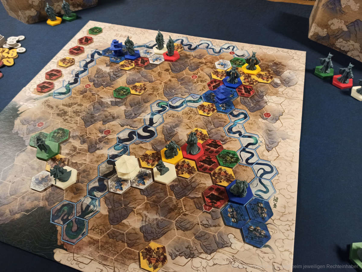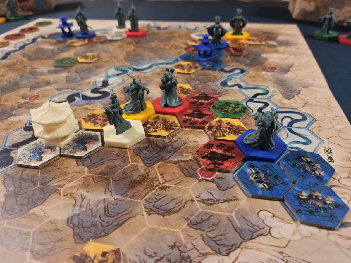 Die thematische Umsetzung der Zeit der „streitenden Reiche“ ist wunderbar gelungen. Die Spielmechanik provoziert immer wieder Kämpfe, sei es um jemandem eine starke Position, beispielsweise in einem Gebiet mit Pagode, für die es jede Runde einen extra Siegpunkt gibt, streitig zu machen oder auch nur weil der Zeitpunkt günstig und es ein einfach zu erlangender Siegpunkt ist.