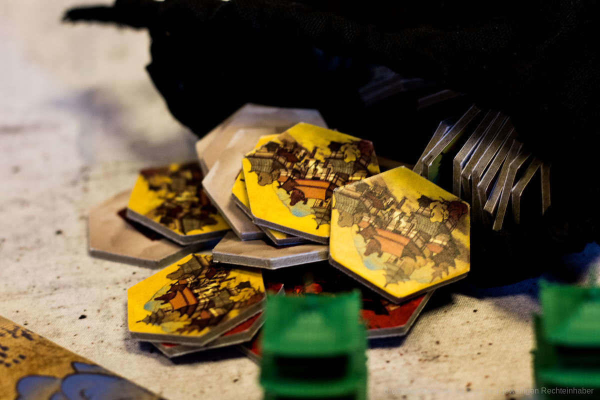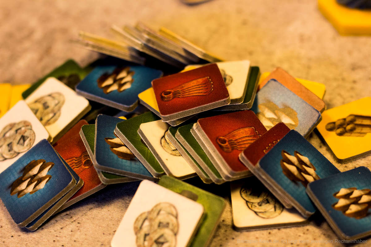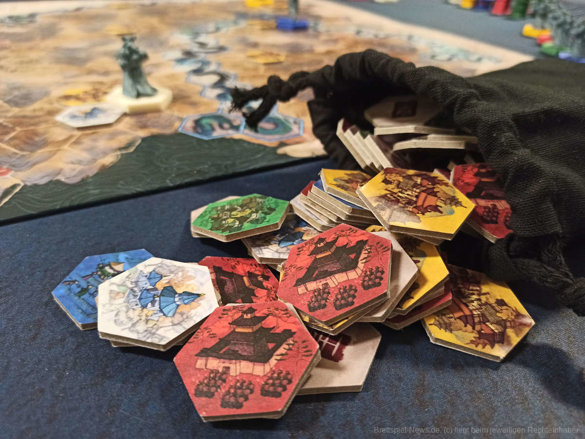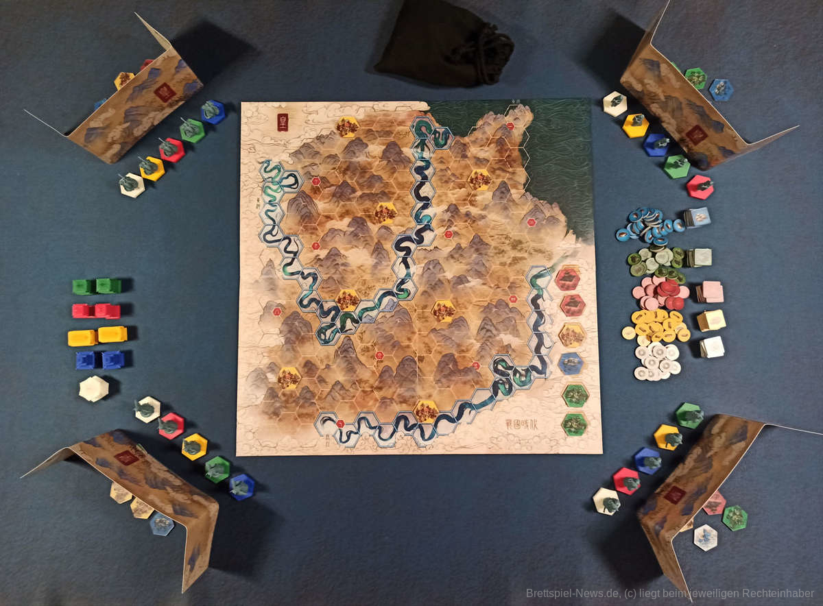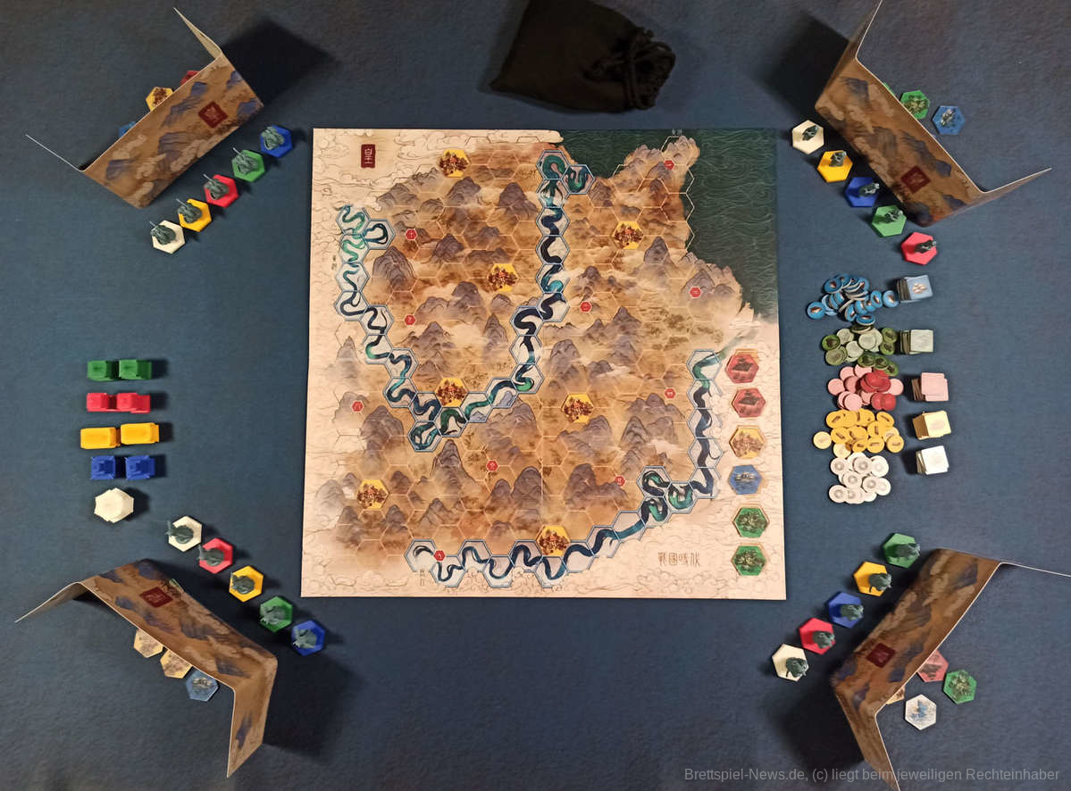 Der uns vorliegende Prototyp von „Huang“ macht bereits einen ausgereiften Eindruck. Hervorzuheben ist, dass dies keine Neuentwicklung ist, sondern auf der Mechanik der Spiele „Yellow & Yangtze“ (2018) und „Tigris & Euphrat“ (1998) basiert. Wir haben beide nicht gespielt, hatten aber „Yellow & Yangtze“ schon länger auf unserer Wunschliste und waren natürlich entsprechend über die Möglichkeit, „Huang“ anzuspielen, sehr erfreut.