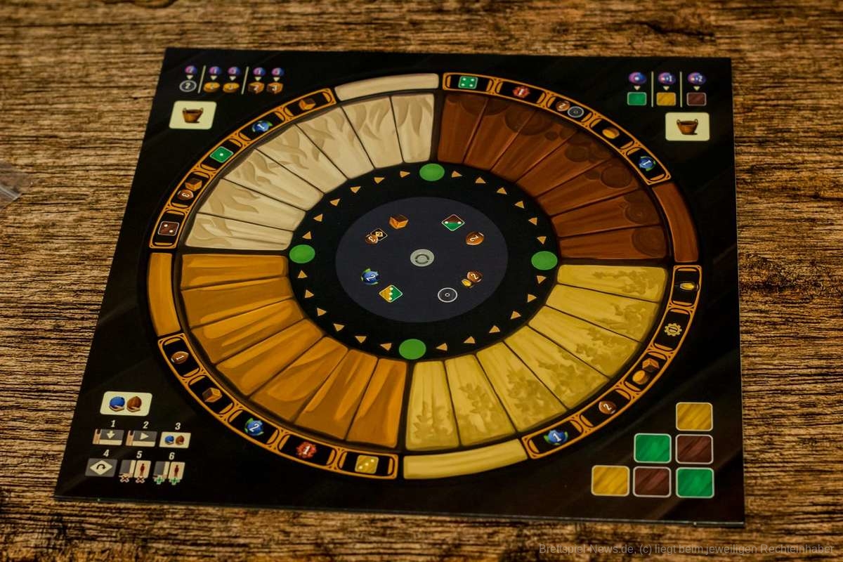 Wie schon in “Praga Caput Regni” wird “Woodcraft” durch einen Rondell-Mechanismus gesteuert. Das Rondell ist in vier Quadranten eingeteilt und immer, wenn wir uns für eine der sieben Aktionen entscheiden, muss die gewählte Aktion ans andere Ende des nächsten Quadranten bewegt werden. Dies ist allerdings nur so lange möglich, wie der nächste Quadrant nicht durch alte Plättchen belegt ist. Sollte dies der Fall sein kann die Aktion grundsätzlich nicht mehr benutzt werden. Lange nicht genutzte Aktionen werden durch graduelle Aufwertungen attraktiver gemacht. So kann es zusätzliche Ressourcen, Holz oder Siegpunkte geben, wenn ich mich dann für diese Aktion entscheide. Das Spiel stellt also von selbst sicher, dass alle Aktionen in etwa gleichem Maße genutzt werden.