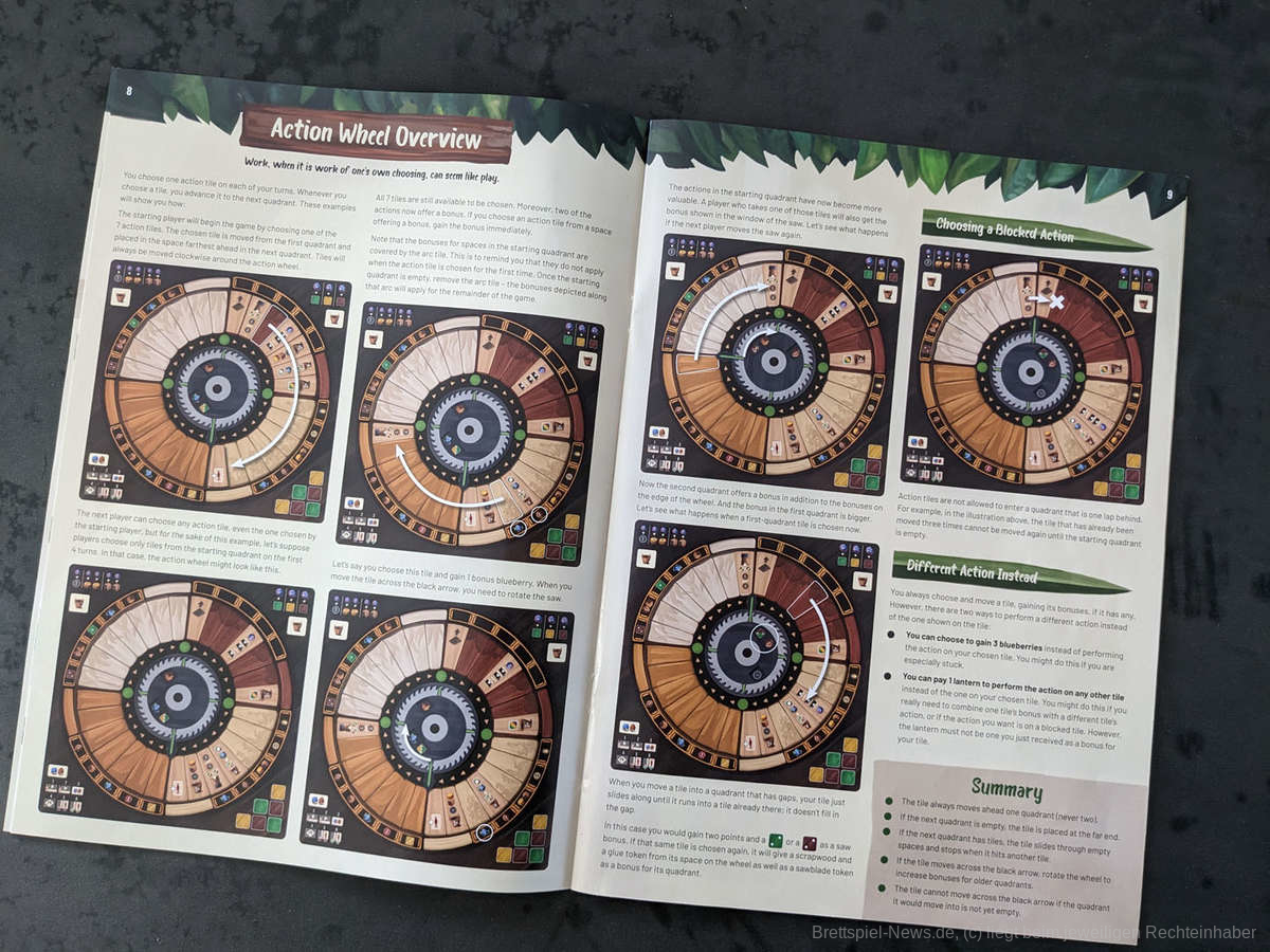 Auch der Aktionsauswahlmechanismus konnte uns überzeugen. Während bei anderen Spielen manche Aktionen einfach in der Versenkung verschwinden, weil sie für die meisten am Tisch nicht stark genug sind, geht "Woodcraft“ hier einen anderen Weg. Durch den Rondell-Mechanismus werden nicht genutzte Aktionen mit der Zeit attraktiver, indem sie größere Boni geben. Die Boni sind dabei stark genug gewählt, dass alle Aktionen im Laufe der Partei eine ähnlich hohe Nutzung verzeichnen können.