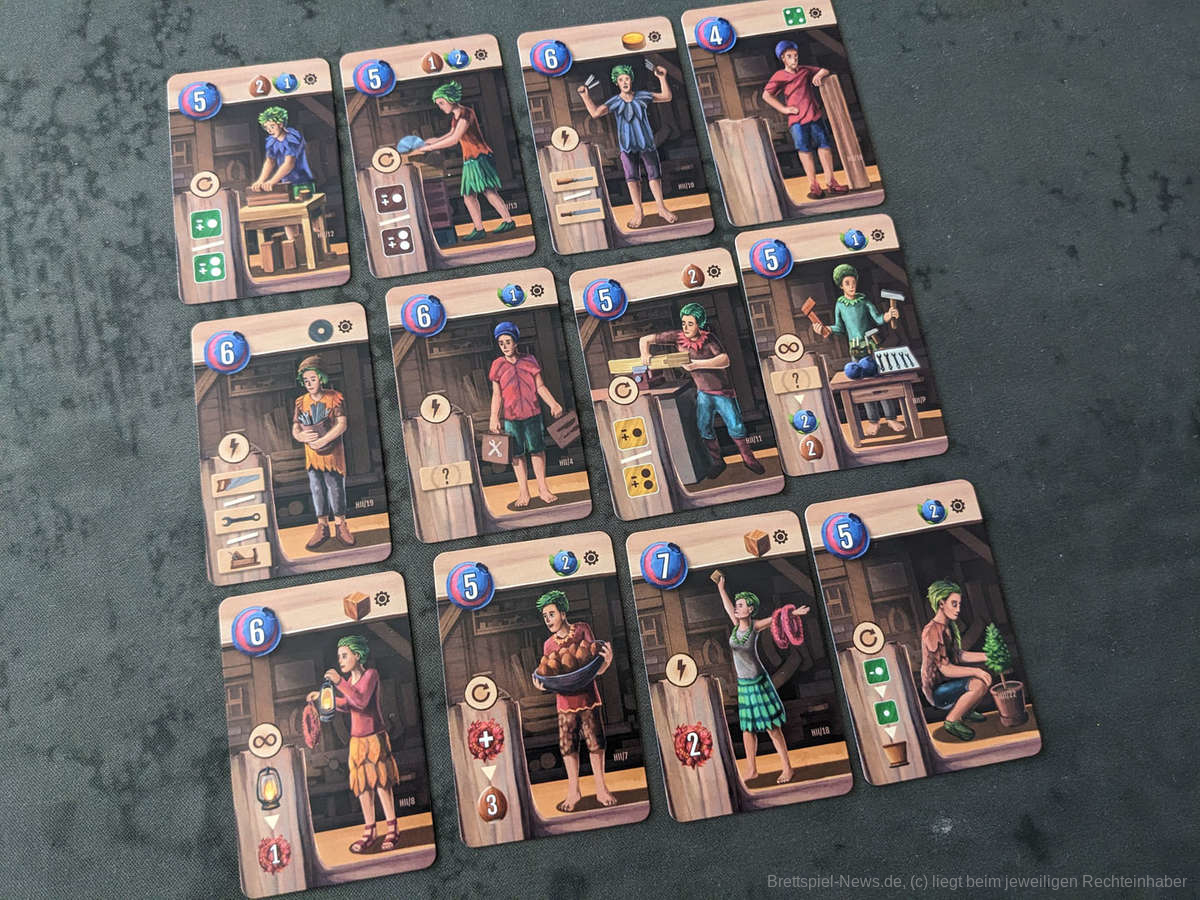 Als Fans der Spiele von Vladimír Suchý (und nach einem für uns enttäuschendem „Messina 1347“) waren wir sehr gespannt, was er nun in Zusammenarbeit mit Ross Arnold geschaffen hat. Und eins vorweg: "Woodcraft“ hat uns direkt in seinen Bann gezogen. Dies lag im ersten Moment an dem großartigem Artwork von Michal Peichl, das direkt Lust darauf macht, als Waldelf die eigene Holzwerkstatt zu eröffnen. Leider hat das Spielmaterial diese Euphorie ein wenig getrübt, da die Karten recht dünn sind und, zumindest bei unserem Exemplar, die Tokens zum Teil nicht mittig ausgestanzt waren. Alles in allem geht die Qualität des Spiels in Ordnung und hat sowohl nach unten als auch noch oben keine großen Ausreißer.