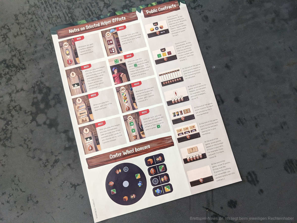 "Woodcraft“ verfügt über einige kleinteilige Regeln, die in der gut strukturierten Anleitung mit vielen Beispielen und Bildern gut vermittelt werden und den Einstieg etwas vereinfachen. Dieser entpuppte sich für uns trotzdem als die größte Hürde. Zwar liegt dem Spiel ein Übersichtsblatt bei auf dem alle Helfer- und Zielkarten beschrieben sind, wir hätten uns jedoch kleinere Übersichtskarten für alle holzbegeisterten Handwerker und Handwerkerinnen gewünscht, insbesondere da die Ikonografie unseres Erachtens nicht immer selbsterklärend ist. Wir brauchten definitiv eine Lernpartie, mit sehr vielem Blättern in der Anleitung und Vergessen von freien Aktionen bis "Woodcraft“ seinen Charme entfalten konnte. Ab der zweiten Partie waren wir dem Spiel jedoch verfallen und der allgemeine Ablauf und auch die kleineren Feinheiten gingen gut von der Hand.