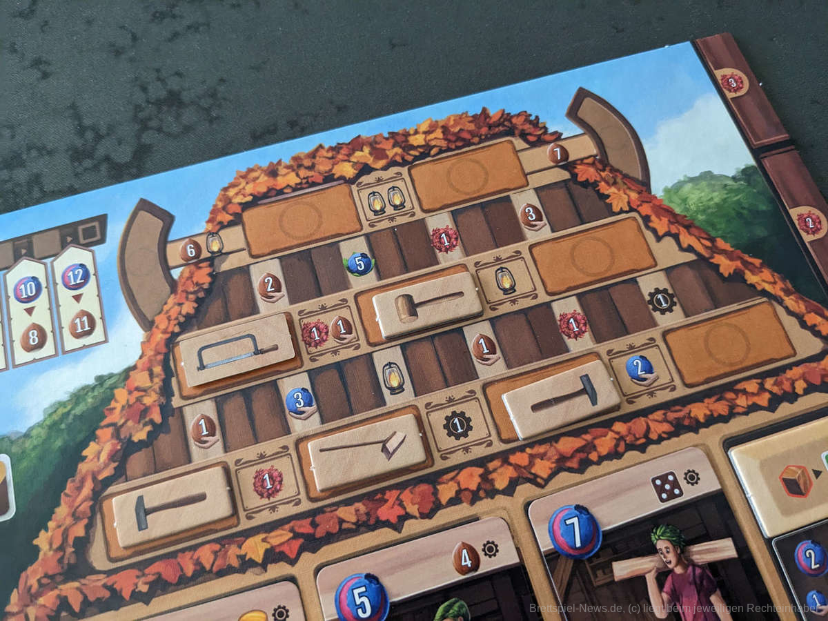 Die Aktionen des Rondells ermöglichen es uns, Helfer zu engagieren, die uns einmalige und dauerhafte Effekte bescheren, um mehr Haselnüsse (Siegpunkte) zu generieren oder unsere Fähigkeiten zur Holzbearbeitung verbessern. Zusätzlich müssen wir Gegenstände wie Kleber, Sägeblätter und Holzstücke kaufen, damit wir unser Holz damit bearbeiten können. Daneben gilt es, das Holz auf dem Markt mit Blaubeeren (Geldeinheit) zu kaufen und zu verkaufen, neue Bäume nahe unserer Werkstatt anzupflanzen und unsere Werkstatt aufzuwerten, um die verschiedenen Möglichkeiten der Holzbearbeitung überhaupt nutzen zu können. Denn hergestellten Gegenstände müssen nach speziellen Bauplänen gefertigt werden. Beispielsweise muss ein Bierkrug aus einem Vierer- und zwei braunen Einserwürfeln gefertigt werden. Im Spiel geht es also immer darum, die eigenen Würfel geschickt so zu manipulieren, dass sie den Anforderungen der verschiedenen Aufträge und Gegenstände zuträglich sind.