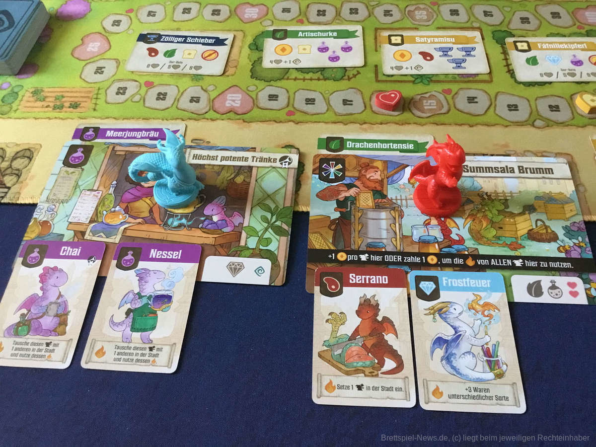 Das Sammeln bringt reichlich Ressourcen durch den Laden selbst, eventuelle Verzauberungen und die bis zu drei dort tätigen Werkeldrachen. Diese possierlichen Tierchen sind Feuer und Flamme für die verschiedenen Handwerke der Stadt. Nach dem Sammeln, darf ein Werkeldrache aus der Hand in den Laden gespielt werden, sollte dort noch eine Stelle frei sein. Schließlich darf noch die Fähigkeit eines Werkeldrachens genutzt und die Ortsfähigkeit eingesetzt werden.