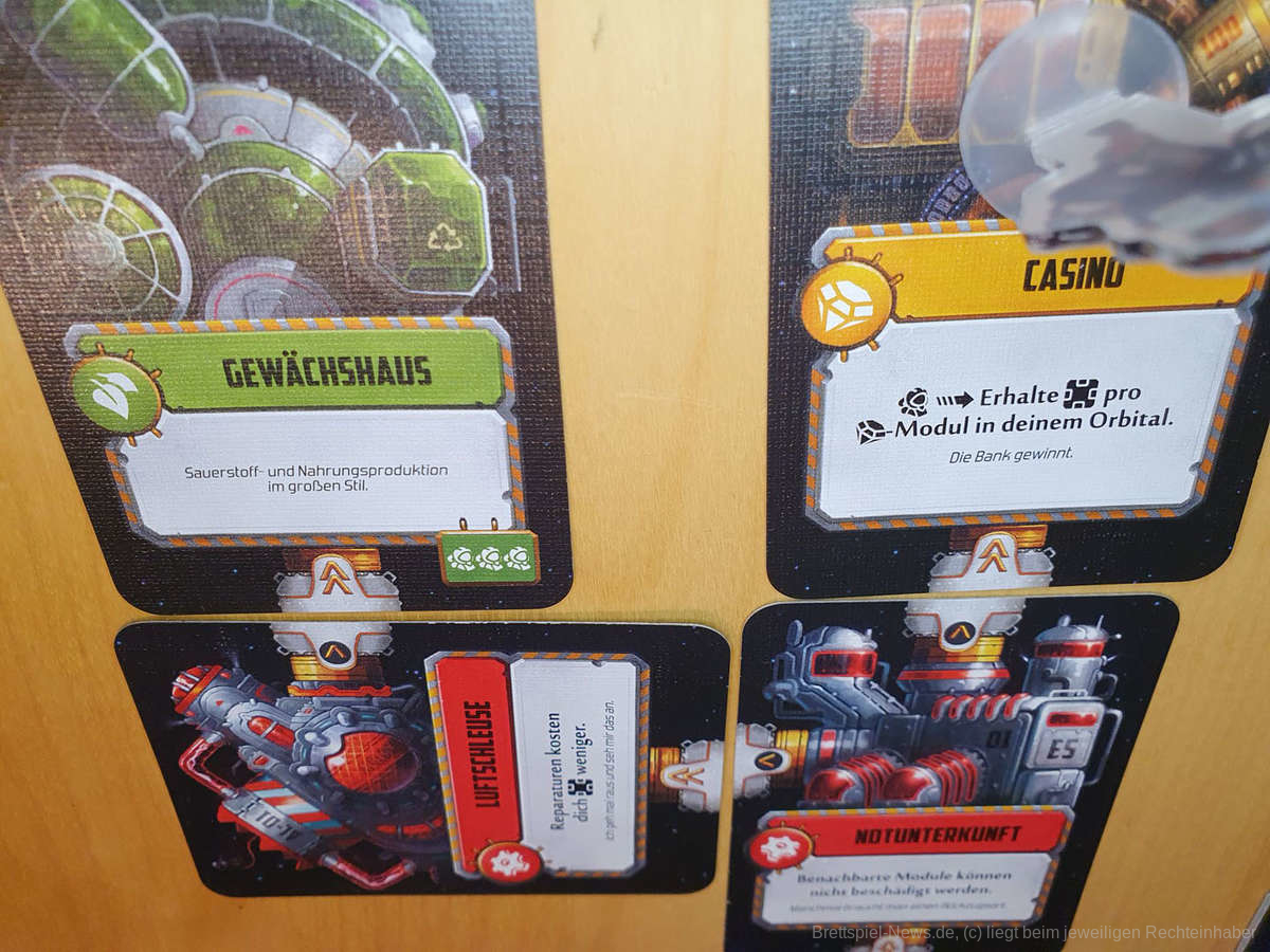 Durch Module und Ereignisse (Aktionen 3 und 4) können die ausliegenden Module der ausliegenden Orbitale beschädigt werden. In diesem Fall wird je ein Schadensmarker auf ein entsprechendes Modul gelegt. Die Effekte dieses Moduls können nicht genutzt werden und es bringt am Ende der Runde keine MC und keine weiteren Crewmitglieder ein. Es ist auch nicht möglich, an ein defektes Modul weitere Karten anzudocken.