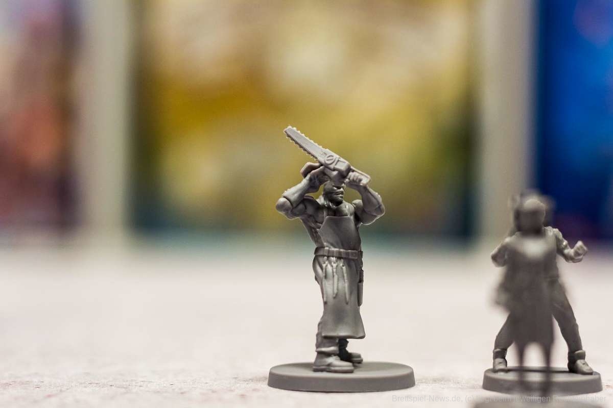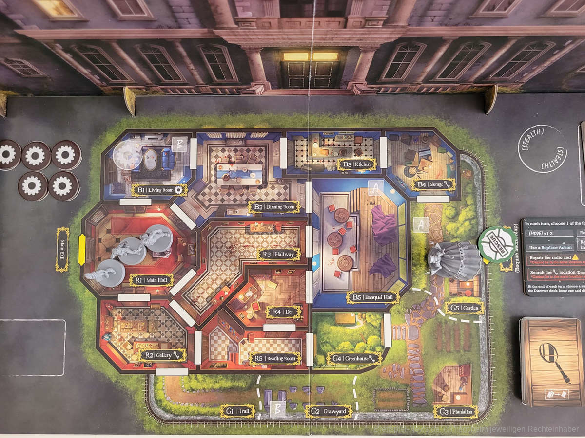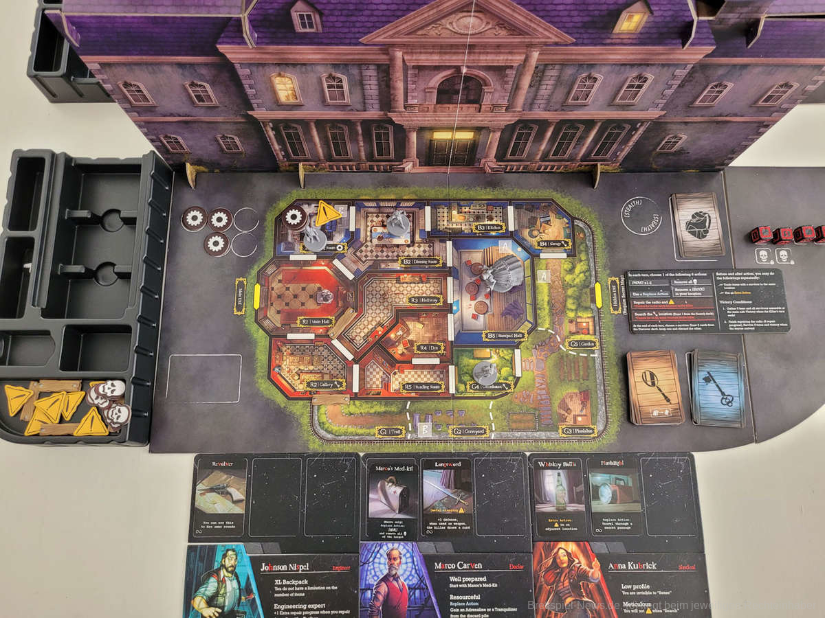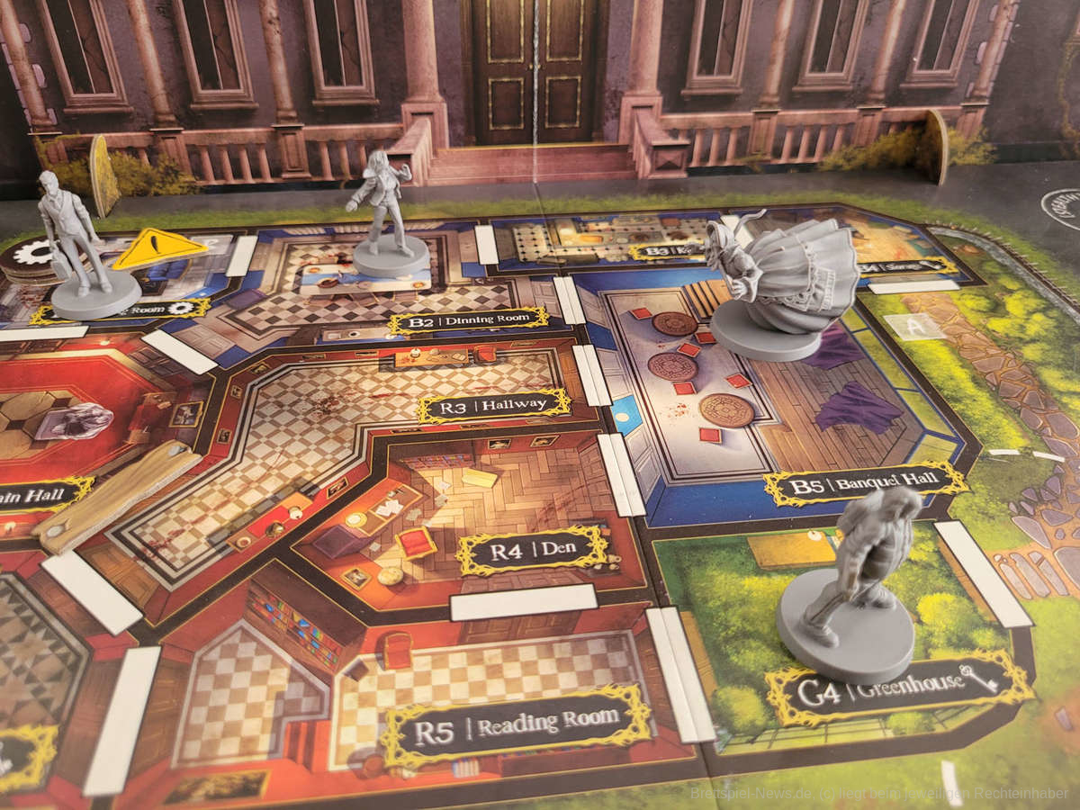 Noch nie ist es mir so schwergefallen wie heute, den vorangegangenen Absatz in meine Prototyp-Review zu schreiben, da das Spiel bereits wirkt, als würde ich hier die finale Version in meinen Händen halten. Ich könnte mir hier heute den Mund fusselig reden, warum mir das Material so gut gefällt. Stattdessen bitte ich euch einfach, die Bilder auf euch wirken zu lassen. Das Material ist absolute Spitzenklasse. Die Miniaturen der Killer sehen hervorragend aus. Besonders die Miniatur des Geistes hat es mir angetan. Die Karten und die Playerboards sind wunderschön illustriert und das Material fügt sich perfekt ineinander ein. Das Alleinstellungsmerkmal jedoch ist die riesige Villa in der Mitte des Spielplans. Ich kann nur meinen Hut vor solch vortrefflicher Qualität ziehen.