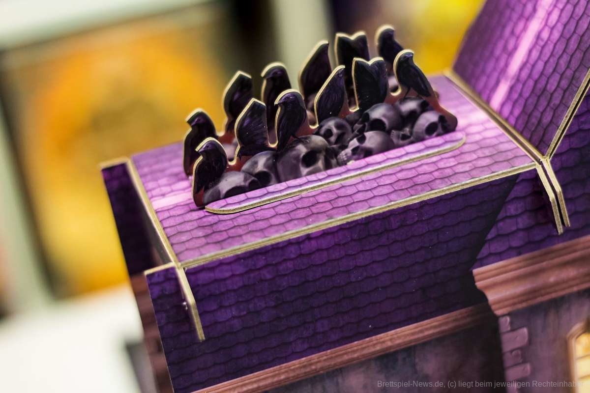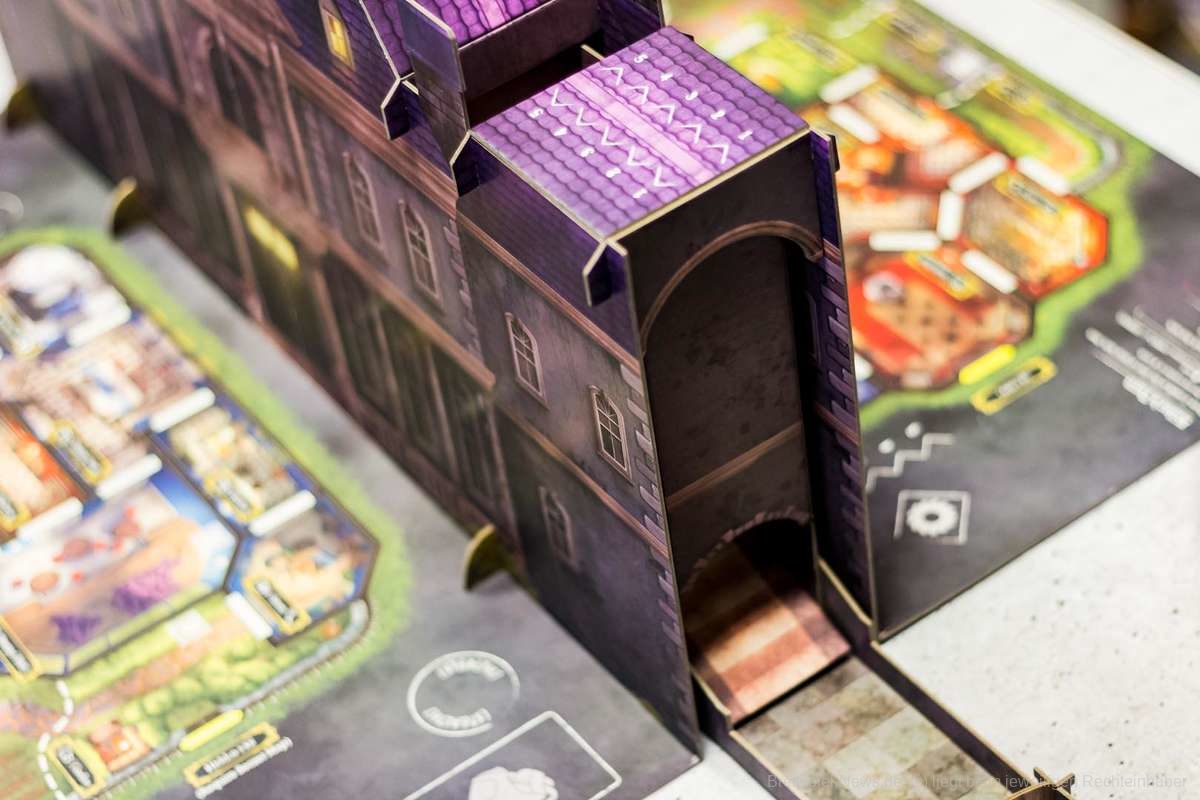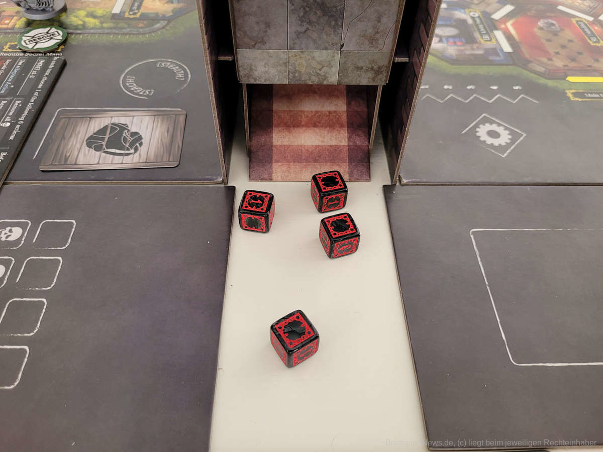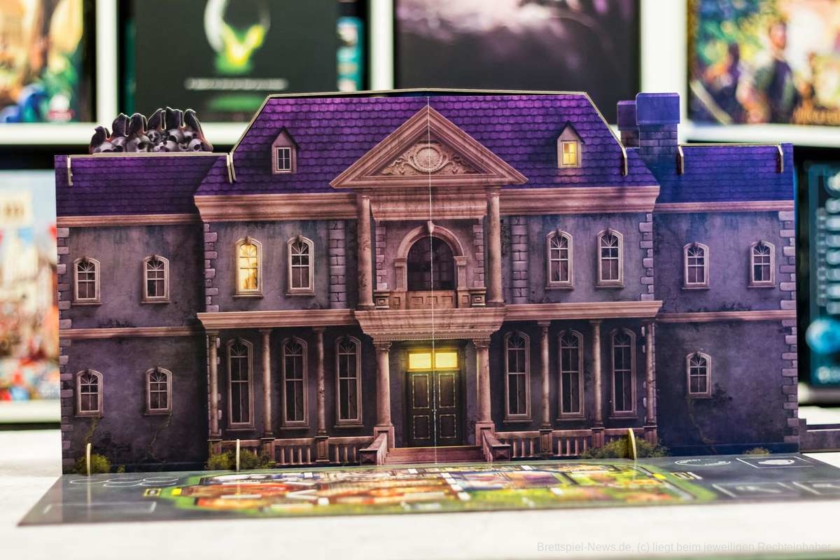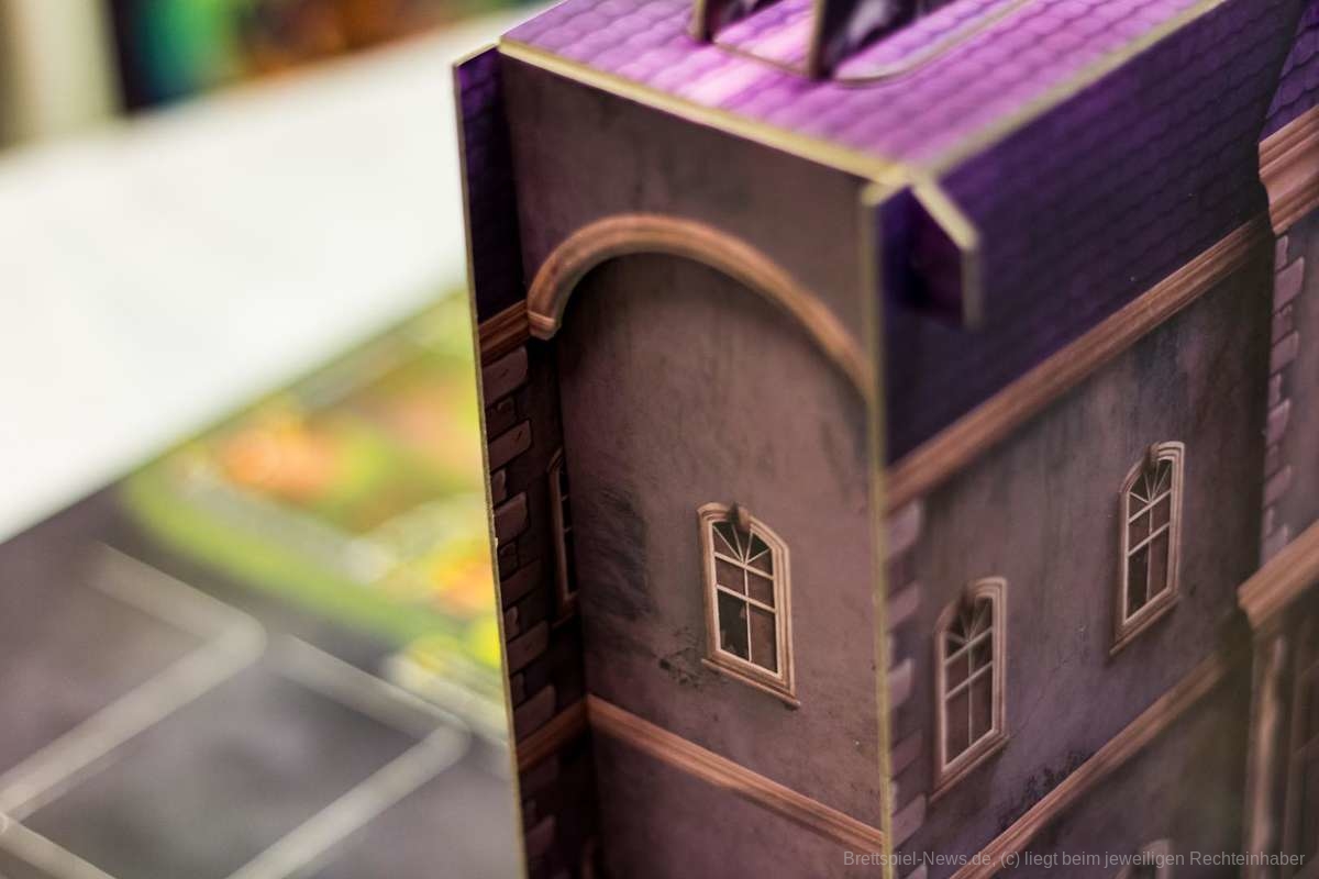 Zusätzlich bietet die Villa einen Sichtschutz, wodurch das Spiel sehr innovative Wege beschreitet. Darüber hinaus fungiert sie auch noch als Würfelturm. Das einzige Manko hierbei ist das Auf- und Abbauen. Nach einigen Partien sollte das jedoch auch schnell von der Hand gehen.