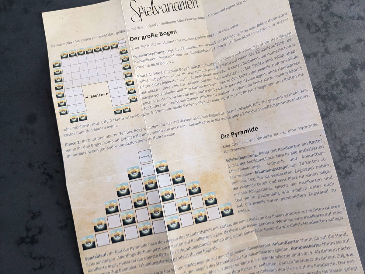 Die Basisanleitung und das Regelblatt zu den Spielvarianten sind gut strukturiert, mit einigen Beispielen ausgestattet und ermöglichen so einen einfachen Einstieg in das Spiel. Viele Regeln gibt es nicht zu beachten, daher kann direkt losgespielt werden. Auch wenn das Regelwerk überschaubar ist, wird "In aller Ruhe“ an einigen Stellen knifflig. Da wir unsere Karten, ohne miteinander zu kommunizieren, ausspielen und evtl. Karten verdeckt abwerfen müssen, kann es hier schnell zu unlösbaren Situationen kommen und das Spiel ist verloren. Liegen beispielsweise die Karten mit den Ziffern 35 und 37 mit einer Lücke dazwischen aus und die 36 ist von einem Mitreisenden bereits abgeworfen worden, kann diese Lücke nicht mehr von einer Karte gefüllt werden und wir stranden auf hoher See.