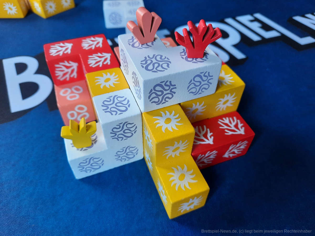 „Coral“ hat mich an meine Zeit mit „Hive“ erinnert, das ich manchmal mehrere Stunden mit einem Freund gespielt habe und dem ich einen ähnlichen Charakter zuschreibe. Es erfordert raffinierte Züge und man muss schon mit Tricks arbeiten, um ans Ziel zu kommen. Ähnlich wie „Hive“ lässt sich auch „Coral“ exzellent zu zweit spielen. Bei „Coral“ kommt noch die tolle Haptik und die schöne Tisch-Präsenz dazu. Die dicken Holzteile sind schön griffig und im Laufe des Spiels kann ein wirklich schicker Turm entstehen. Das Einsetzen der Korallensteine erfordert etwas Fingerspitzengefühl, macht Spaß und lockert das Ganze gut auf, sofern ohne Strafen bei heruntergefallen Teilen gespielt wird.