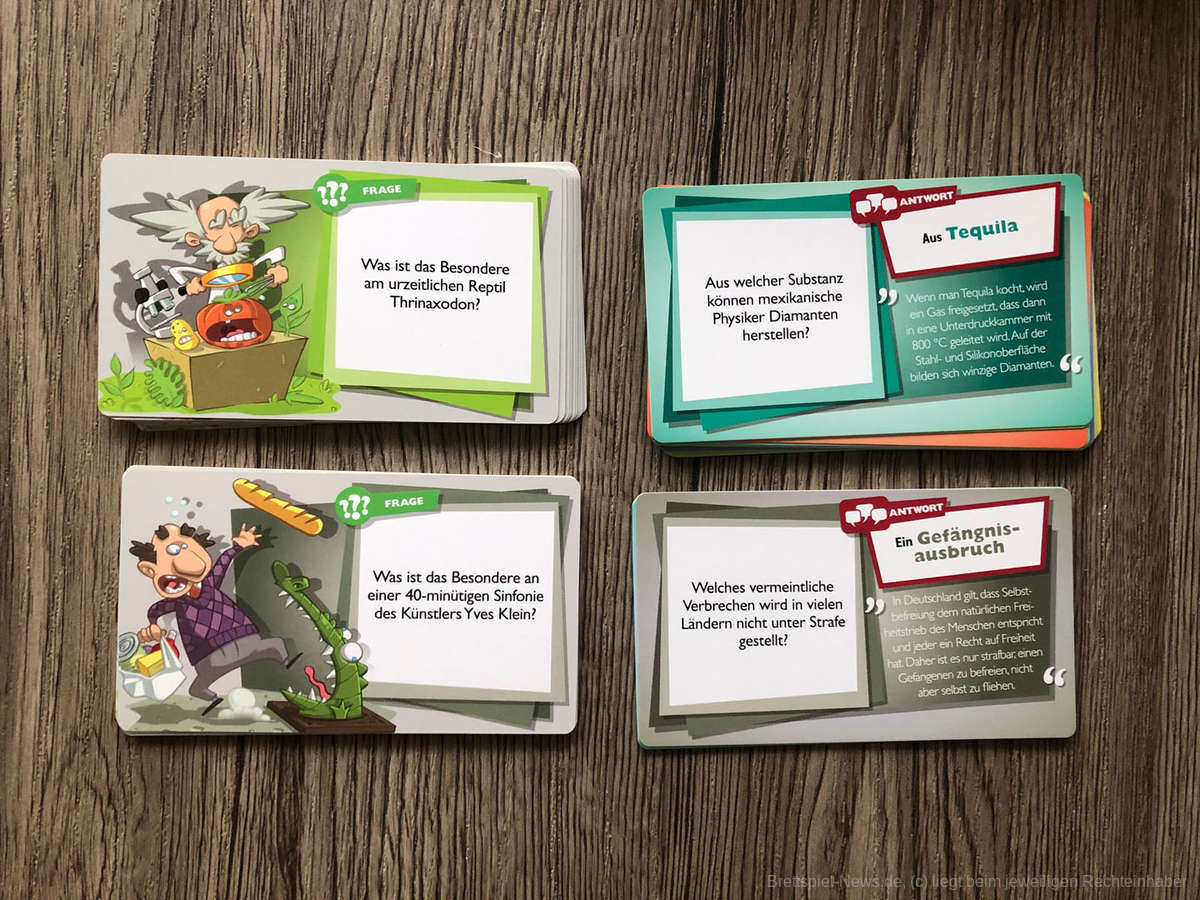 In der Rolle des Fuchses sieht es daher auch schon anders aus. Hier müssen die grauen Zellen angestrengt werden, um eine glaubwürdige, aber auch skurrile Antwort liefern zu können. Ja richtig gelesen - skurril. Denn auch die Antworten auf die Fragen sind alles anderes als einfach herzuleiten. Diese interessanten Fakten inklusive lustiger Illustrationen lassen einen die ein oder andere Runde schmunzeln. Leider war dies bei uns in den Runden auch der einzige Spaßfaktor. Auch wenn die Fakten teils ganz interessant sind, ist die Spielmechanik nichts neues. Es gibt einige Quizspiele, bei denen unter Höchstgeschwindigkeit geblufft werden muss, bzw. sich sehr schnell eine neue Antwort/ Aussage zurechtgelegt werden muss.