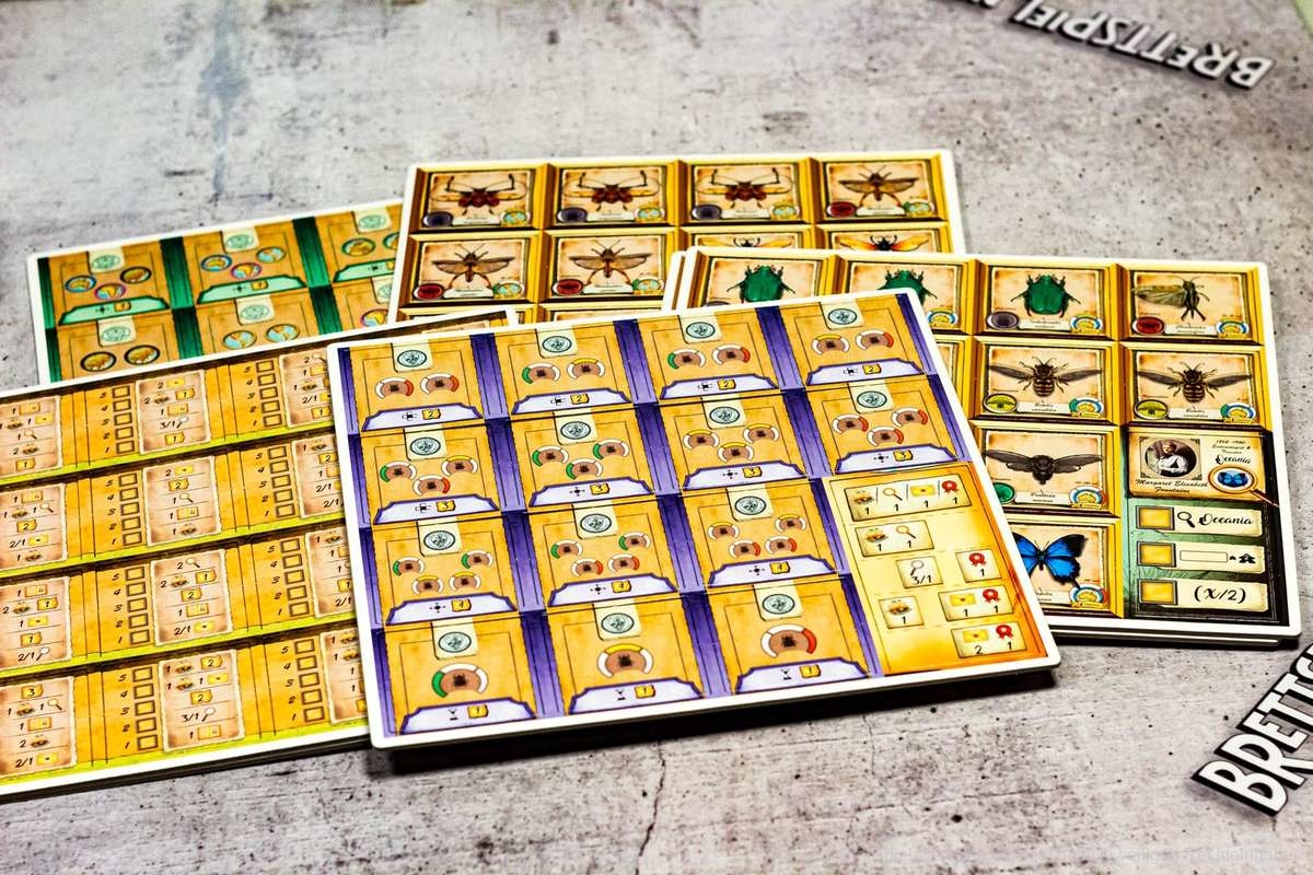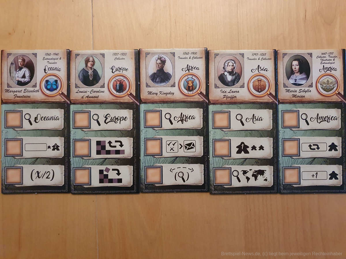 Zwei bis vier Personen übernehmen jeweils die Rolle einer der insgesamt fünf zur Verfügung stehenden Insekten-Forscherinnen und nehmen sich das passende Charakter-Tableau. Auf dem Tableau ist angegeben, auf welchem Kontinent diese Forscherin das Spiel startet (z.B. Asien).