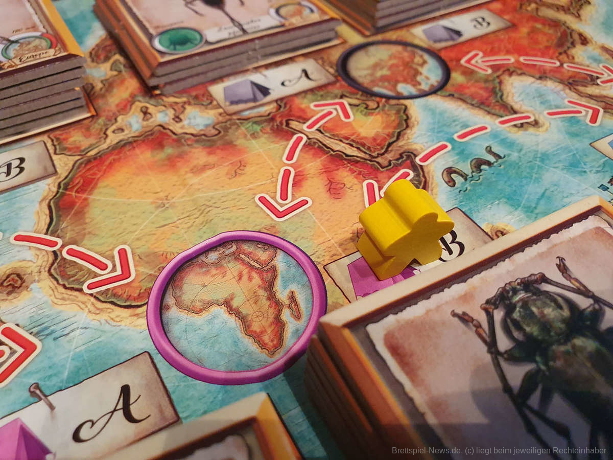 Reisen (Boot-Symbol) – jeweils einen Schritt auf dem Spielplan von Camp A zu Camp B oder entlang der Linien auf einen anderen Kontinent ziehen.