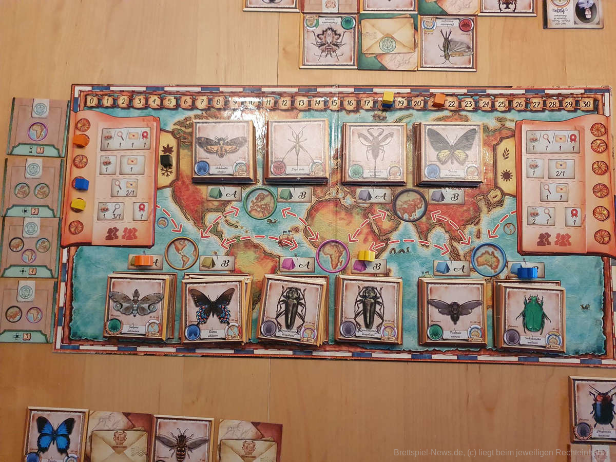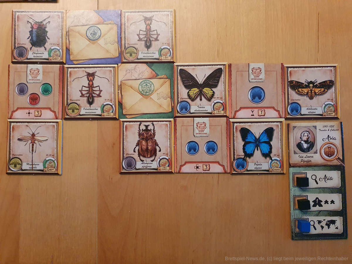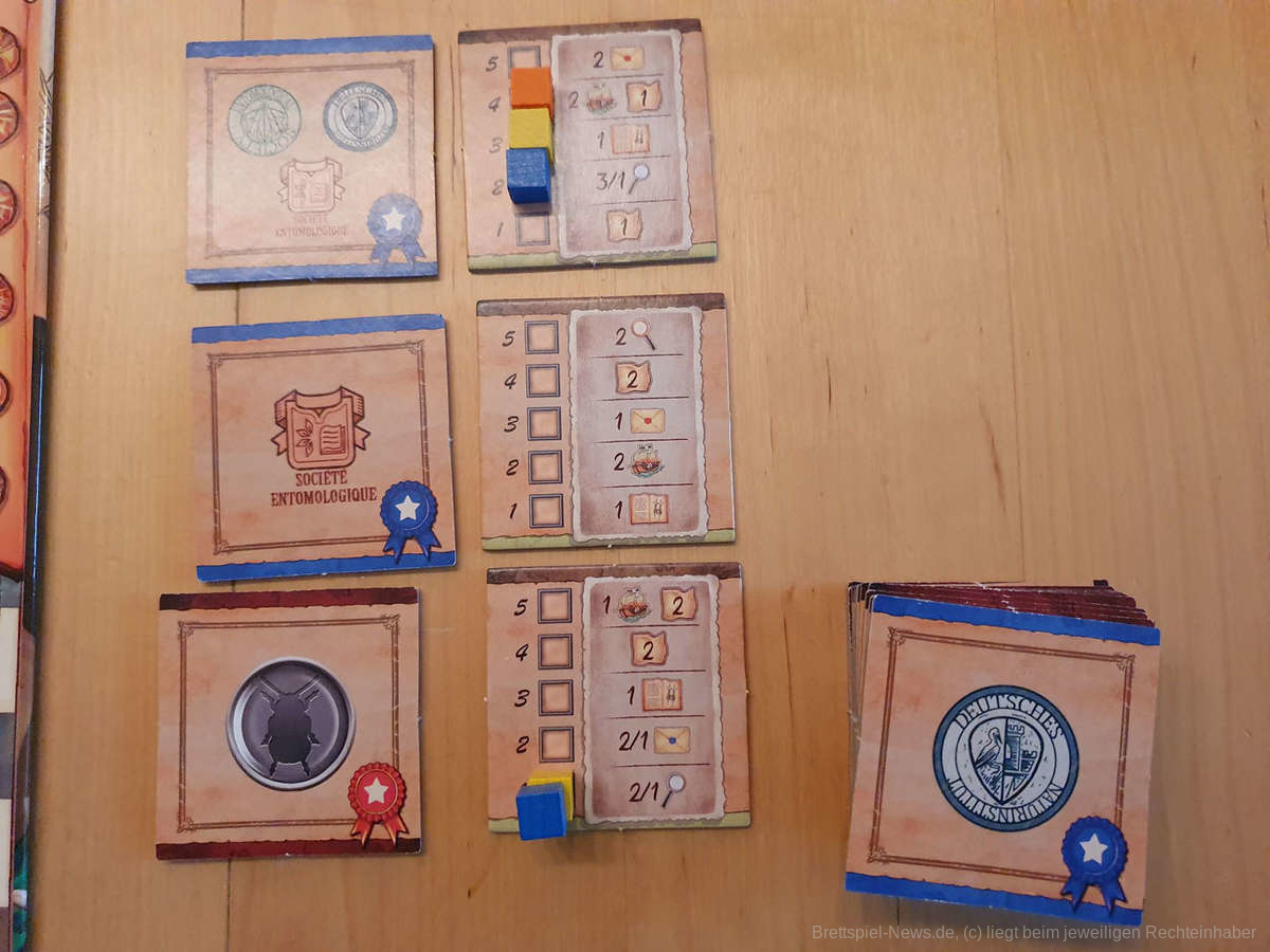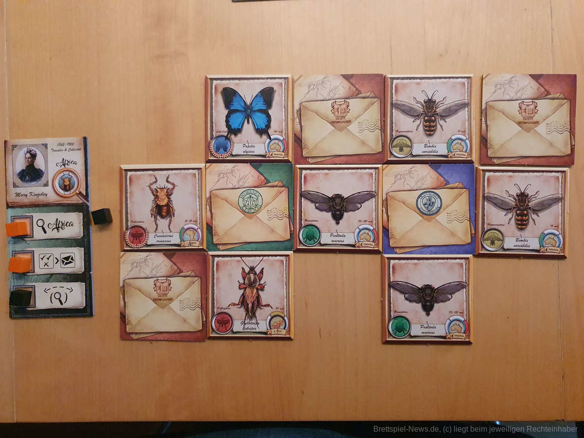 Mit den aufgenommenen Insekten- und Aufgaben-Plättchen gilt es nun, eine eigene Sammlung aufzubauen, die nach Möglichkeit die Anforderungen der eigenen Aufträge und der allgemein ausliegenden Medaillen-Plättchen erfüllt.