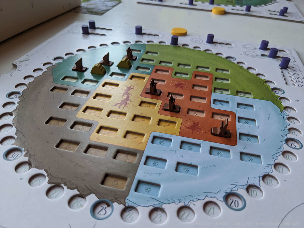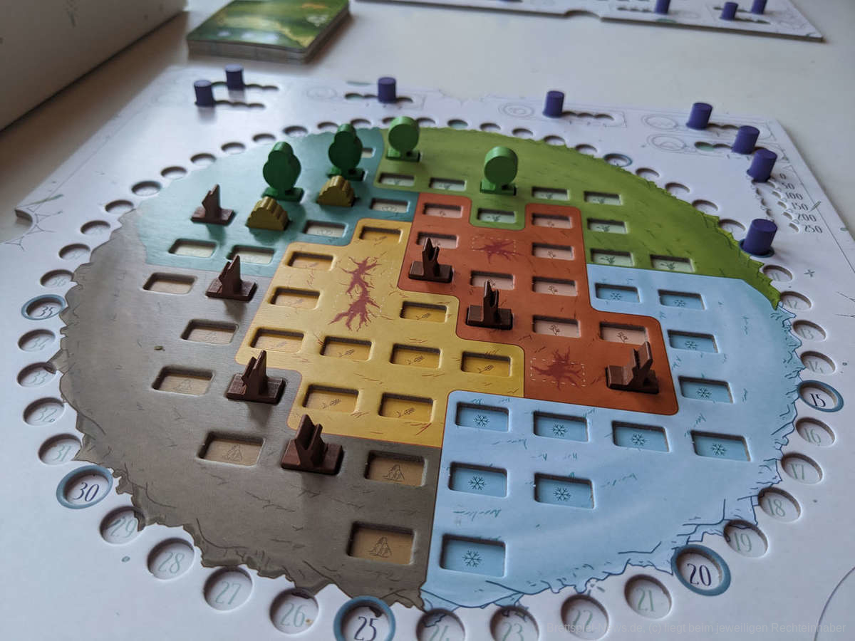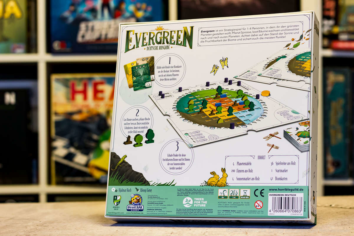 Die Planeten-Tableaus bei Evergreen sind sehr gut gelungen, besonders schön sind die Aussparungen für die Bäume. Auch wenn es trotzdem motorischen Geschicks bedarf, die Bäume so aufzustellen, dass sie nicht umfallen. Das Tableau enthält außerdem alle weiteren Aktionen, Runden- und Punktezähler bis 250 Punkte. Es ist auffallend gut gestaltet, so ein vollständiges Tableau wäre für viele andere Spiele auch oft wünschenswert.