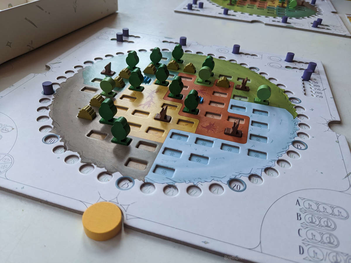 Ein weiterer Aspekt, der uns sehr gut gefallen hat, ist der Wertungsmechanismus. Da die Sonne jede Runde von einer anderen Seite auf unseren Wald scheint, ist hier geschicktes Anpflanzen und Wachstum der Bäume gefragt, denn größere Bäume geben zwar in der Rundenwertung mehr Punkte, verdecken aber möglicherweise auch Bäume, die im Schatten stehen.