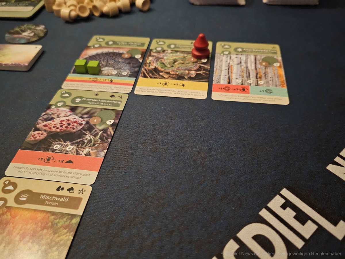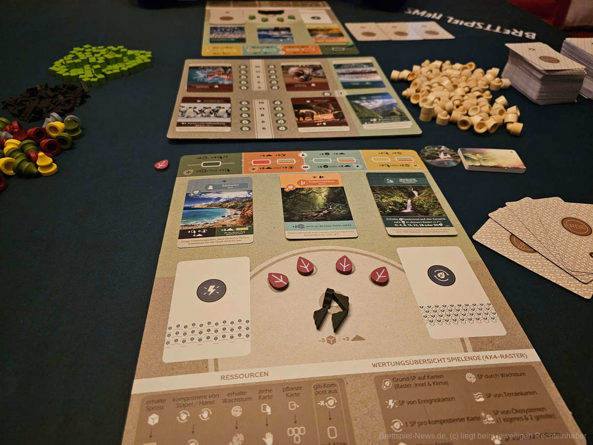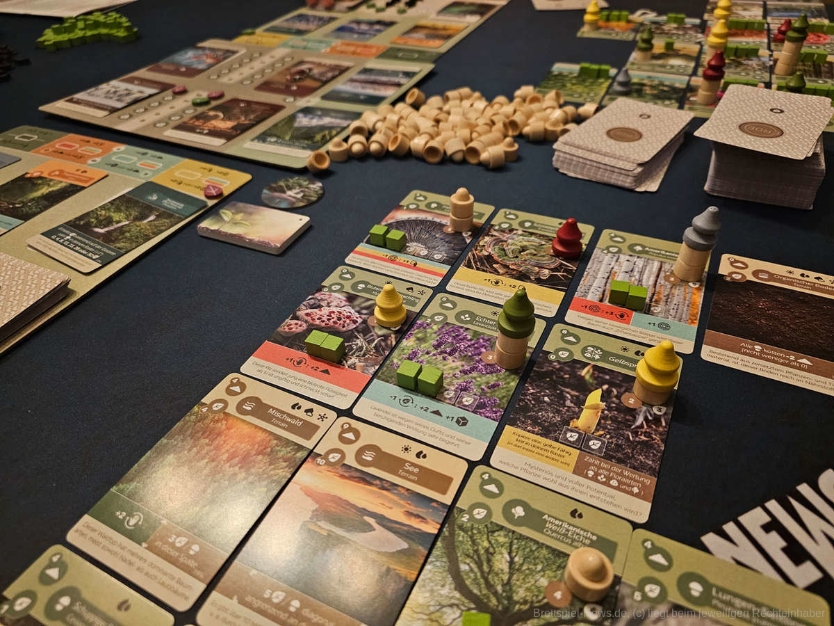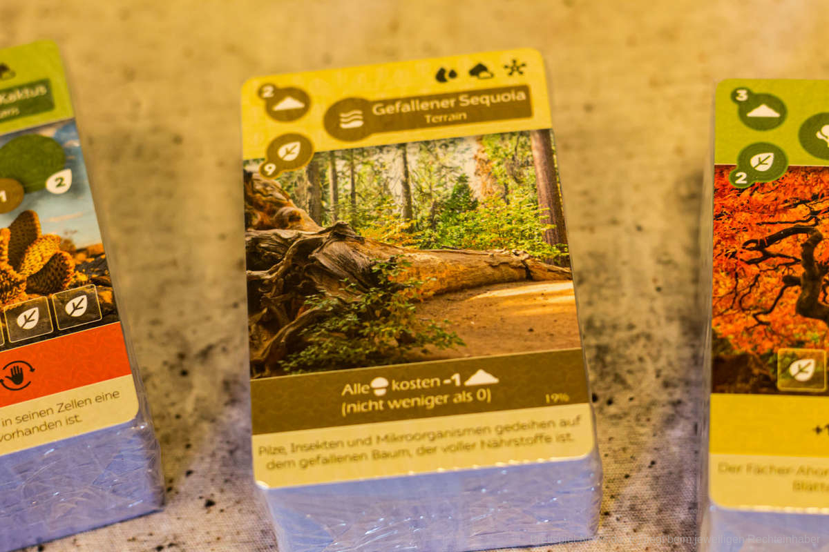 Besonders stark macht “Erde“ die vielen möglichen Kombinationen im Spiel. Durch die 360 Karten verfolgt “Erde“ einen ähnlichen Ansatz wie zuvor „Terraforming Mars“. Alle Karten sind einzigartig und ermöglichen immer wieder neue Möglichkeiten Siegpunkte zu sammeln und das eigene Raster aufzubauen. Auch der Aufbau der Spielzüge an sich hat uns gefallen. Natürlich ist “Erde“ ein recht solitäres Spiel, aber durch die permanente Möglichkeit am Spielzug teilzuhaben kommt keine Langeweile auf. Während meiner Spielrunde hatte ich zudem stetig den Drang auch auf meine Spielgruppe zu achten, um nicht versehentlich eine Aktion zu wählen, die den Anderen grade mehr nützt als mir oder um einen Überblick über ihre Strategien zu erhalten. Spielgruppen, die weniger von solitären Spielmechaniken angetan sind, werden sich hier aber wohl trotzdem schwer mit der Kernmechanik anfreunden können. Als Bonuspunkt fand ich als Pädagoge natürlich auch die kleinen Informationen zu den unterschiedlichen Pflanzen auf den Spielkarten super! Hier wurde kein Potential verschwendet!