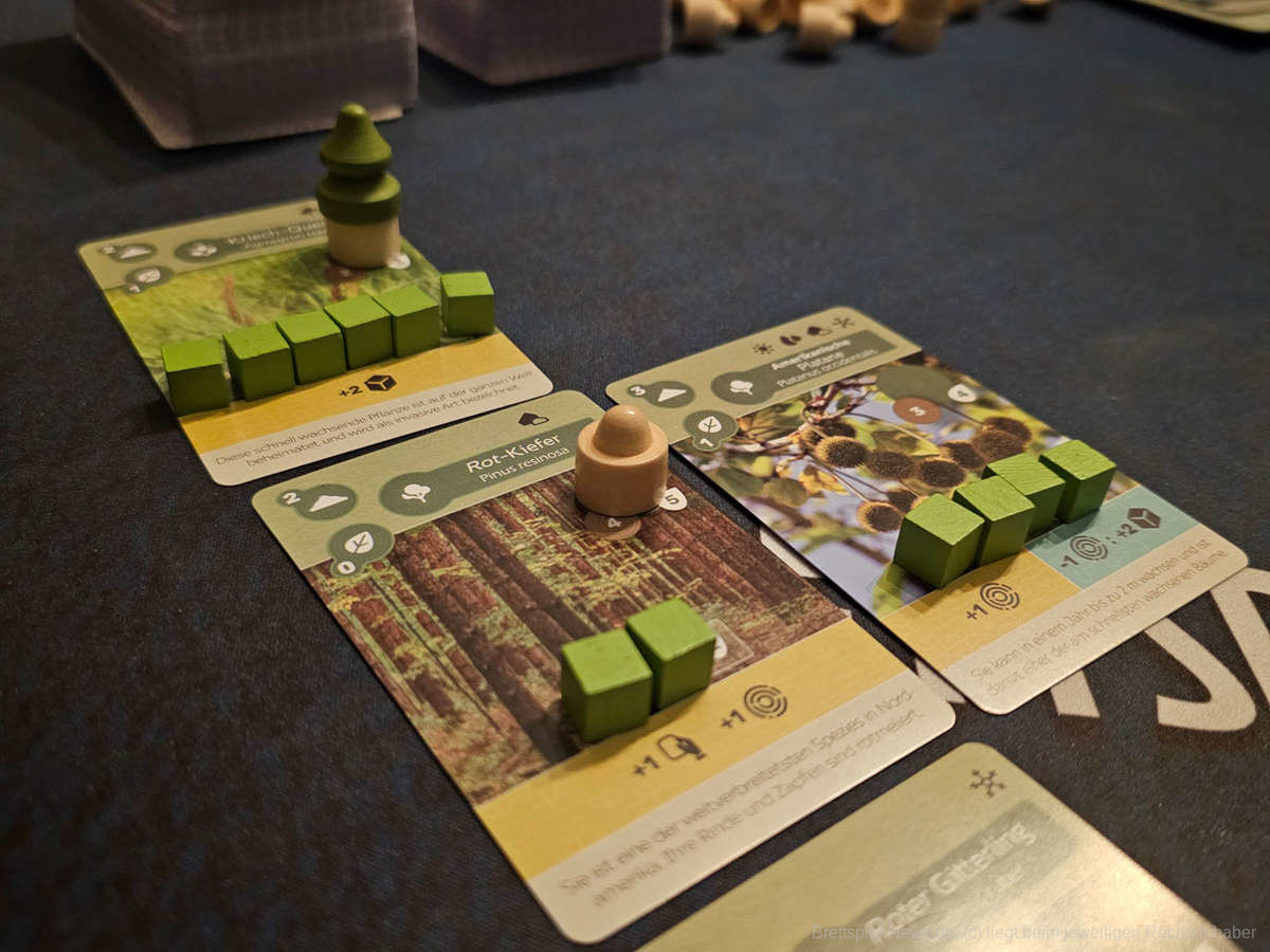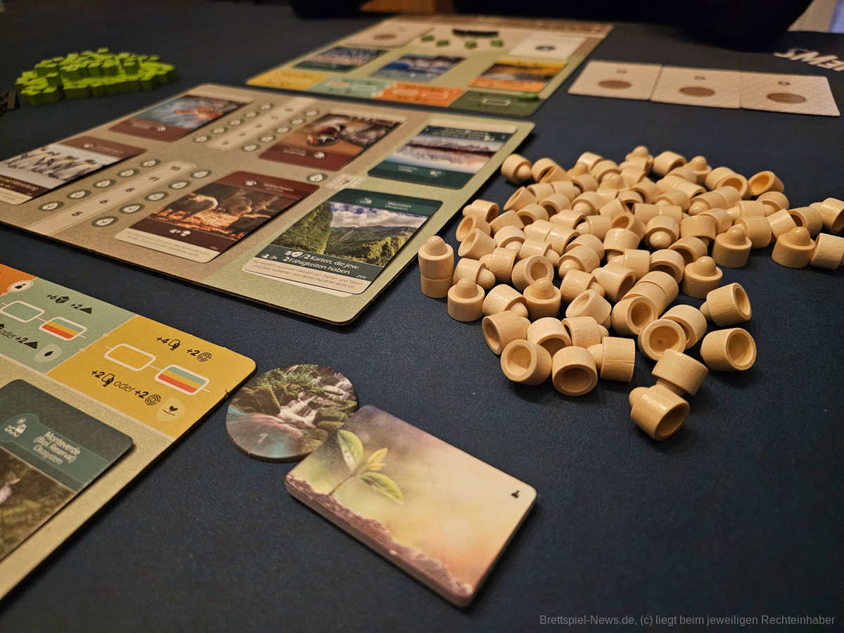 “Erde“ hat besonders durch seine Tischpräsenz innerhalb der letzten Wochen in der Community und auf bekannten Brettspiel-Seiten für einen gewissen Hype gesorgt und das nicht ganz unbegründet. “Erde“ sieht auf dem Spieltisch fantastisch aus und macht mit dem Spielmaterial unserem Planeten alle Ehre. Das Spiel verzichtet weitgehend auf Kunststoffteile und setzt viel auf bemaltes oder bedrucktes Holz, was besonders bei den kleinen „Bäumen“ gut zur Geltung kommt. Die werden nämlich gebraucht, um das Wachstum verschiedener Pflanzen anzuzeigen und sind damit meist über das gesamte Raster verstreut. Zusätzlich bieten sie mehr als „nur Optik“, da sie schnell auf einen Blick anzeigen, wie viele Punkte welche Person durch das eigene Pflanzenwachstum einstreichen wird.