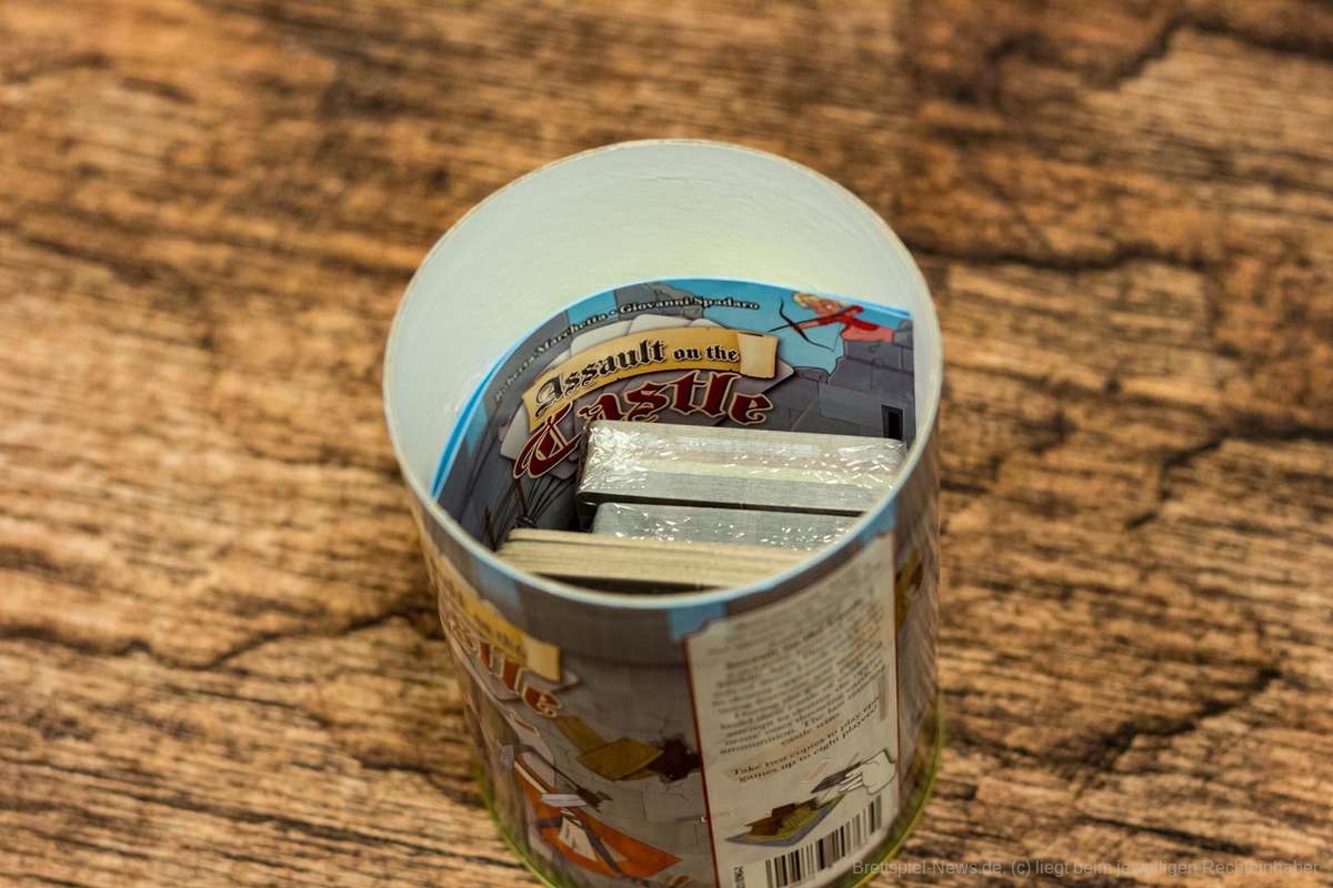 Wie die Spielbeschreibung schon vermuten lässt, ist ASSAULT ON THE CASTLE kein ausuferndes Spiel mit unterschiedlichsten Spielkomponenten und stundenlanger Spielzeit. Das Geschicklichkeitsspiel ist fordernd und spannend und schafft es, Klein und Groß in kürzester Zeit zu begeistern. Es ist in circa 15 bis 25 Minuten gespielt, wobei es sich bei vielen Fehlwürfen schnell langatmig anfühlt. Doch jeder Treffer wird mit Jubel gefeiert und mit mindestens einem Racheblick gekontert.
