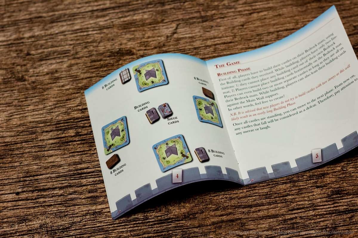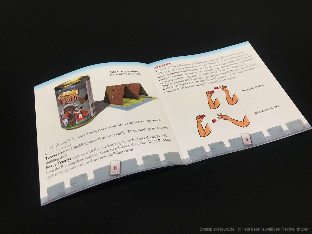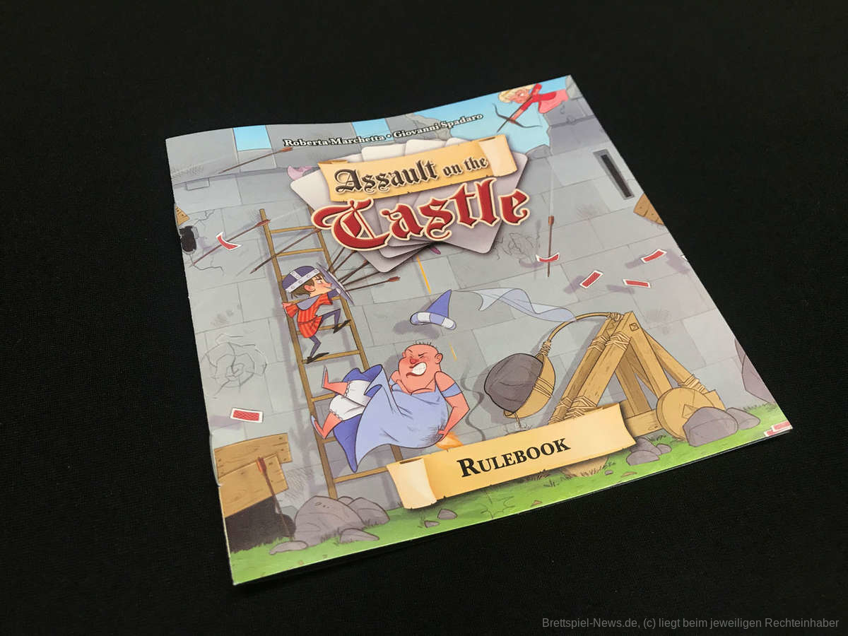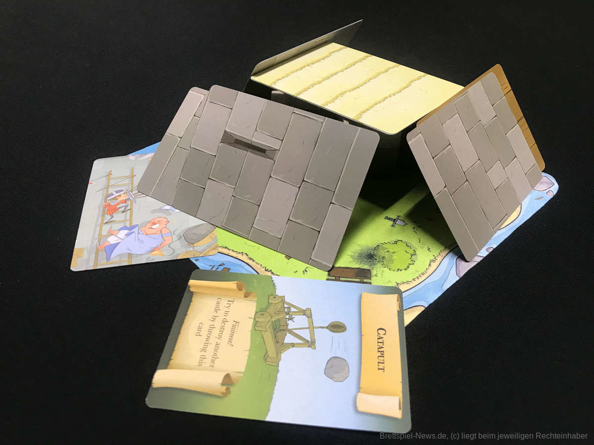 ASSAULT ON THE CASTLE hat nur wenige und sehr leichte Regeln. So ist das englische Regelwerk schnell gelesen und nach weniger als fünf Minuten Regelstudium kann das Spiel beginnen. Die insgesamt 55 Aktionskarten haben jeweils einen kurzen englischen Text, der ihren Effekt erklärt. Die Mehrzahl der Karten sind Katapult- (28) und Trebuchet-Karten (15). Von den restlichen sechs verschiedenen Aktionskarten gibt es jeweils nur zwei. Wildes Kartenwerfen quer über den Tisch ist also das Hauptprogramm. Das Spielmaterial ist in einem lustigen Comicstil illustriert.