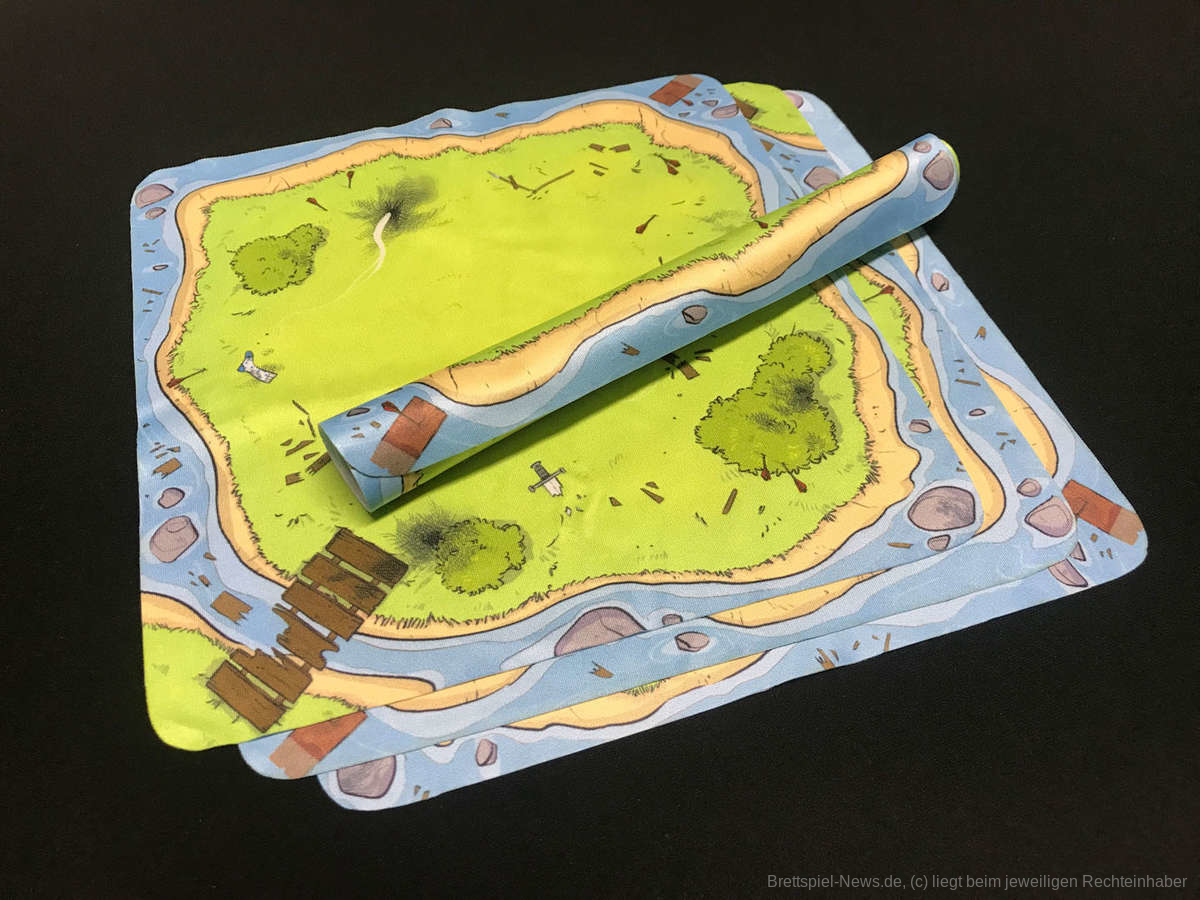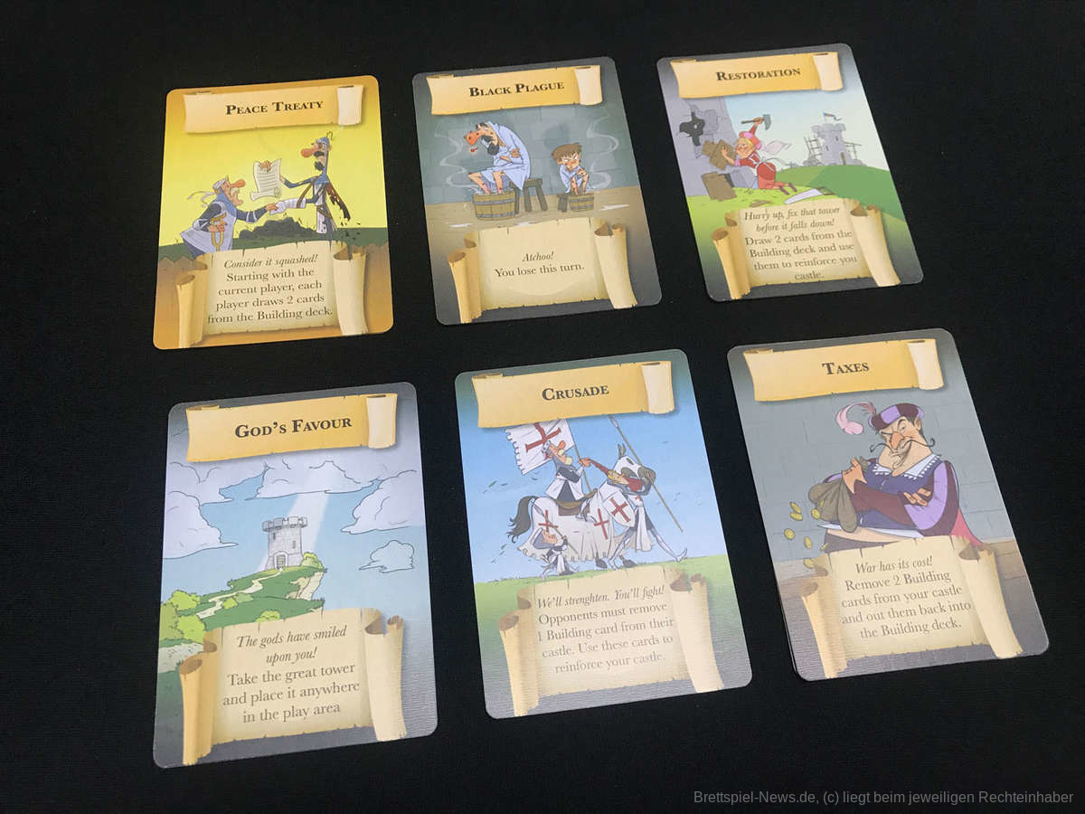 Die Spielkarten und das übrige Spielmaterial sind von guter Qualität. Vielleicht könnten die Karten etwas robuster sein, da sie oft auf dem Boden landen oder als Teil der Burg beschossen werden. Witzig ist, dass die Spielverpackung selbst zum Teil des Spiels wird. Mit der Aktionskarte "Göttliche Gunst" kann der Zylinder als Wehrturm zur Absicherung der Burg eingesetzt werden.