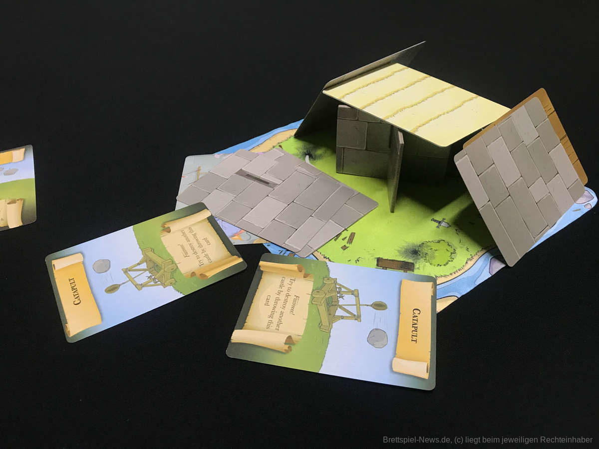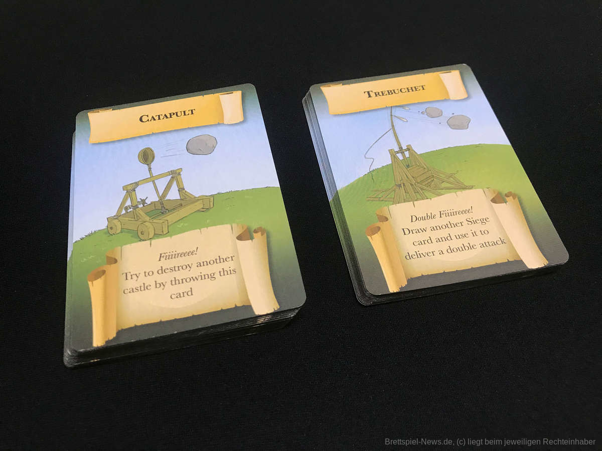 Ein kühler Wind weht um die Burgmauern. Kaum haben wir unsere Verteidigungsanlagen fertiggestellt, werden wir auch schon angegriffen. Doch statt Horden von Kriegern, die unsere Burg stürmen, werden wir von Katapulten und Trebuchets beschossen. Und zu guter Letzt fliegen statt Steine Spielkarten durch die Luft. Es ist aber auch ein Kreuz mit diesen Rittern. Wie der Angriff auf Burgen sich spielt, schauen wir uns jetzt genauer an.