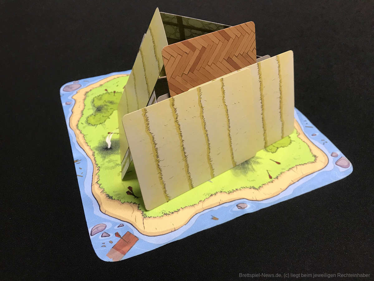 Das Spiel beginnt mit der Bauphase, in der wir alle gleichzeitig auf der Spielmatte unsere individuelle Burg bzw. unser Kartenhaus errichten. Die einzige Regel hierbei ist, das Karten nicht flach auf die Spielmatte gelegt werden dürfen. Ansonsten sind der Kreativität keine Grenzen gesetzt. Wenn alle Spielenden fertig gebaut haben, geht es in die nächste Phase.