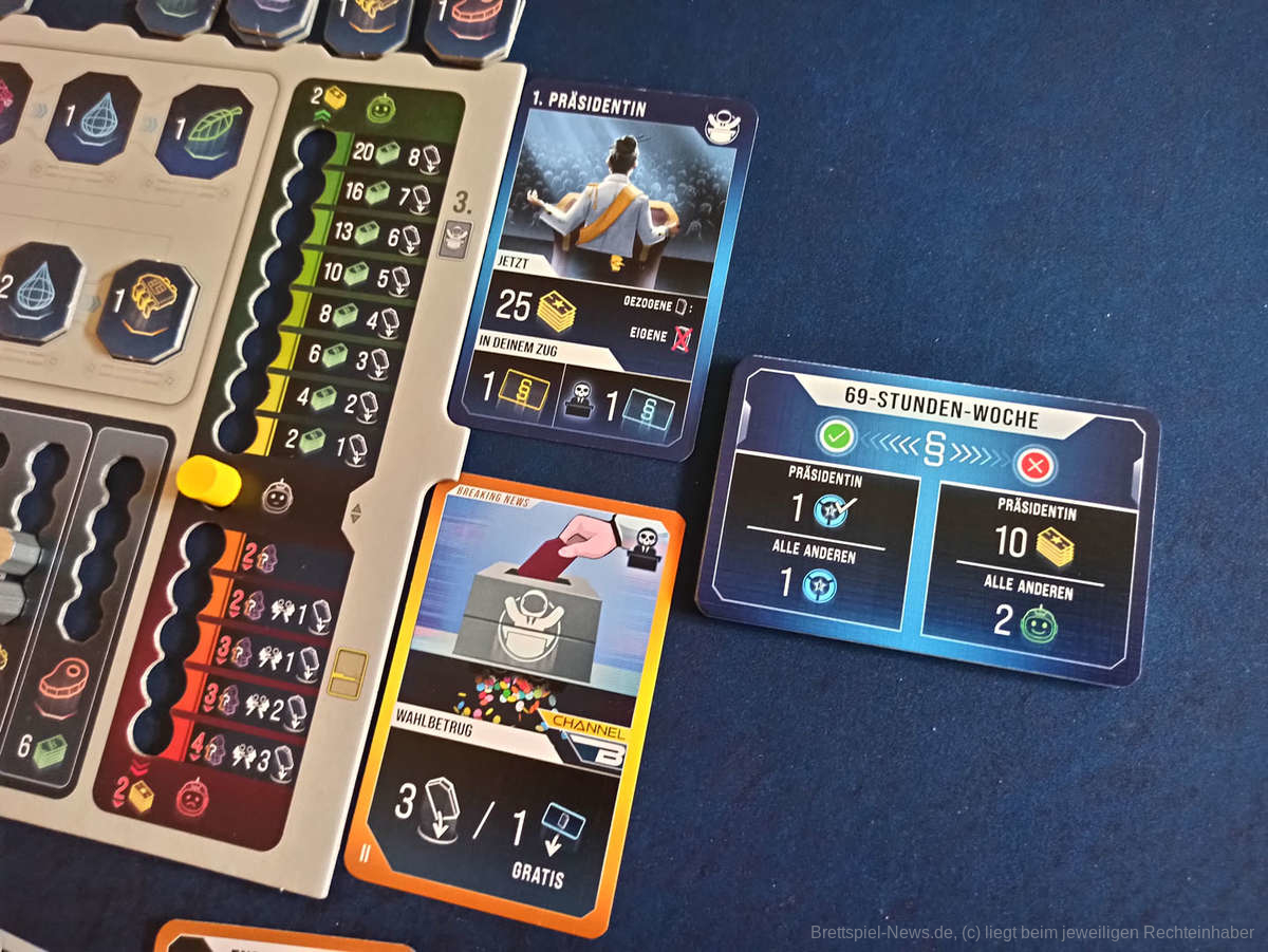 Die Präsidentin hat zudem in jedem Zug die Möglichkeit sich für oder gegen ein Gesetz einzusetzen. Auch hier werden allerhand aktuelle Themen, wie Recycling, Meinungsfreiheit, Kohleausstieg, Ehe für alle, und vieles mehr aufgegriffen. Wird beispielsweise die Gesetzeskarte „Reichensteuer“ gespielt und die Präsidentin entscheidet sich dafür, dann erhält sie 15 Billies und alle anderen erhalten fünf Billies, entscheidet sie sich dagegen, sinkt bei ihr die Stimmung um zwei Schritt, aber dafür erhält sie zehn Siegpunkte. Diese Anspielung auf die moralische Gesinnung zieht sich durch das ganz Spiel und unterstreicht den Humor auf den gut gestalteten Gebäude-, Breaking-News und Gesetzes Karten.