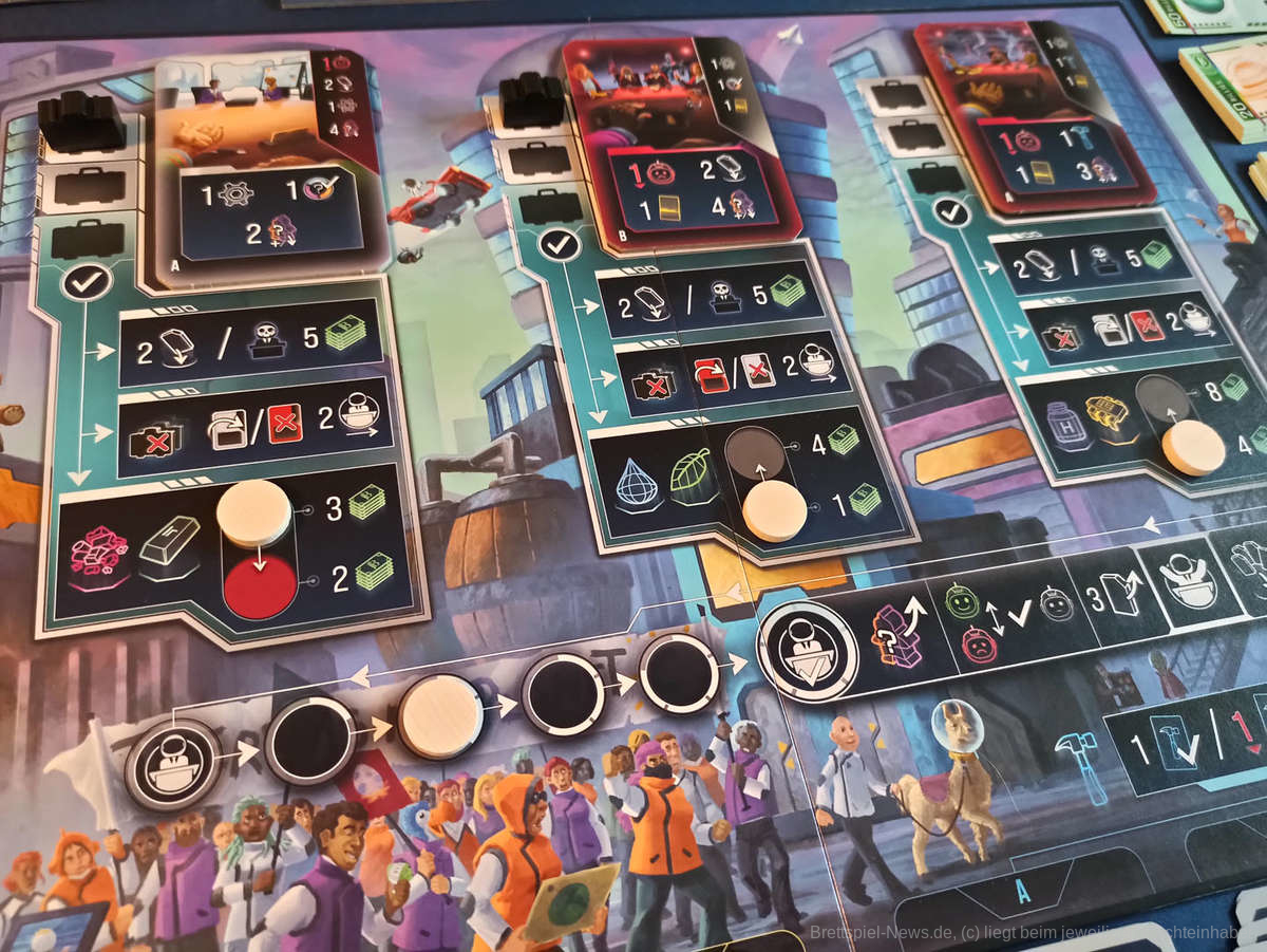 Wem das Thema und der Humor zusagt, hat bei einer Partie von „Planet B“ ein wunderbares Arbeiter-Einsetz-Spiel mit Engine-Building Element und sehr vielen Möglichkeiten auf dem Tisch.