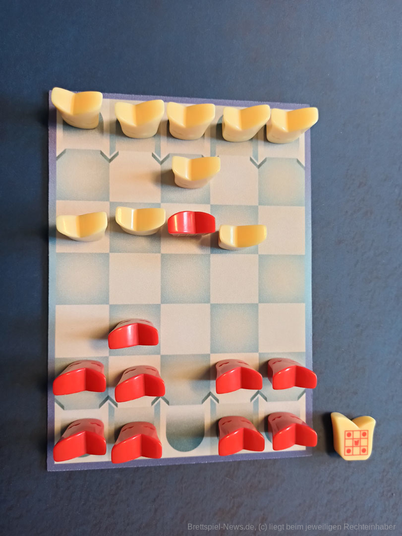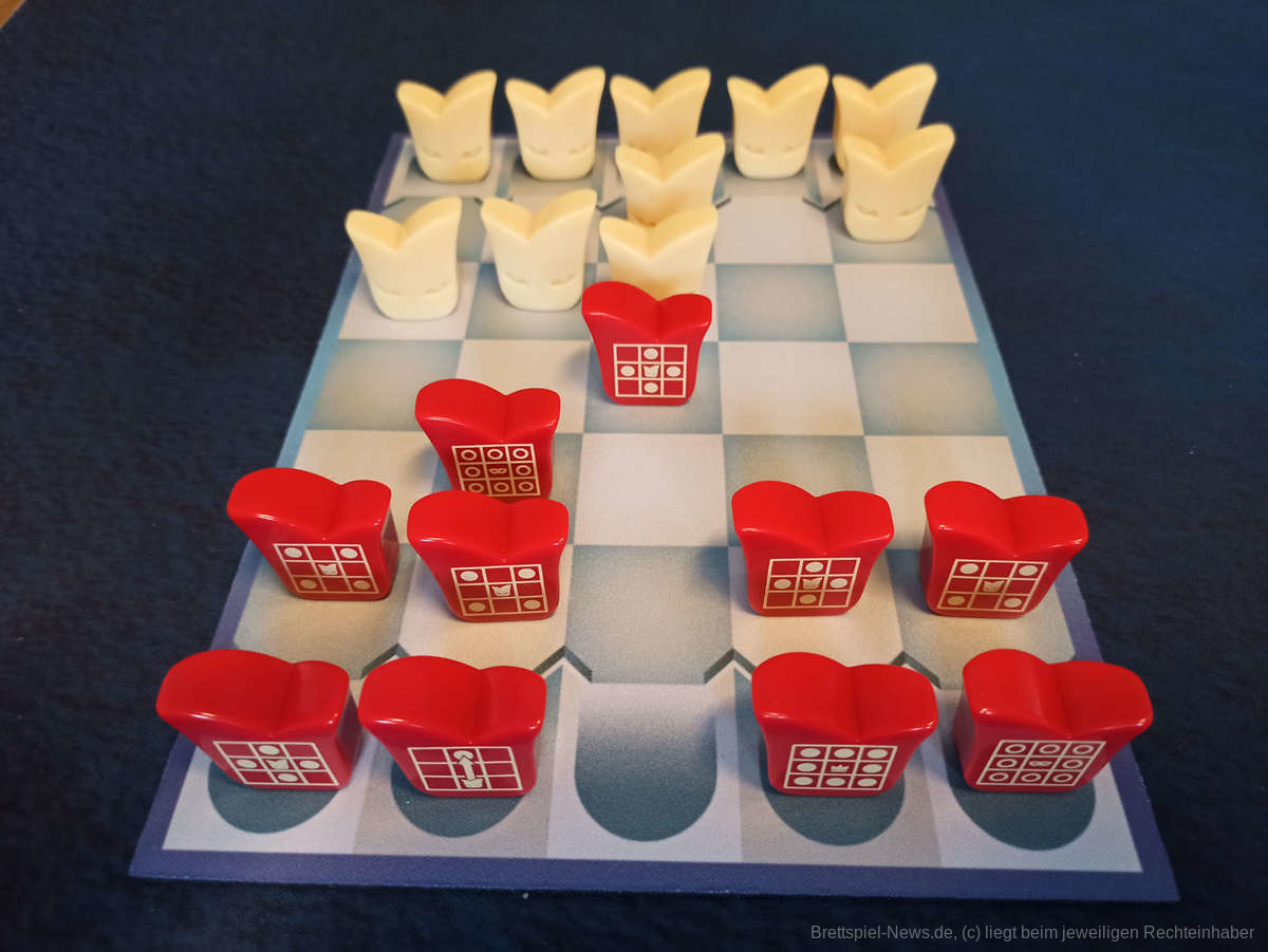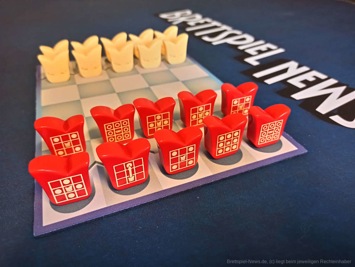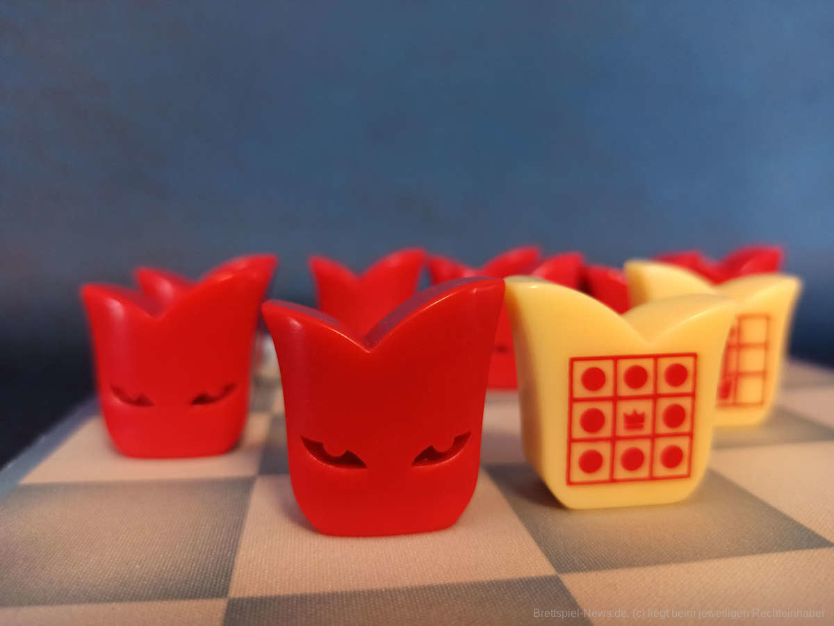 Damit sind wir bereits mitten im Spiel: Es geht um Bluff und mutige Züge, stets bedacht, die andere Seite in die Irre zu führen und selbst die Täuschungen zu erkennen. Da nur der Anwärter und die beiden Hofdamen sich sowohl orthogonal und diagonal fortbewegen können, lassen diese sich natürlich besser identifizieren, sobald bei der Bewegung von mehr als einer Achse Gebrauch gemacht wird. Der Analyse der Züge der anderen Partei kommt somit eine wichtige Bedeutung zu. Gleichzeitig gilt es einzuschätzen, wie auf einen eigenen Zug reagiert wird und ob die gegnerische Seite es wagen wird, die angebotene Figur aus dem Spiel zu nehmen.