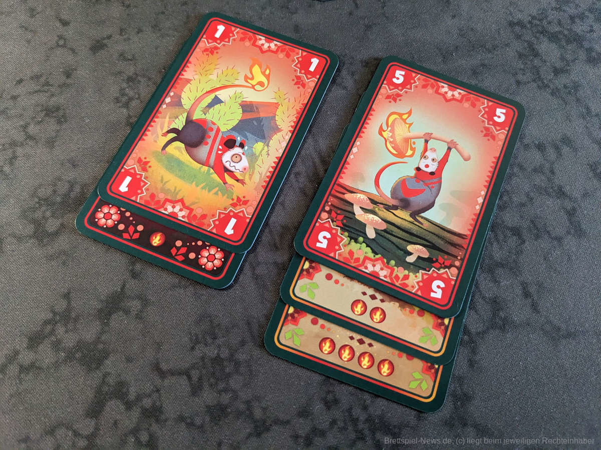 In den ersten Partien wirkt “Tails on Fire” wie ein völlig zufälliges Glücksspiel, nach einigen Partien merkt man jedoch, dass hinter dem unscheinbar wirkenden Spiel doch ein wenig mehr steckt. Durch Taktieren und vor allem durch das Beobachten der Karten der anderen ist es sehr gut möglich, Züge zu planen und auch seine eigenen ausliegenden Karten zu verteidigen. Liegt beispielsweise eine sechs mit Feuer vor mir aus, werde ich versuchen immer eine sieben mitzunehmen, um zu verhindern, dass die anderen Personen mir meine sechs abnehmen können. Auch die erschöpften Karten, die in der nächsten Runde nicht gespielt werden können, sind offene Informationen und sehr wichtig, wenn ich meine Kartenhand für die aktuelle Runde zusammenstelle. Je mehr Personen in einer Partie mitspielen, desto chaotischer und unplanbarer wird das Spiel, aber meist steigt dadurch auch die Stimmung am Tisch.