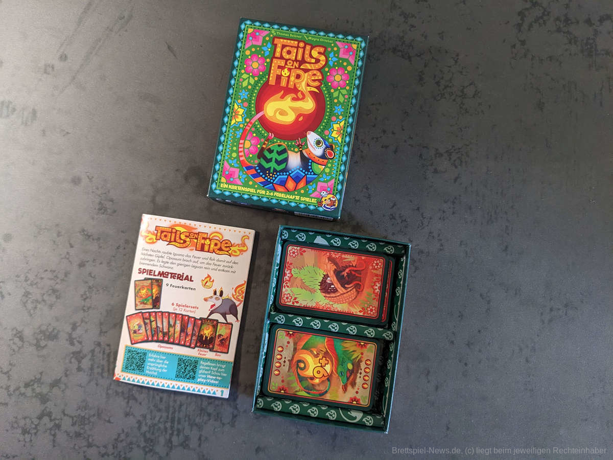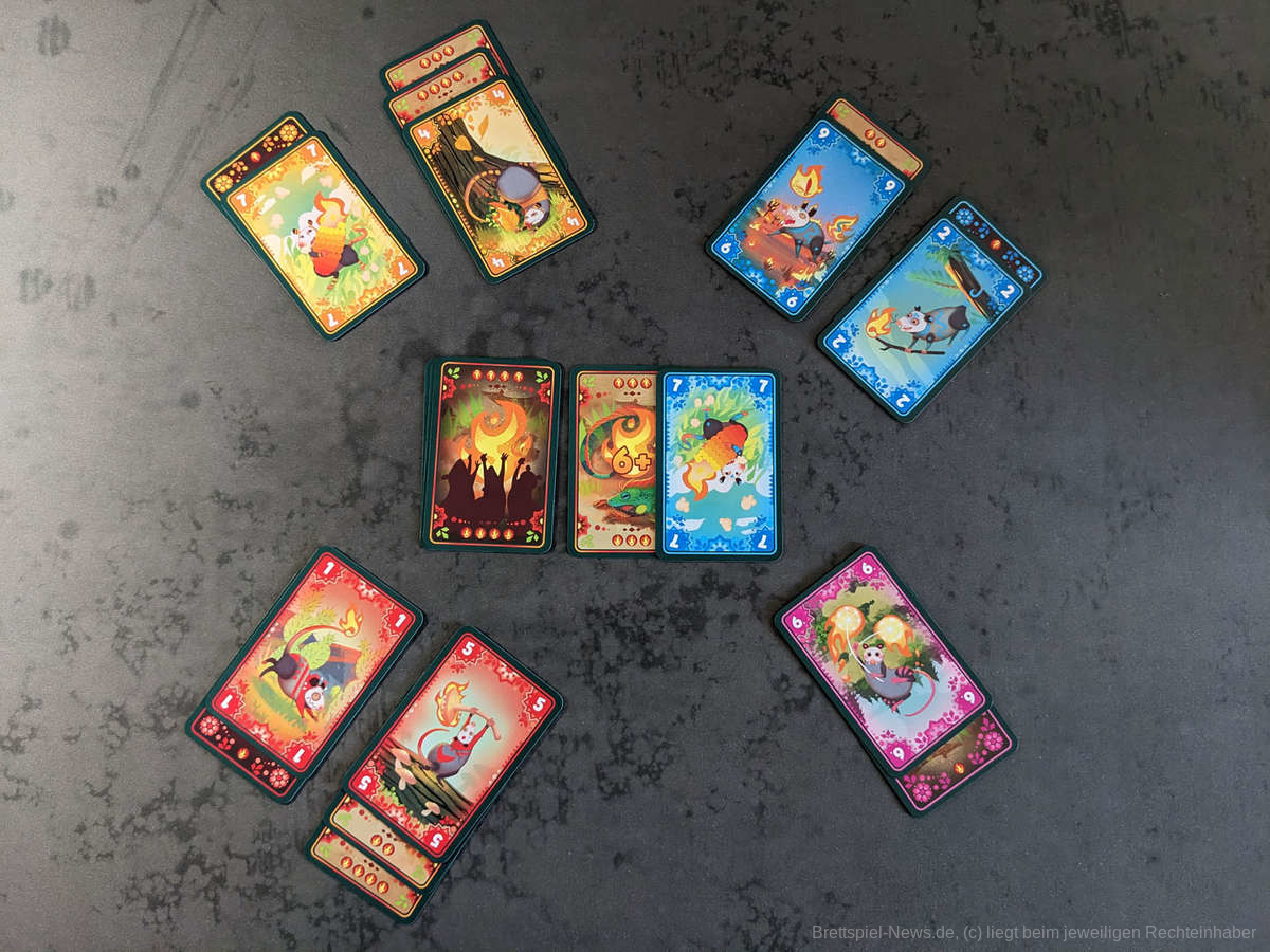 Die Stärken des kleinen Kartenspiels liegen vor allem in einer Partie ab vier Personen. Für das Spiel zu zweit oder zu dritt gibt es zwar abgeänderte Regeln, trotzdem konnte "Tails on Fire“ hierbei nicht bei uns punkten. Der eingesetzte Automa (Die Wilden) ist zwar sehr einfach zu steuern, bringt aber einen zusätzlichen Glücksfaktor ins Spiel, der uns leider nicht überzeugen konnte. Zusätzlich werden die Feuerkarten, die die Wilden gewinnen, komplett aus dem Spiel genommen und es ist später nicht mehr möglich diese zu stehlen, da diese in die Spielschachtel zurückgelegt werden. Hier geht ein großer Teil der Spannung leider verloren.