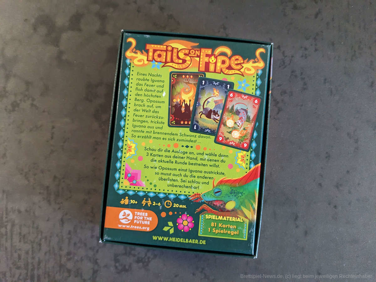 Insgesamt ist "Tails on Fire“ ein spannendes und optisch ansprechendes Kartenspiel, das bei uns bestimmt das ein oder andere Mal als Filler oder beim Besuch von Nichtspielenden auf den Tisch kommt und hoffentlich viele Menschen begeistern kann. Denn mit jedem verkauftem Exemplar von "Tails on Fire“ wird ein neuer Baum von Trees for the future in Kooperation mit Heidelbär Games gepflanzt.