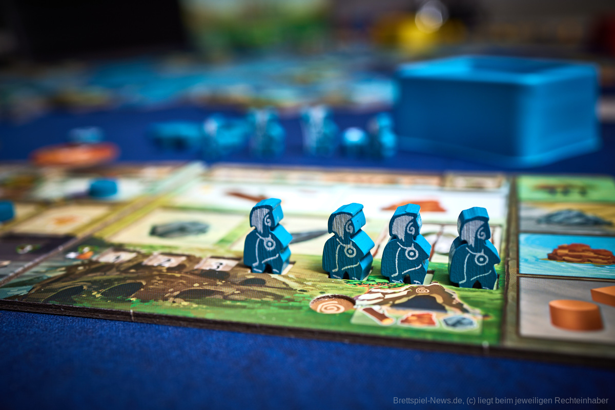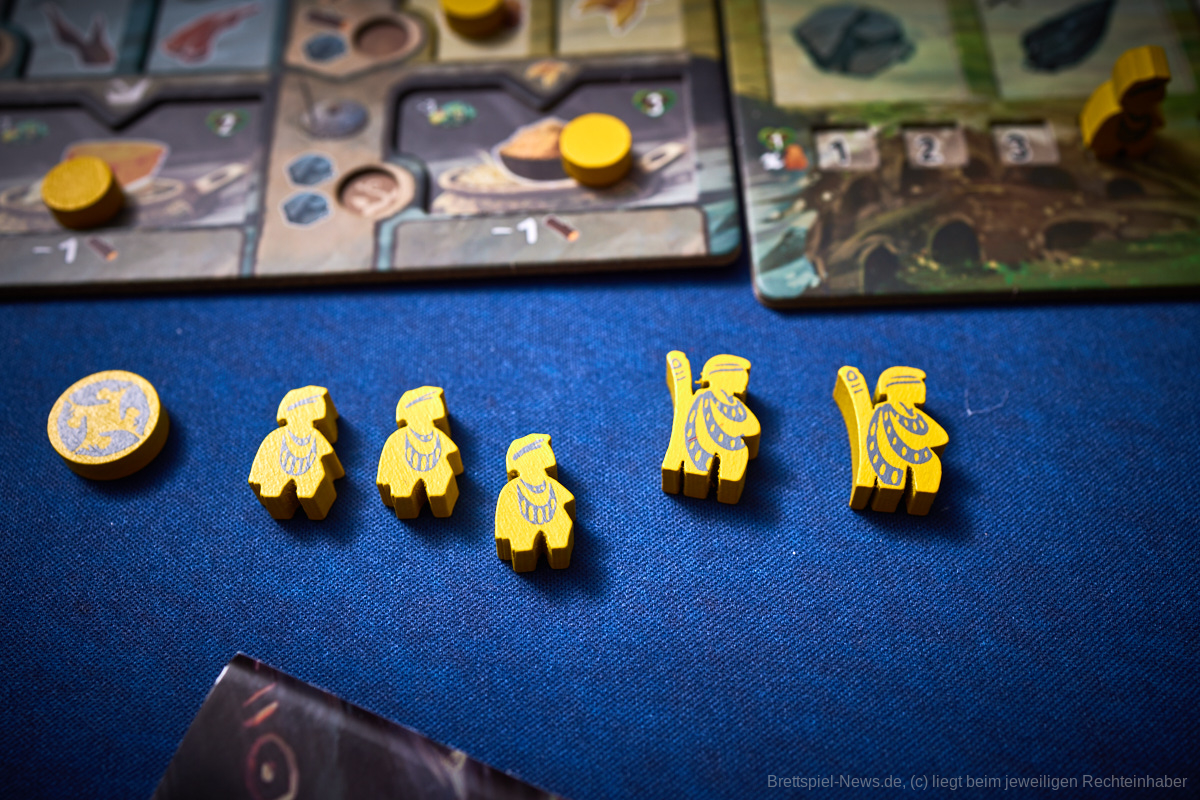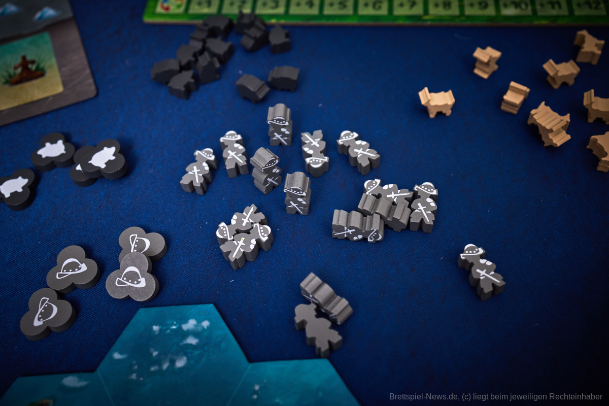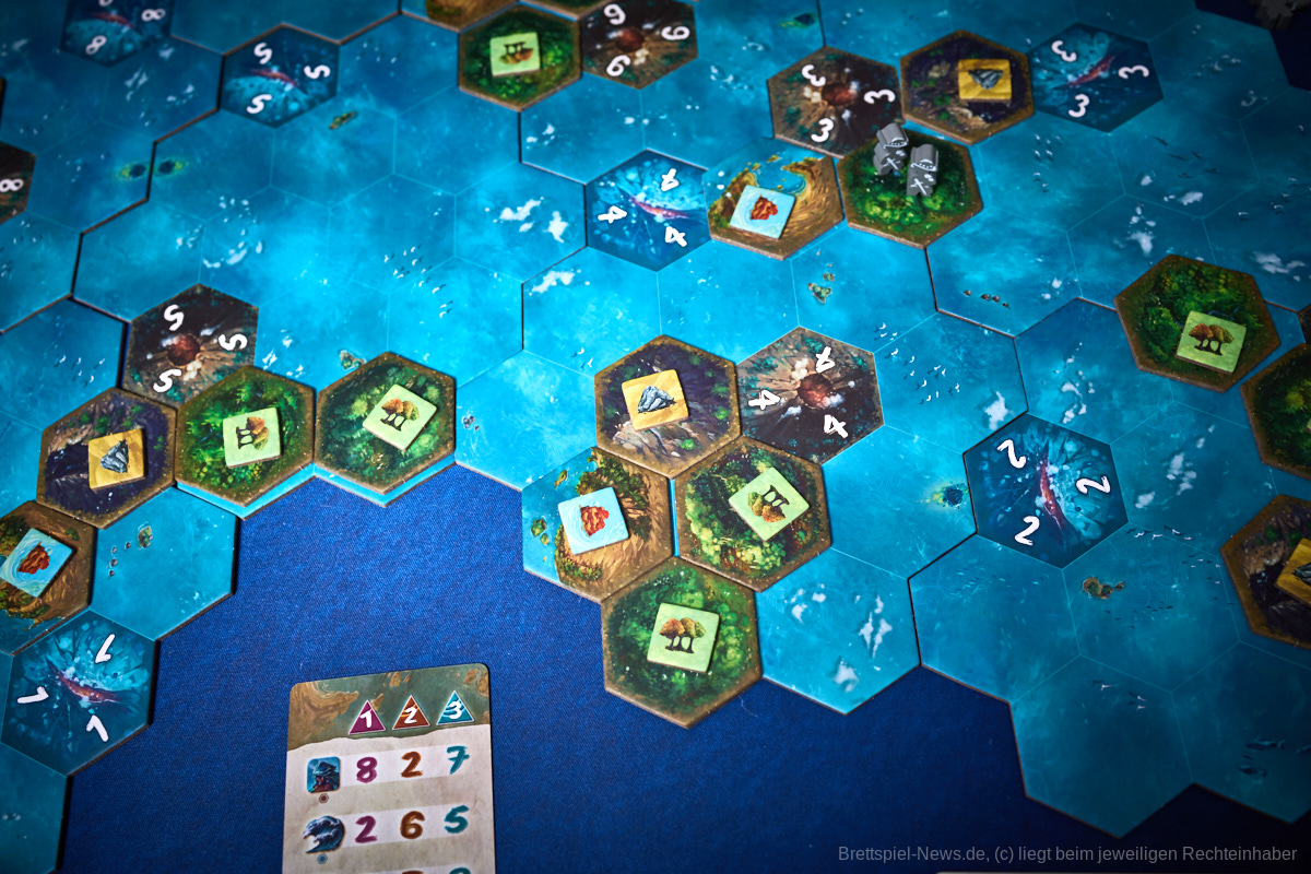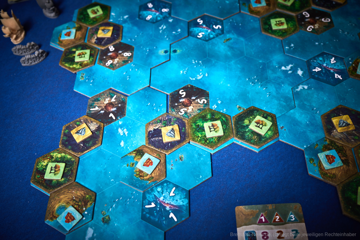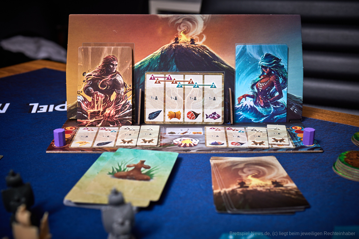 Besonders gefallen hat uns die Planbarkeit des Spielablaufes. Egal ob es die Katastrophen oder die Konquistadoren sind, alle wissen zu Beginn der Runde, was sie erwarten wird. Nur wenn sie in der Vorrunde nicht genug geplant haben kann es passieren, dass die Naturkatastrophen nicht bekanntgegeben werden, aber dennoch wissen alle, dass sie zumindest den Zorn der Götter niedrig halten sollten, um nicht zu riskieren, dass mit einem Mal das halbe Spielfeld untergeht. Genau das würde ich als Alleinstellungsmerkmal von „Tindaya“ bezeichnen. Die Spielgruppe muss sich absprechen, bzw. sich durchdacht gegenseitig im Weg stehen, um den eigenen Plan zu verwirklichen. Auch die Möglichkeit, dass sich das Spielfeld durch Vulkane oder Tsunamis dauerhaft verändert, kann damit in die eigene Planung mit eingebaut und nutzbar gemacht werden.