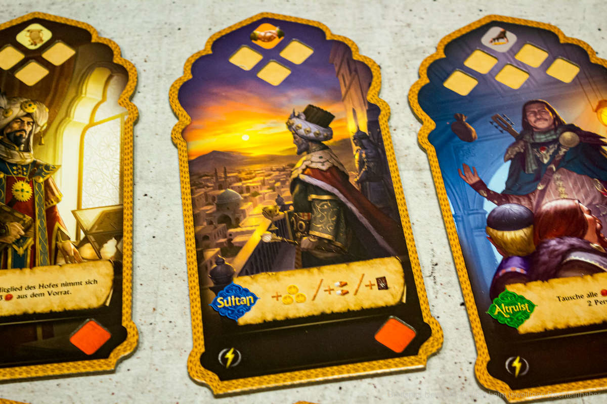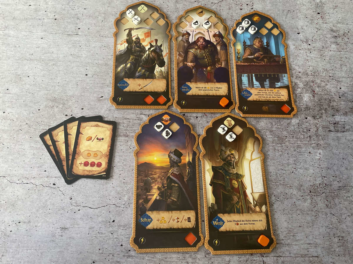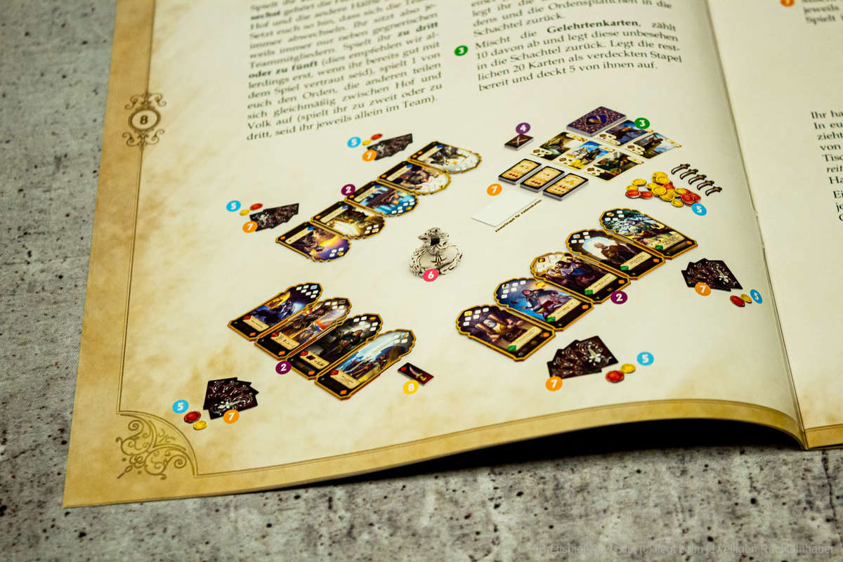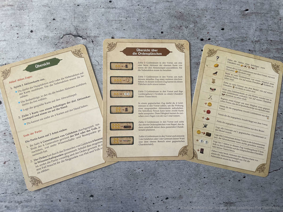 Gerade der Orden sah in unseren Partien wenig Land. Dessen Ziele sind gefühlt deutlich schwerer zu erreichen, dem zudem das Glück besonders hold sein muss. Denn es gibt nur den Weg über orangene Aktionssteine und die damit verbundene Aktivierung eines Charakters, um Gelehrte zu ermorden. Wurde ein solcher gezogen, muss sich im Vorrat dann zusätzlich noch die passende Menge Gold befinden und ein ebenfalls passender weißer Aktionsstein muss über eine andere Charakterkartenspezialfunktion gezogen werden. Da spielt mir persönlich das Glück eine deutlich zu große Rolle, was bei den anderen Fraktionen gefühlt weniger der Fall war.